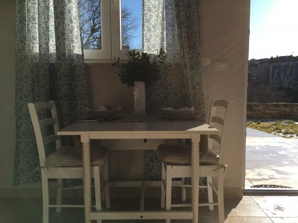 Apartmán Dulcis Domus se nachází v obci Bale mezi Rovinj a Pula. Klidné místo do Rovinje 13 km, Pula 15 km. Na pobřeží moře, které je 6, 6 kilometrů odtud, se nacházejí dva moderní kempy s pláží. Hostům apartmánů Dulcis Domus je vstup do kempu zdarma. Samotný byt má 35 m2, terasu se zahradním nábytkem, samostatný vchod a parkování zdarma přímo u bytu na veřejném parkovišti. Byt je moderně vybavený, má satelitní TV a bezplatné Wi-Fi. Pro všechny další služby a informace jsou hostitelé vždy k dispozici. Byt se nachází v přízemí a má výhled na staré město Bale.