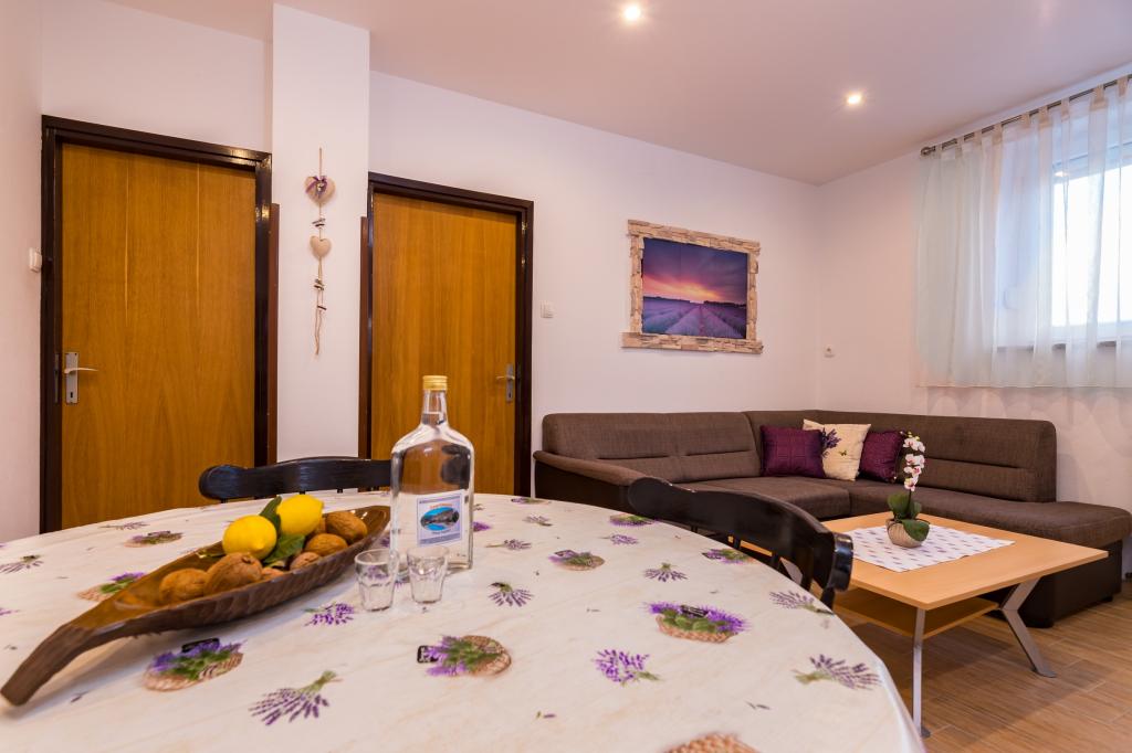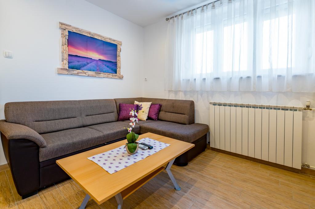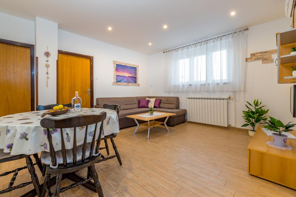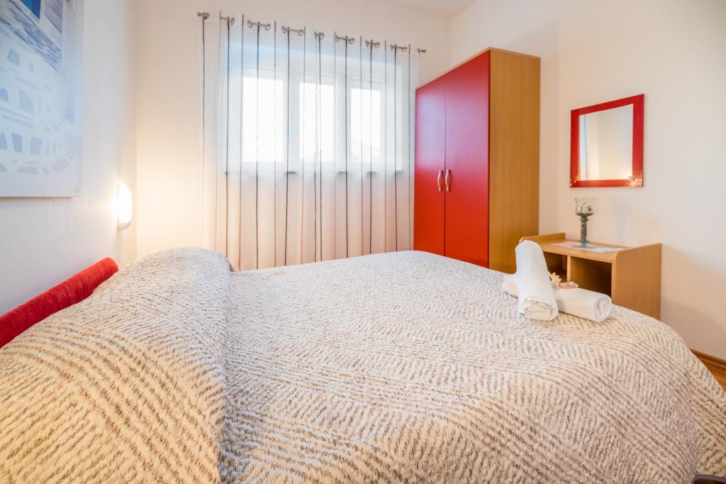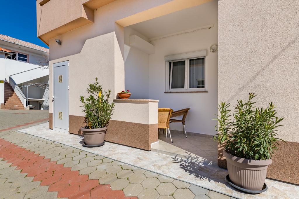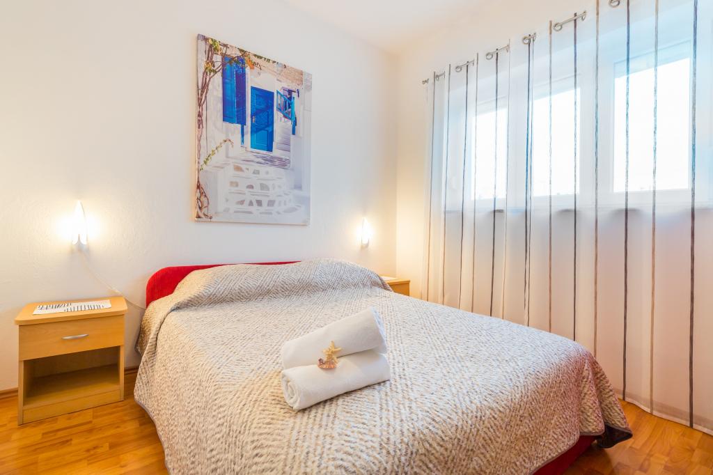 Apartmán pro 4 osoby (možnost přistýlky). Nachází se v přízemí a má terasu a bazén. Skládá se ze dvou dvoulůžkových pokojů a rozkládací pohovky v obývacím pokoji. Elektrický a plynový sporák, lednice s mrazákem, mikrovlnná trouba, rychlovarná konvice, kávovar, kuchyně vybavená kuchyňským nádobím. Koupelna se sprchou.