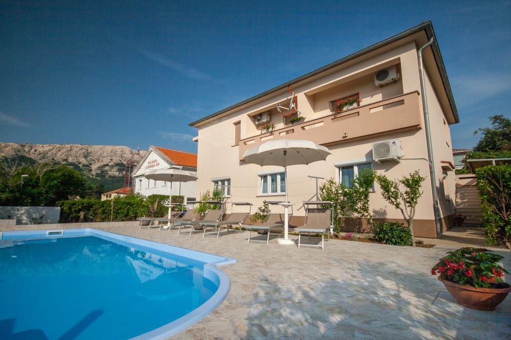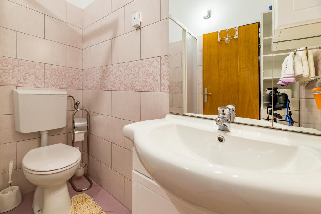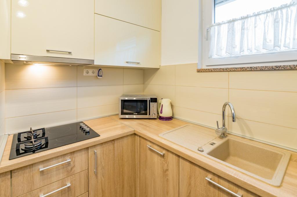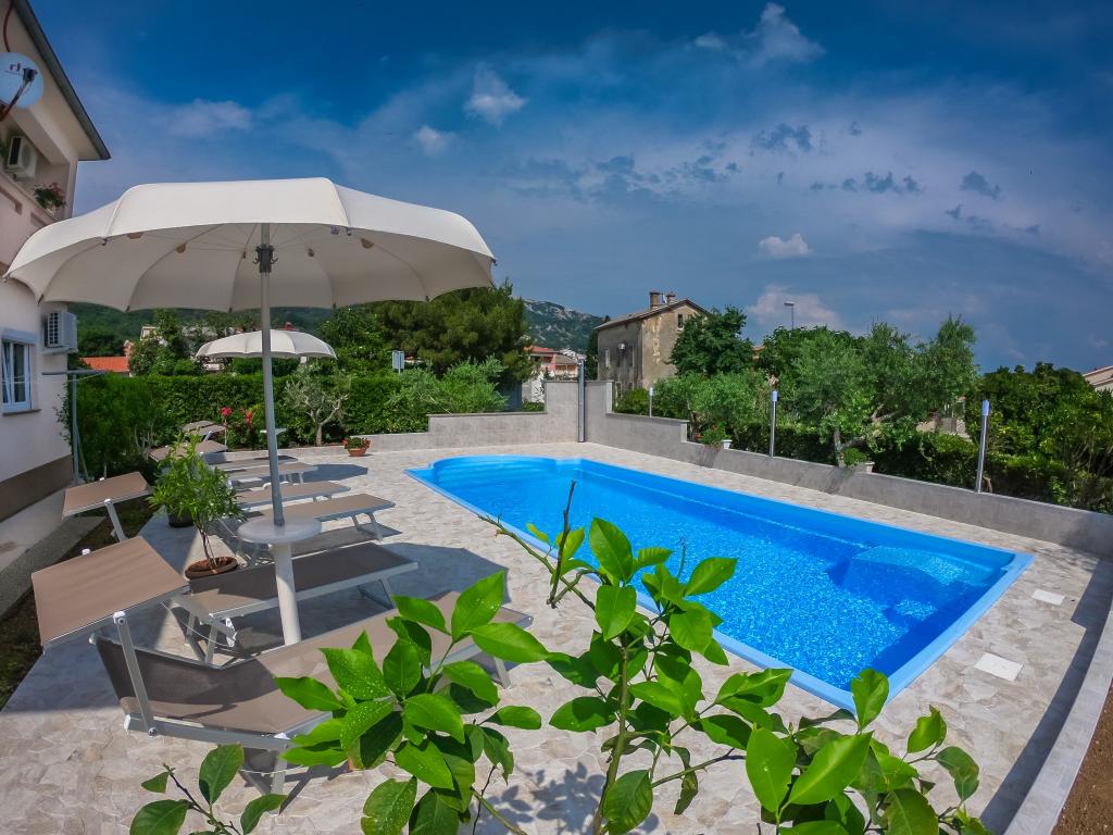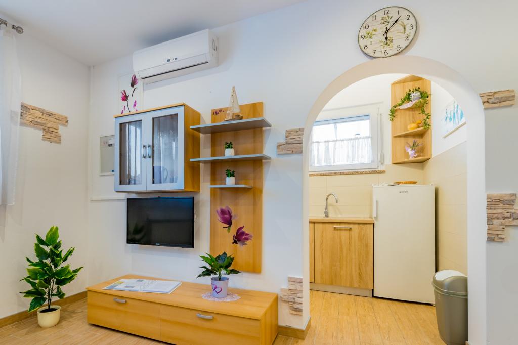 Apartmán pro 4 osoby (možnost přistýlky). Nachází se v přízemí a má terasu a bazén. Skládá se ze dvou dvoulůžkových pokojů a rozkládací pohovky v obývacím pokoji. Elektrický a plynový sporák, lednice s mrazákem, mikrovlnná trouba, rychlovarná konvice, kávovar, kuchyně vybavená kuchyňským nádobím. Koupelna se sprchou.