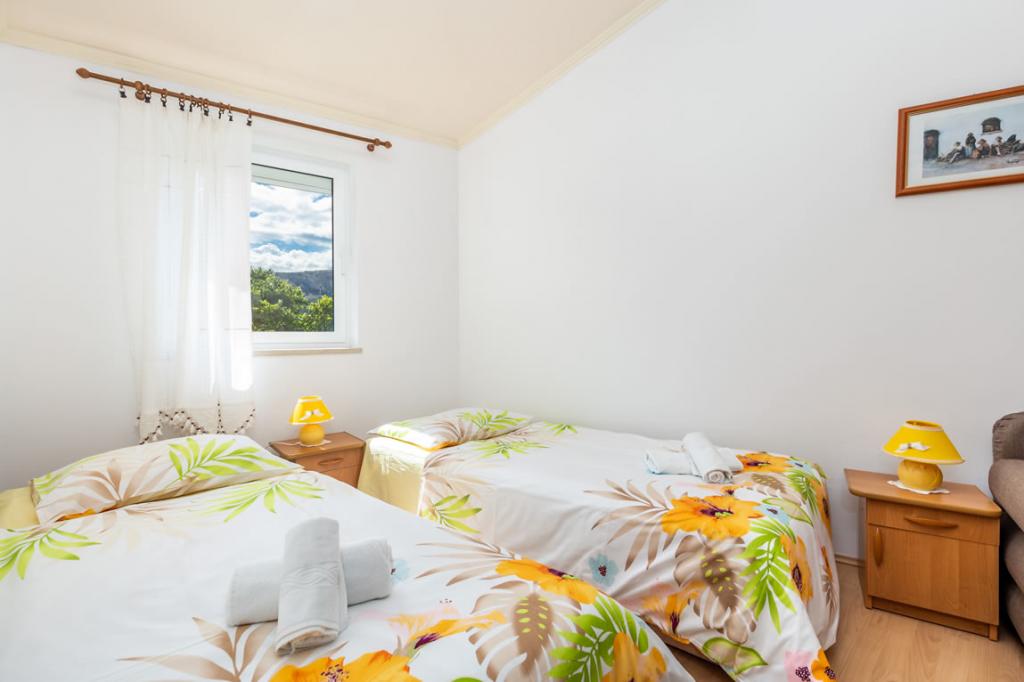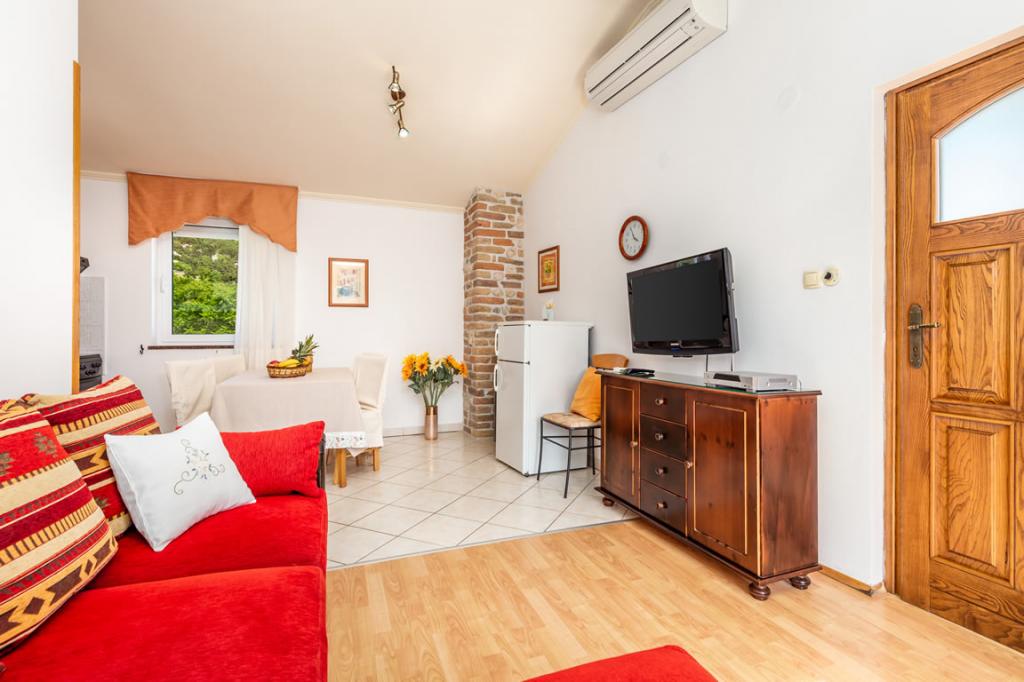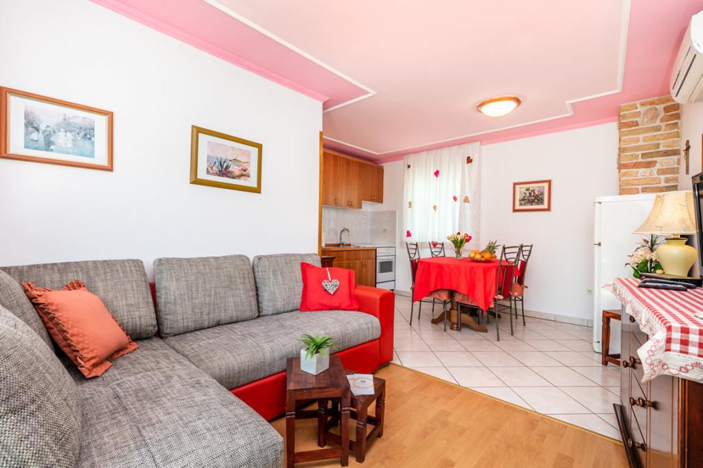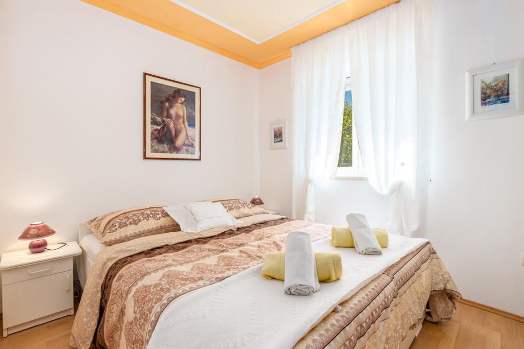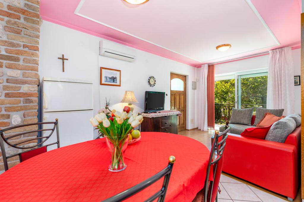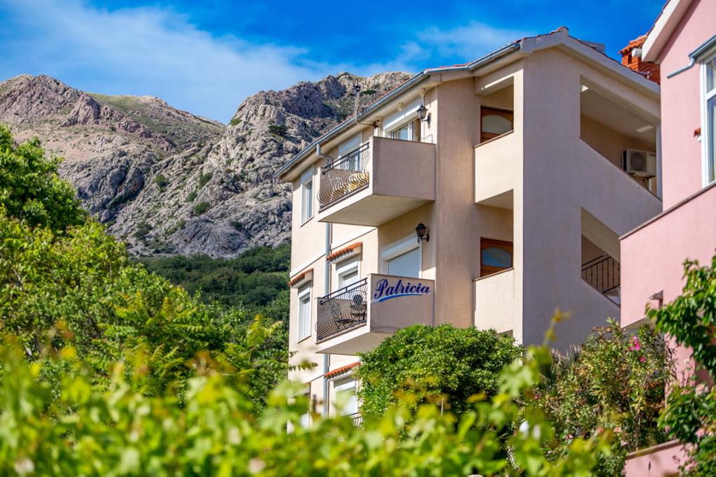 Apartmány Patricia se nachází v klidné lokalitě v blízkosti centra, 5 minut chůze (350 metrů) od pláže, která má evropskou modrou vlajku. Apartmány jsou 60 m2, vybavené pro 4-7 osob. Apartmány jsou nově zrekonstruované, sestávají z jedné ložnice s manželskou postelí, jedné místnosti se dvěma až třemi lůžky, koupelny s WC, prostorné a plně vybavené kuchyně, obývacího pokoje s křeslem a satelitní TV. Každý apartmán má balkon. Hosté mají k dispozici gril s terasou obklopenou zelení a parkovací místo před domem. V bytě je klimatizace a internet.