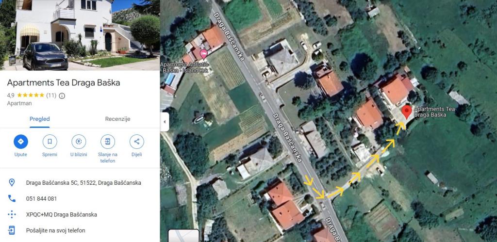 Apartmány Tea se nacházejí asi minutu jízdy od centra Bašky a Vela plaža, v klidné části Draga Baška.