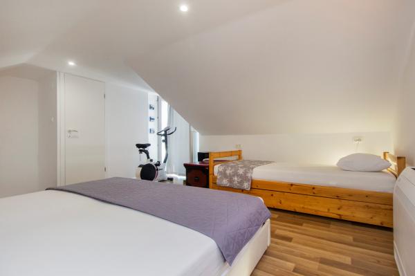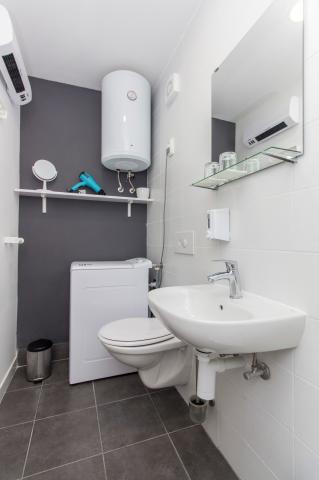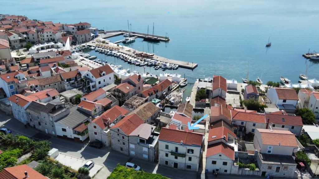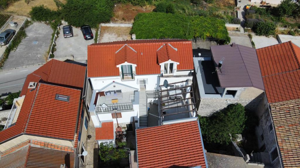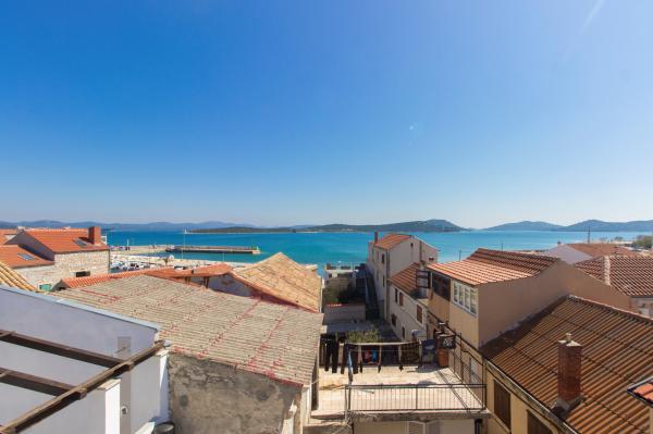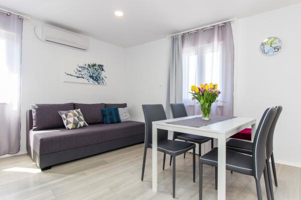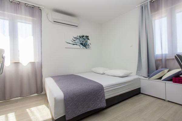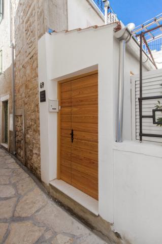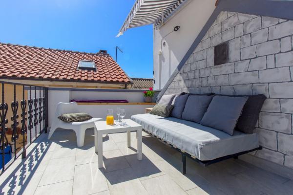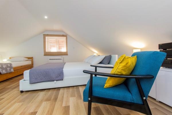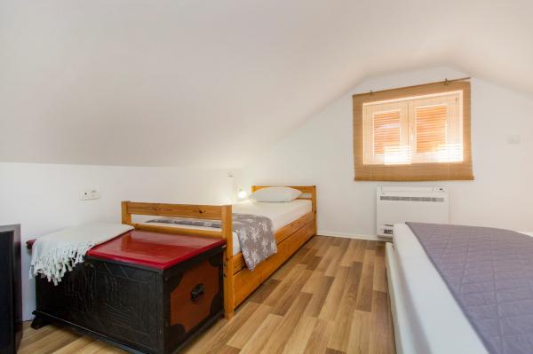 Byt se nachází v blízkosti centra (100 m) a pláže (200 m) Parkování je možné u budovy, cca 150 m od hotelu. Byt je dvoupodlažní, nachází se ve druhém patře a podkroví starého kamenného rodinného domu. Vstupní podlaží bytu tvoří obývací pokoj s kuchyní a koupelnou, s podkrovím je propojeno vnitřním schodištěm. Kapacita 3+1, tedy pokoj v podkroví vybavený velkou manželskou postelí 180x200 cm, a postelí pro jednu osobu 90x200 cm. V obývacím pokoji lze trojsedák rozložit na pohodlnou postel o rozměrech 160x200, kterou mohou využít 2 osoby. Kuchyň je plně vybavená, stejně jako obývací pokoj a koupelna (další vybavení: mikrovlnná trouba, varná konvice, TV+Netflix, wi-fi, mini linka, fén, mýdlo, šampon), všechny otvory mají moskytiéru. Každý pokoj je samostatně klimatizované. K bytu náleží terasa 12 m2, vybavená markýzou a sedacím nábytkem.