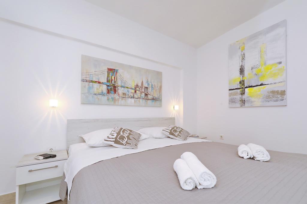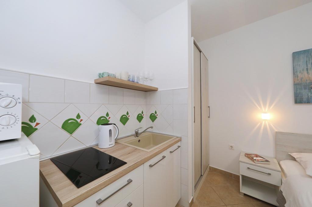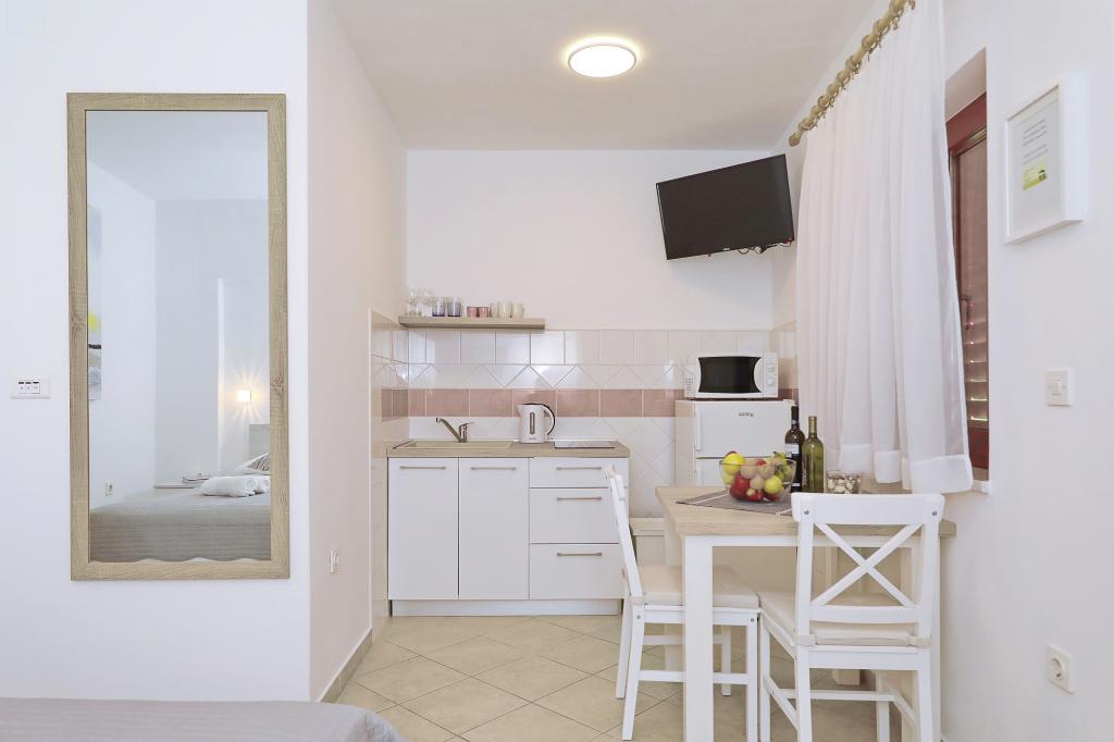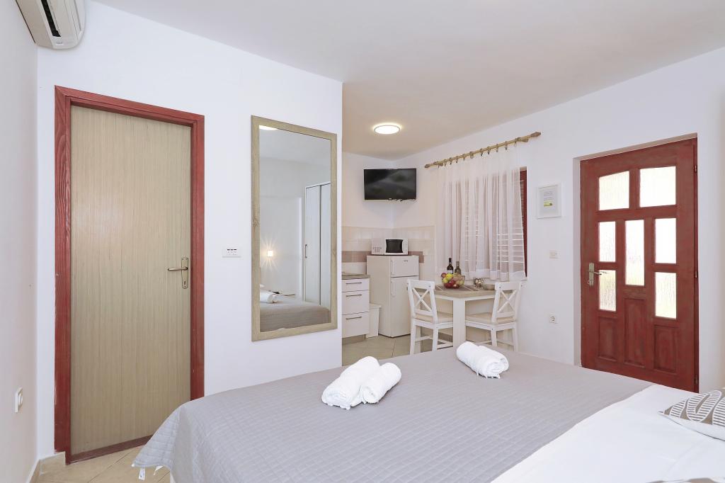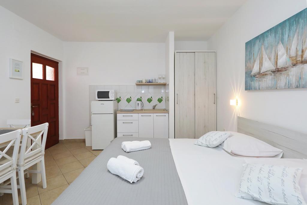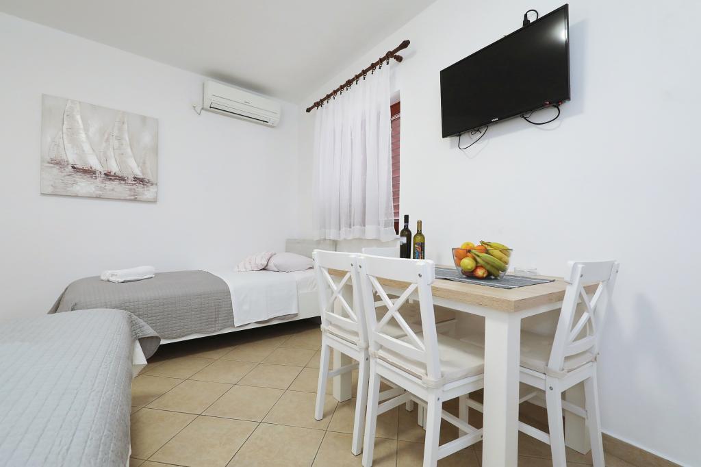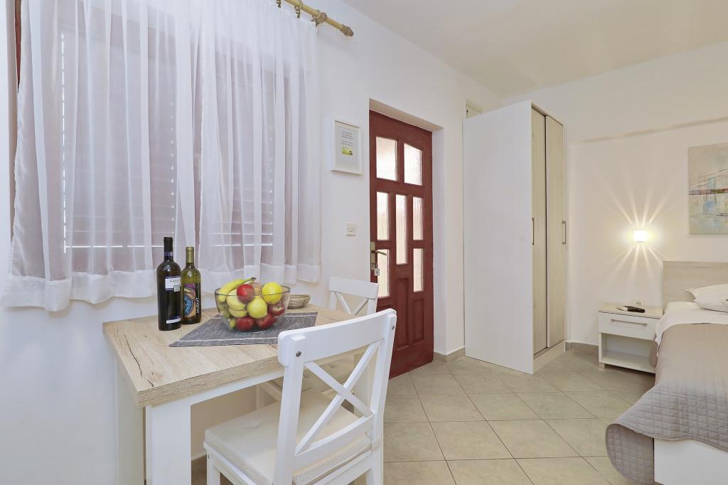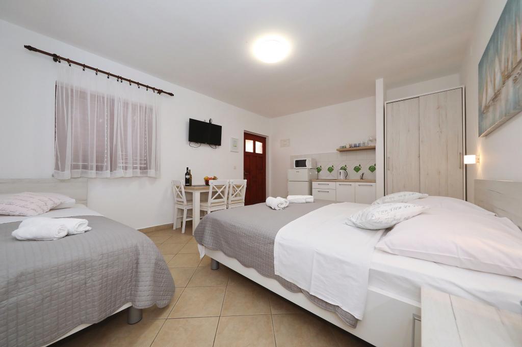 Krásně zdobené a funkční apartmány a studio. Bydleli jsme v Studio + 1, krásná terasa pro posezení v přední části, plus pro ukládání mokrých věcí z pláže, parkovací místo u bytu ... pláž je velmi blízko s malým dítětem vynikající 10+