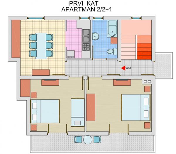 Rodinný dům, kde jsou apartmány se nacházejí v centru města, na okraji lesoparku Soline, ve kterém má hlavní pláž, tenisové kurty, diskotéka a další zábavu. Dům má tři apartmány a jeden apartmán pro dvě osoby, studio apartmán pro čtyři osoby a apartmán se dvěma ložnicemi pro celkem pět osob. Apartmány jsou vybaveny všemi potřebnými základních nástrojů a pomůcek. Byt je povoleno bezplatné Wi-Fi připojení na internet, každý byt má balkon a klimatizaci. Na dvoře je gril. Korištelnje grilování je zdarma. Je možné parkovat v garáži a parkovací místo u domu, a ostatní jsou parkovací místa v blízkosti domu.