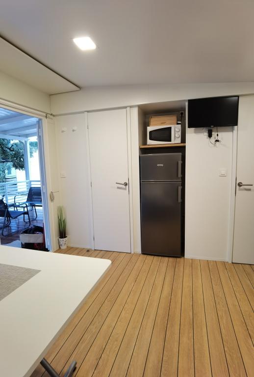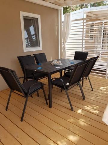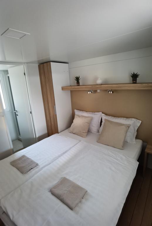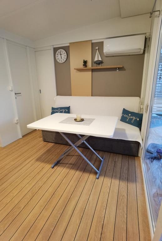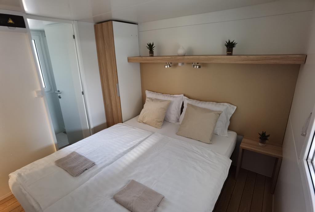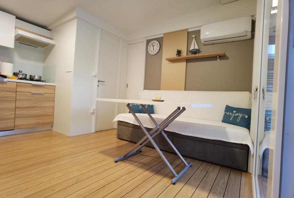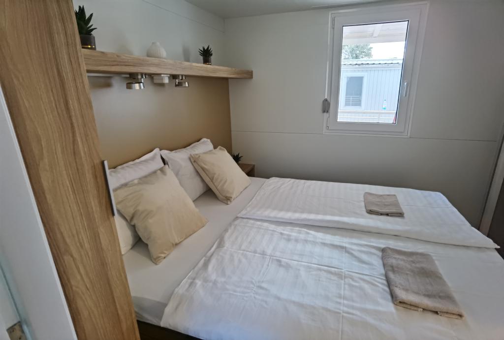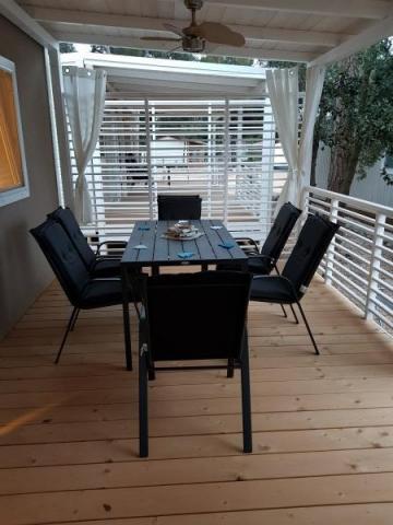 Plně a moderně vybavený mobilní dům nacházející se v kempu v Soline o velikosti 36m2 pro 7 osob. Dům má 3 pokoje, jeden s manželskou postelí a dva pokoje se dvěma samostatnými lůžky. V domě jsou také dvě koupelny. Kuchyň je plně vybavena včetně myčky, mikrovlnné trouby, rychlovarné konvice, lednice s mrazákem, kávovaru a veškerého příslušenství potřebného pro příjemný a ničím nerušený pobyt v chatě. V obývacím pokoji je pohovka se stolem a židlemi a velká televize. V obývacím pokoji je možné přidat jednu přistýlku pro jednu osobu. Dům má také klimatizaci, aby si v něm každý mohl užít pobyt v horkých letních měsících. Na terase o rozloze 27m2 je část s lehátky k odpočinku a část s velkým stolem a šesti židlemi. Na terase je také elektrický gril. Kemp se nachází uprostřed borového lesa a je vzdálen 5 minut snadné chůze od pláže. V kempu najdete vše, co potřebujete pro příjemnou dovolenou a pobyt, protože nabízí několik restaurací, kaváren, směnáren, možnost praní a sušení prádla a každý den jsou pořádány různé aktivity pro děti i dospělé. Pro všechny, kteří mají rádi aktivnější dovolenou, si mohou vybrat z různých aktivit, jako je cyklistika, potápění, stolní tenis, tenis, plážový volejbal, vodní lyžování, plachtění a různé výlety do několika nedalekých národních parků.