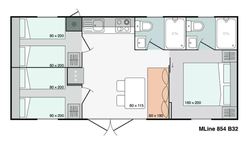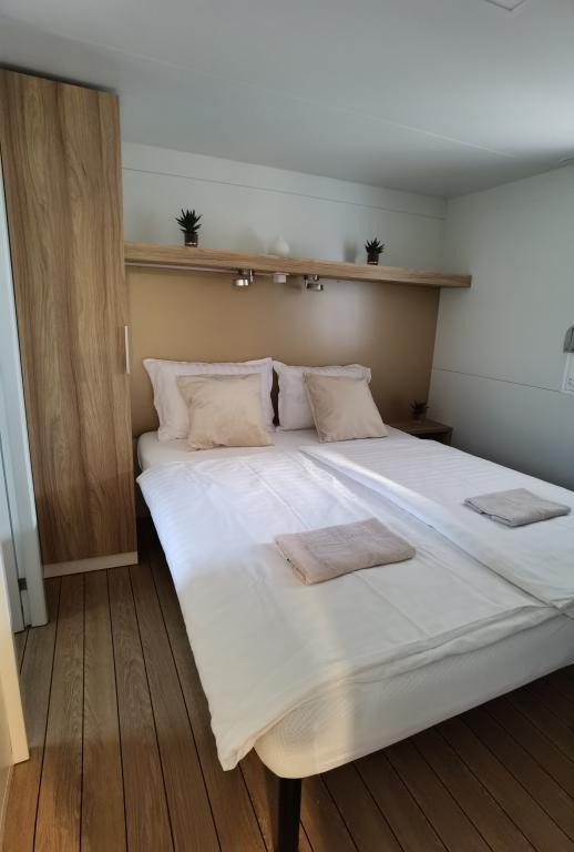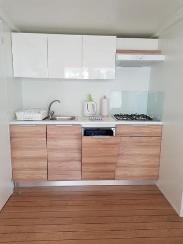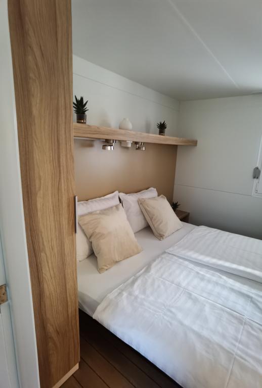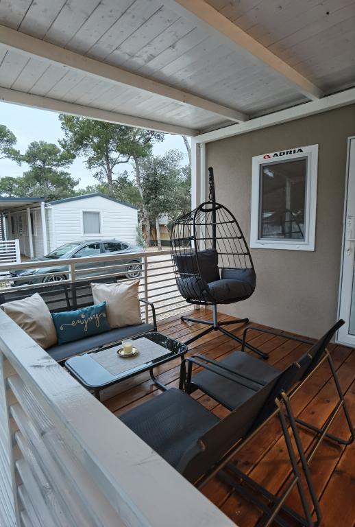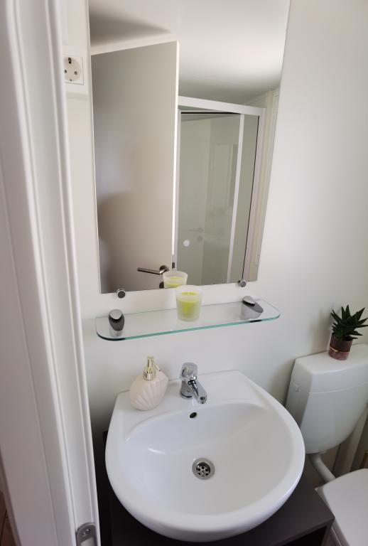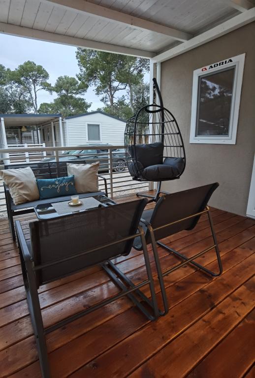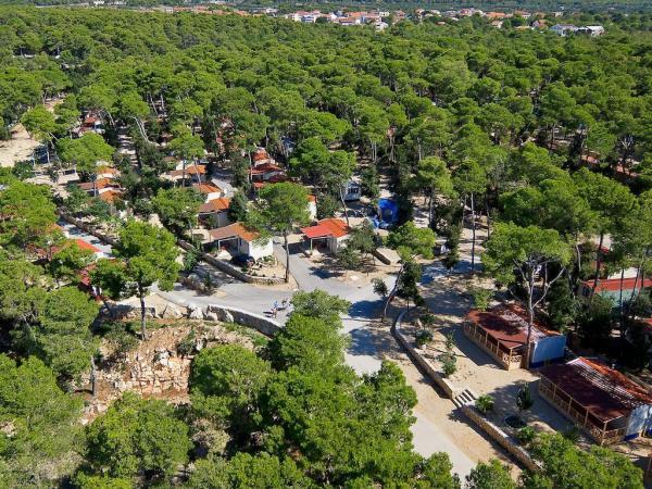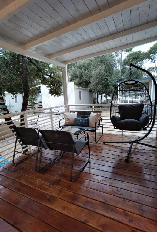 Plně a moderně vybavený mobilní dům nacházející se v kempu v Soline o velikosti 36m2 pro 7 osob. Dům má 3 pokoje, jeden s manželskou postelí a dva pokoje se dvěma samostatnými lůžky. V domě jsou také dvě koupelny. Kuchyň je plně vybavena včetně myčky, mikrovlnné trouby, rychlovarné konvice, lednice s mrazákem, kávovaru a veškerého příslušenství potřebného pro příjemný a ničím nerušený pobyt v chatě. V obývacím pokoji je pohovka se stolem a židlemi a velká televize. V obývacím pokoji je možné přidat jednu přistýlku pro jednu osobu. Dům má také klimatizaci, aby si v něm každý mohl užít pobyt v horkých letních měsících. Na terase o rozloze 27m2 je část s lehátky k odpočinku a část s velkým stolem a šesti židlemi. Na terase je také elektrický gril. Kemp se nachází uprostřed borového lesa a je vzdálen 5 minut snadné chůze od pláže. V kempu najdete vše, co potřebujete pro příjemnou dovolenou a pobyt, protože nabízí několik restaurací, kaváren, směnáren, možnost praní a sušení prádla a každý den jsou pořádány různé aktivity pro děti i dospělé. Pro všechny, kteří mají rádi aktivnější dovolenou, si mohou vybrat z různých aktivit, jako je cyklistika, potápění, stolní tenis, tenis, plážový volejbal, vodní lyžování, plachtění a různé výlety do několika nedalekých národních parků.