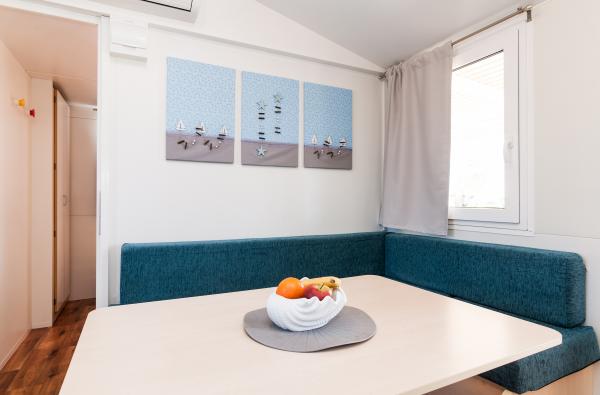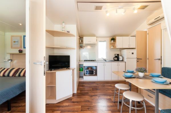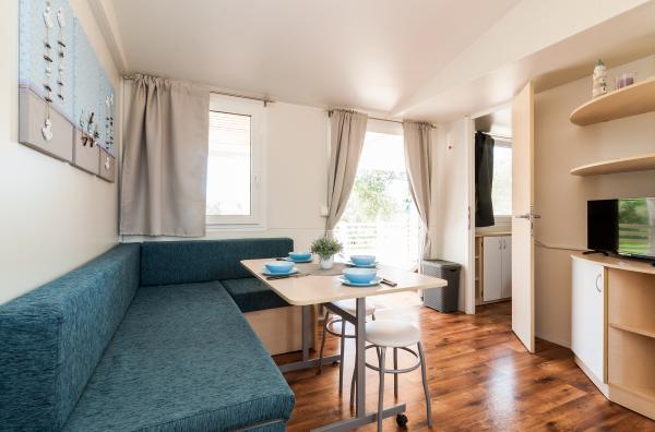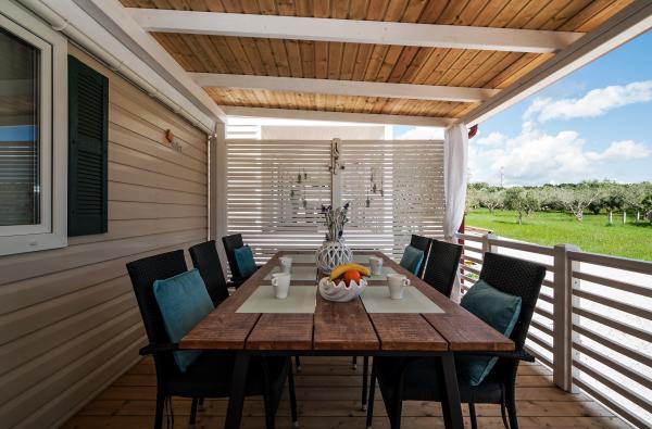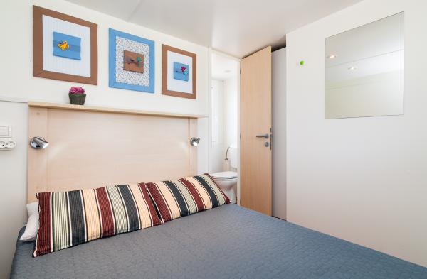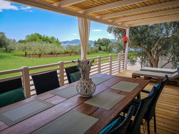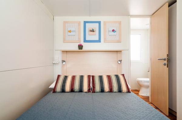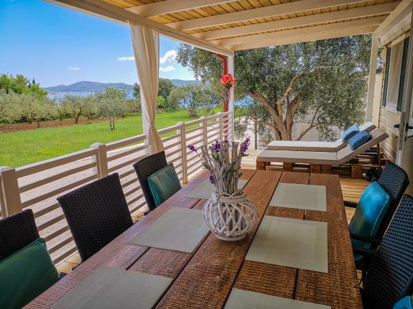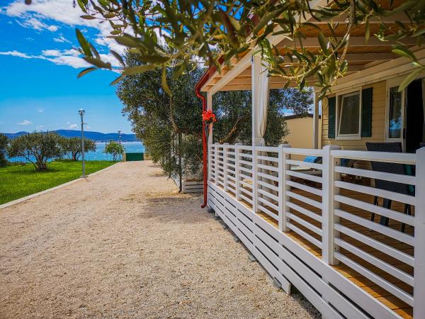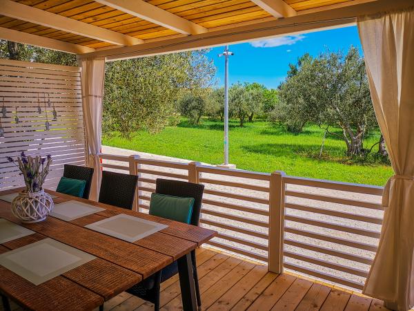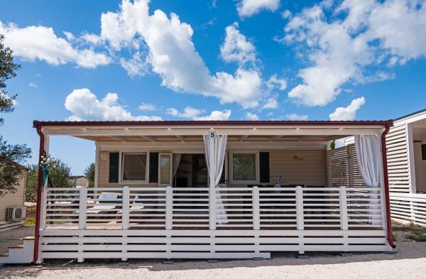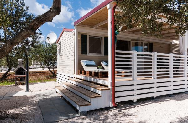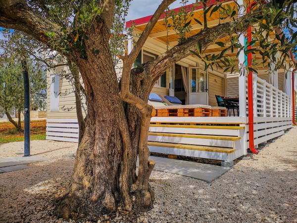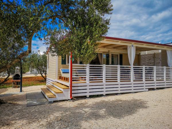 Mobilní domy se nacházejí v kempu TRSTIKE, soukromém kempu v olivovém háji, u moře, v blízkosti písečné pláže Terst a oblázkové pláže Bošana. Toto ubytování vám poskytne radost z přírody a ticha. Nachází se nedaleko od centra Biogradu na Moru, pouhých 15-20 minut chůze od moře, kde najdete veškerou zábavu a stravování. Nedaleká historická města Zadar (30 km) a Šibenik (41 km) nabízejí návštěvníkům zajímavé a bohaté chorvatské kulturní dědictví. Zábavní park Fun Park Mirnovec je vzdálený 5, 6 km / 10 min. Mobilní domek: 2 ložnice (jedna ložnice s 1 velkou postelí, druhá ložnice má 2 samostatné postele, rohová sedací souprava (možnost přestavby na lůžko pro jednu dospělou osobu nebo 2 děti) se stolem, 2 x sprcha / WC, terasa : 26 m2 se zahradním nábytkem a 2 lehátky, před domem je venkovní sprcha a gril.