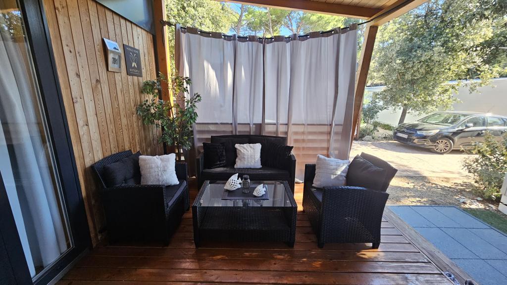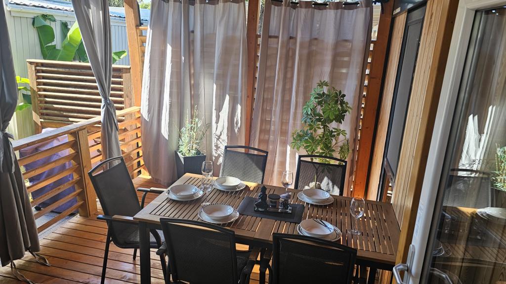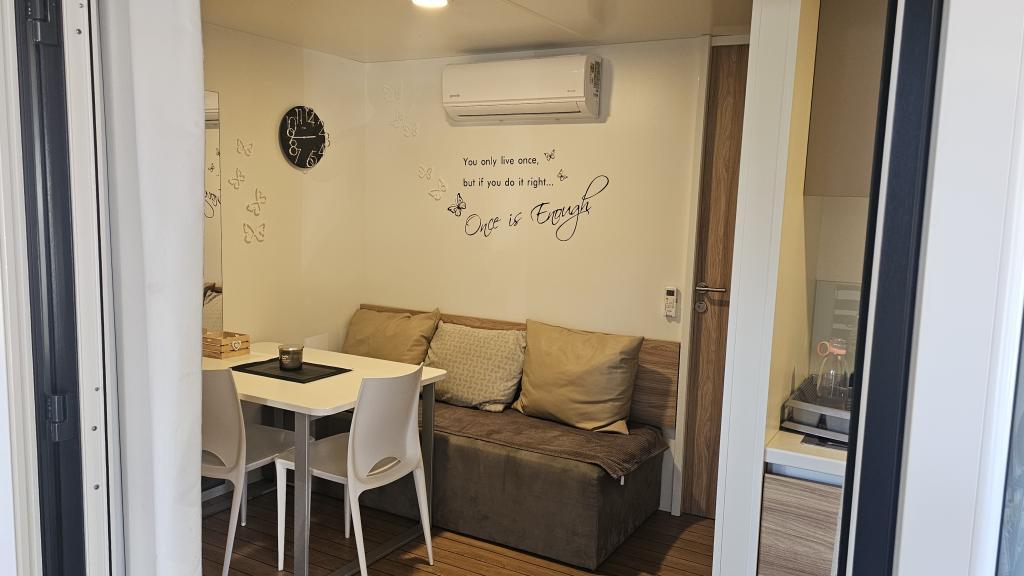 Moderní klimatizovaný mobilní dům v kempu Park Soline, jen pár kroků od pláže a 15 minut chůze od centra Biogradu. Nabízí 2 ložnice, kuchyň, obývací pokoj, 2 koupelny a krytou terasu s venkovním nábytkem. Bezplatné Wi-Fi, parkování, dětská zábava, sportovní hřiště a středomořská restaurace v areálu. Ideální pro rodiny nebo páry, které hledají odpočinek ve stínu borovic, v blízkosti všech hlavních atrakcí.