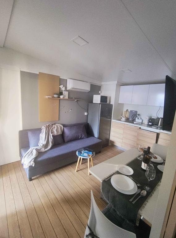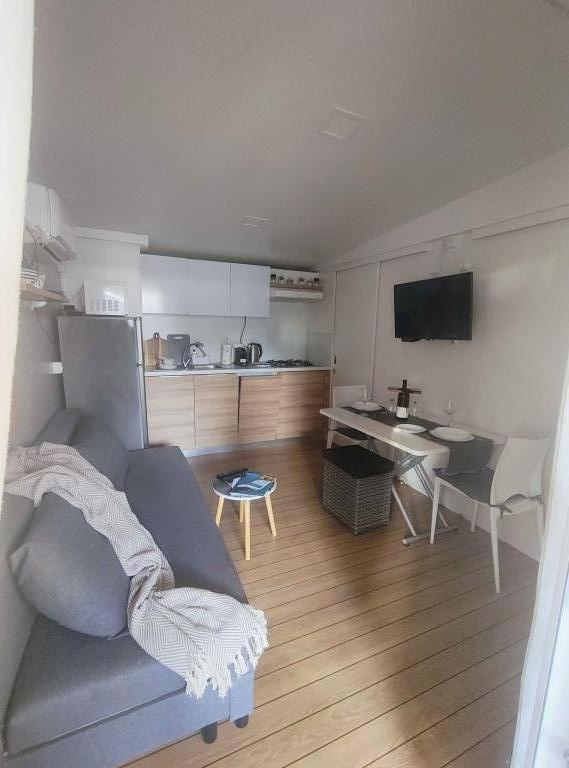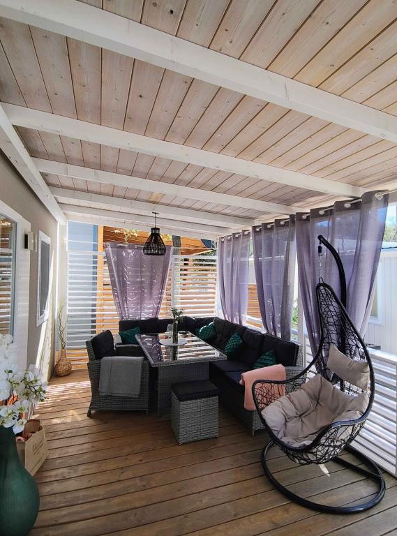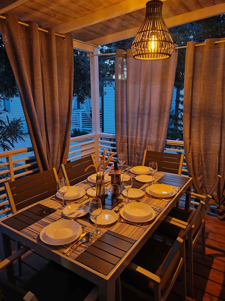 Náš moderně vybavený mobilní dům nabízí pohodlné ubytování až pro 7 osob se 2 prostornými ložnicemi, obývacím pokojem s rozkládací pohovkou a 2 koupelnami. Užijte si velkou krytou terasu s jídelním koutem a venkovním posezením, ideální pro dlouhé večerní posezení, při grilování na našem velkém plynovém grilu a venkovním vařiči. Krytá terasa je obklopena borovicemi a jemným vánkem od moře. Na jedné straně terasy se nachází prostorná jídelna a na druhé straně naše venkovní posezení nabízí pohodlné posezení a pro dokonalé potěšení je zde také "houpačka ve tvaru vejce". Také na otevřeném prostranství si můžete užívat slunce nebo stínu na velkém pohodlném lehátku s malým stolkem, kde si můžete vychutnat koktejly nebo studený nápoj, nebo si přečíst knihu. Dům se nachází 3 minuty od krásné pláže.