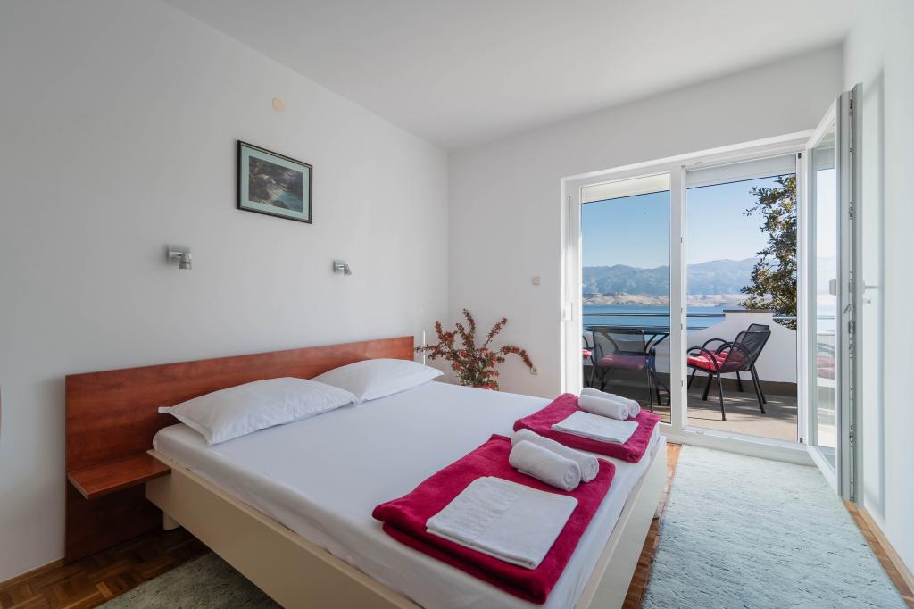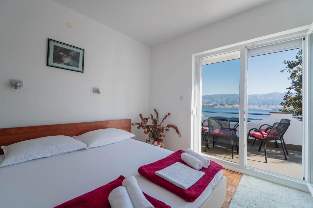 Pobytová taxa je v ceně. Doklad o potvrzení rezervace při rezervaciOba apartmány jsme si pronajali se skupinou přátel a dětí. Je to velmi klidná, odlehlá, zelená lokalita s krásným výhledem, oba apartmány jsou pečlivě a dobře vybavené a hostitelé jsou velmi přátelští. Horní apartmán je slunnější a skládá se ze tří dvoulůžkových pokojů (jeden je propojen s jídelnou), kuchyně a koupelny. Jedna ložnice má další rozkládací pohovku. Apartmán má dvě klimatizační jednotky a slunnou terasu, která odpoledne poskytuje příjemný stín. Spodní apartmán se skládá ze tří ložnic (první je velká dvoulůžková ložnice, druhá je malá dvoulůžková ložnice a třetí je malá ložnice pro 1-1,5 osoby), dobře vybavené kuchyně s jídelním koutem a dvěma přistýlkami a koupelny. Tento apartmán má také dvě klimatizační jednotky. Apartmán má stinnou terasu a přístup do malé zelené zahrady s lehátky. Velkou výhodou obou apartmánů jsou moskytiéry na všech oknech, přístup k pračce, venkovní sprcha, dobře fungující Wi-Fi a soukromé parkoviště. Přístup na pláž je poměrně strmý tříminutový sestup po pohodlné zpevněné cestě a schodech. Pláž je krásná zátoka, vhodná jak pro děti, tak pro silné plavce, a je také zajímavá pro milovníky šnorchlování. Obchod s potravinami, restaurace a další atrakce a služby se nacházejí jen pár kilometrů odtud v půvabném městečku Pag. Majitelé apartmánů jsou neuvěřitelně přátelští a pohostinní, vždy na místě a starají se o všechno. Mluví dobře anglicky a rychle reagují na dotazy. Ubytování se nám moc líbí a doporučujeme ho.