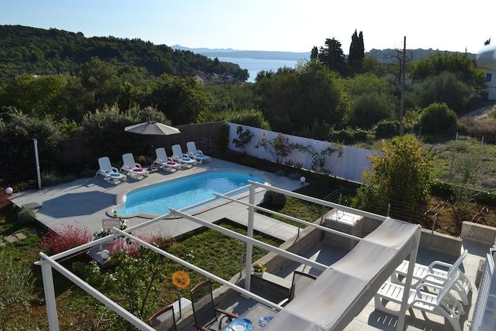 Byli jsme osm (4 dospělí a 4 děti) dva týdny v chalupě, a těšil se z pobytu velmi. Dům zcela odpovídá popisu, a ještě lepší, velmi milý pronajímatel, odkud jsme obdrželi vítejte po příjezdu s nápoji. Dům byl kompletně zrekonstruován a má idylickou zahradu, bazén a terasu, ze které máte krásný výhled na moře. Zahradní nábytek, lehátko, a oplocené grilování. Vybavení domu je skvělé, vše je k dispozici, i pračka, a myčky nádobí jsou k dispozici. Chybí, nic, a pokud potřebujete něco navíc, je organizována pronajímatelem. Pokud hledáte odpočinek a relaxaci na dovolené, nebo si po dni stráveného odpočinku nemáte chuť jít na pláž, ale chtěli byste si u bazénu vychutnat jen relaxační atmosféru, najdete zde perfektní podmínky. Bazén je velmi čistý a byl vyčištěn každý den. Byla to velmi příjemná a uvolněná dovolená. Místo odpočinku, doporučujeme vždy.