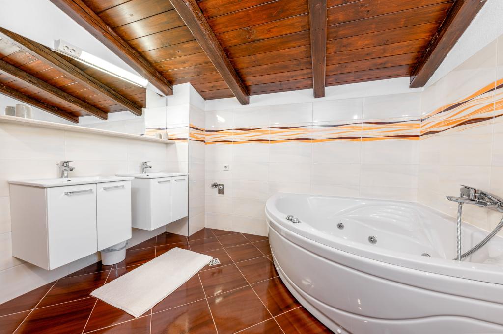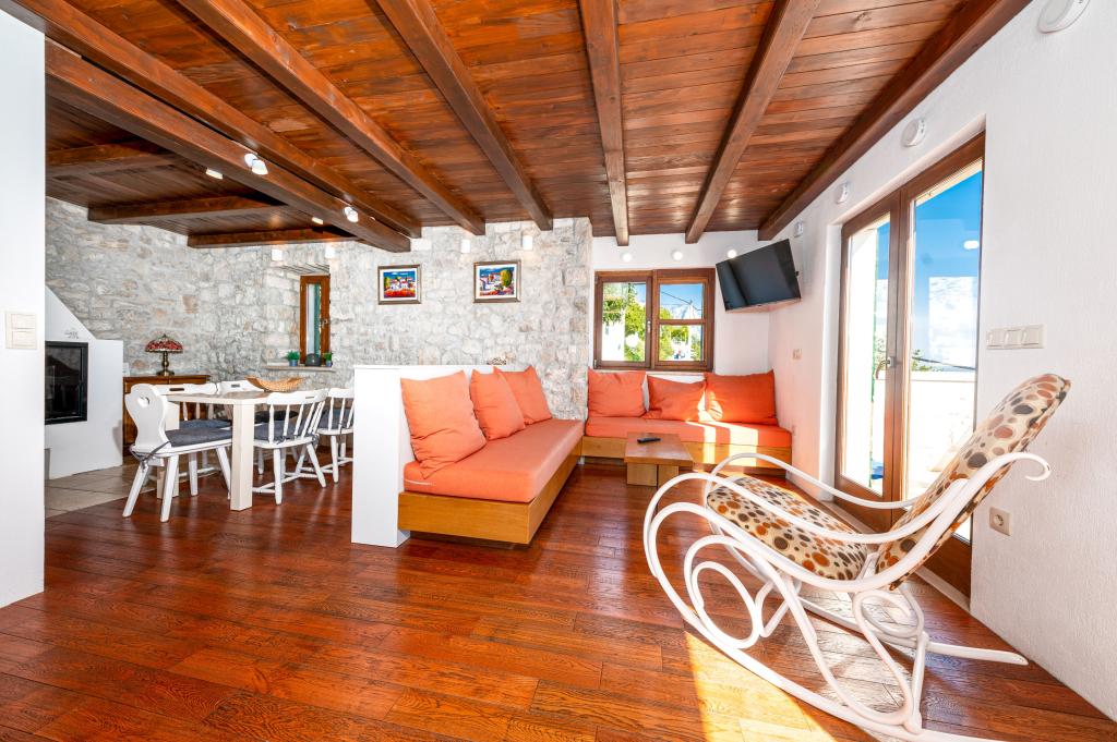 Vítejte v našem prostorném a okouzlujícím apartmánu, který se nachází v soukromém domě s celkem třemi apartmány - ideální volba pro klidnou a relaxační dovolenou v pravém dalmatském prostředí. Apartmán o rozloze 115 m² nabízí vše, co potřebujete pro příjemný pobyt. Skládá se ze dvou pohodlných ložnic, plně vybavené kuchyně propojené s prostorným obývacím pokojem, dvou koupelen (jedna z nich má hydromasážní vanu) a další samostatné toalety. Rustikální dekorace a pečlivě vybrané detaily vytvářejí vřelou atmosféru a autentickou dalmatskou atmosféru. Dům se nachází na kaskádovitém terénu a schody vedou ke společnému bazénu. Bazén se nachází na prostorné terase vybavené lehátky a slunečníky, ideální pro opalování a kochání se výhledem. Vzhledem ke schodům a konfiguraci terénu není apartmán vhodný pro osoby se zdravotním postižením nebo osoby se sníženou pohyblivostí. Soukromé parkování je k dispozici hned vedle domu (což je v letních měsících velkou výhodou). Těšíme se na váš příjezd!