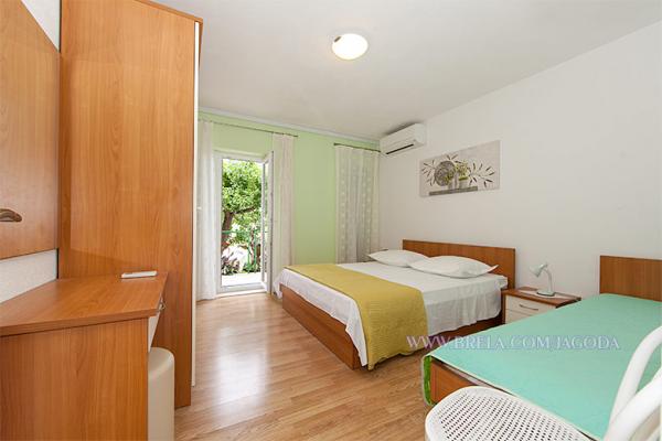 Apartmány Jagoda Klarić se nachází v klidné části Brela (Stomarica) kilometr a půl od centra města. Na jedné straně je výhled na moře, a druhá má výhled na horském svahu. Nejbližší supermarket je cca 300 m, a vzdálenost od pláže, která je asi 2 minuty chůze (80 m). Ubytování se skládá z: Apartmán 1: 60m² 20m² Bakon / terasa, 1 třílůžkový pokoj s balkonem (v přízemí), 1 třílůžkový pokoj s balkonem (v 1. patře), 2 koupelny s WC, plně vybavená kuchyň s jídelnou, velká terasa s výhledem na moře. Maximální kapacita pro 6 osob. Apartmán 2 / (Na 2 patro): 65m² 15m² balkon / terasa, 1 dvoulůžkový pokoj s balkonem, 2 koupelny s WC, jeden třílůžkový pokoj s balkonem, plně vybavená kuchyň, jídelna / obývací pokoj s pohovkou a balkonem, všechny pokoje s balkonem jsou s výhledem na moře. Maximální kapacita pro 6 osob.
