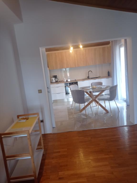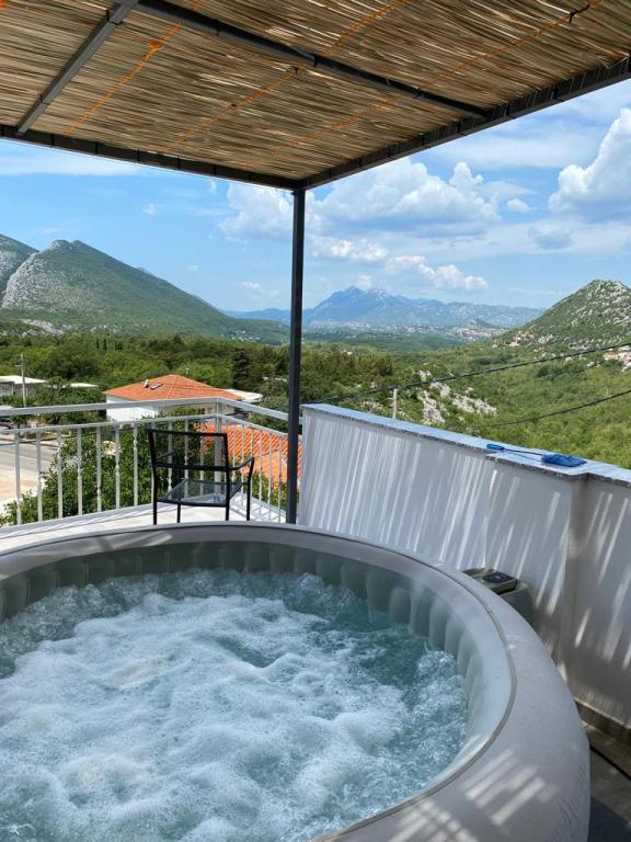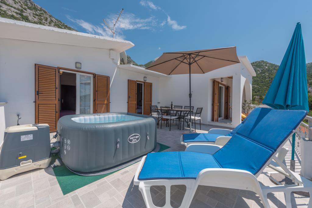 Plně vybavený, nově zrekonstruovaný, komfortní apartmán - 105 m2 v klidném prostředí - 4 km od moře, 10 km od známé pláže Punta Rata Brela (parkovací lístek pro naše hosty zdarma). Max.4 dospělí + 1 dítě. Plně klimatizovaný objekt (3 klimatizační jednotky), 2 ložnice, 2 koupelny, kuchyně a obývací pokoj, 2 terasy, 1 panoramatická 45 m2, velká s vířivkou.Před domem ve dvoře - parkování pro 2 auta v stín. Prostorný apartmán zabírá celé 2. patro domu a poskytuje naprosté soukromí, krásné západy slunce, panoramatický výhled na okolní městečka a přírodní park Biokovo učiní vaši dovolenou nezapomenutelnou.