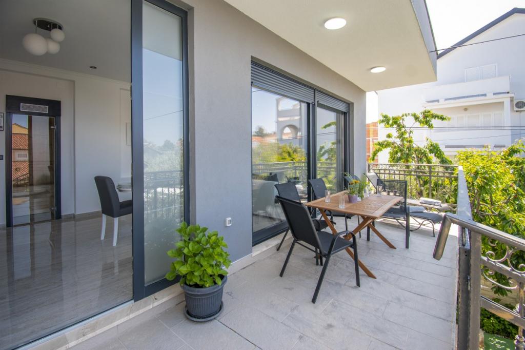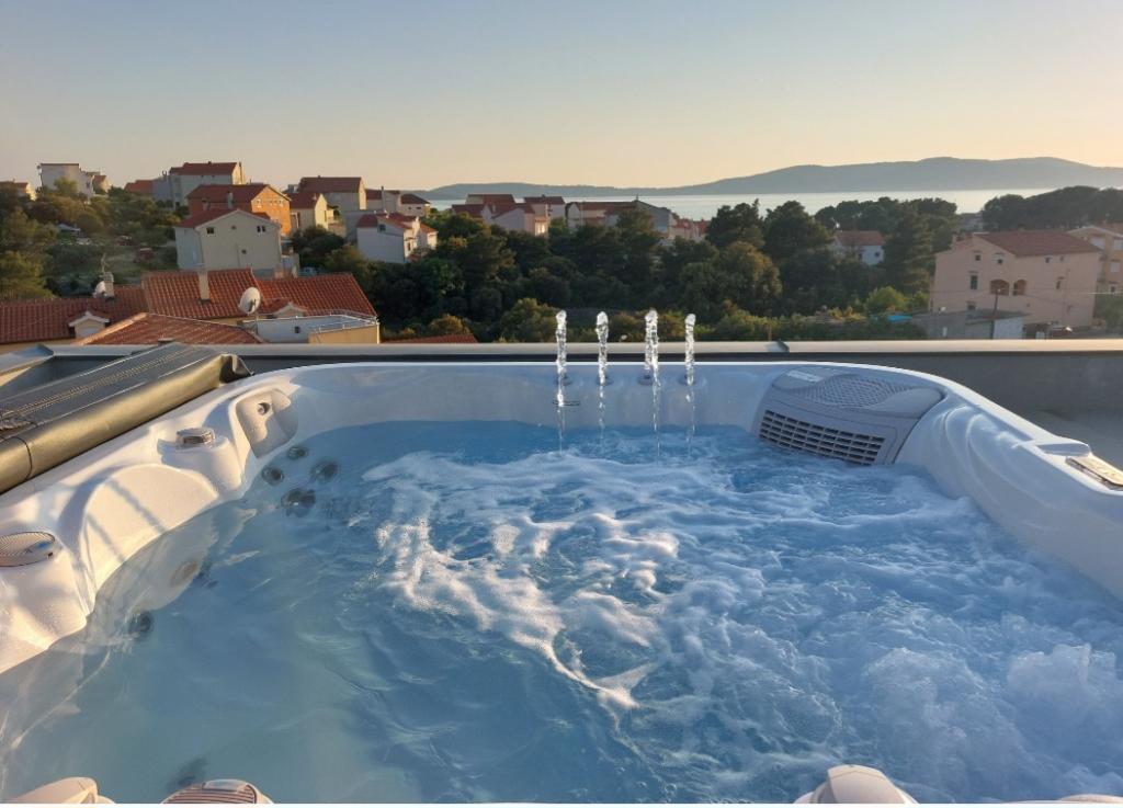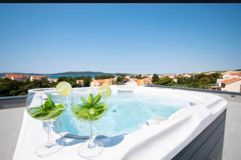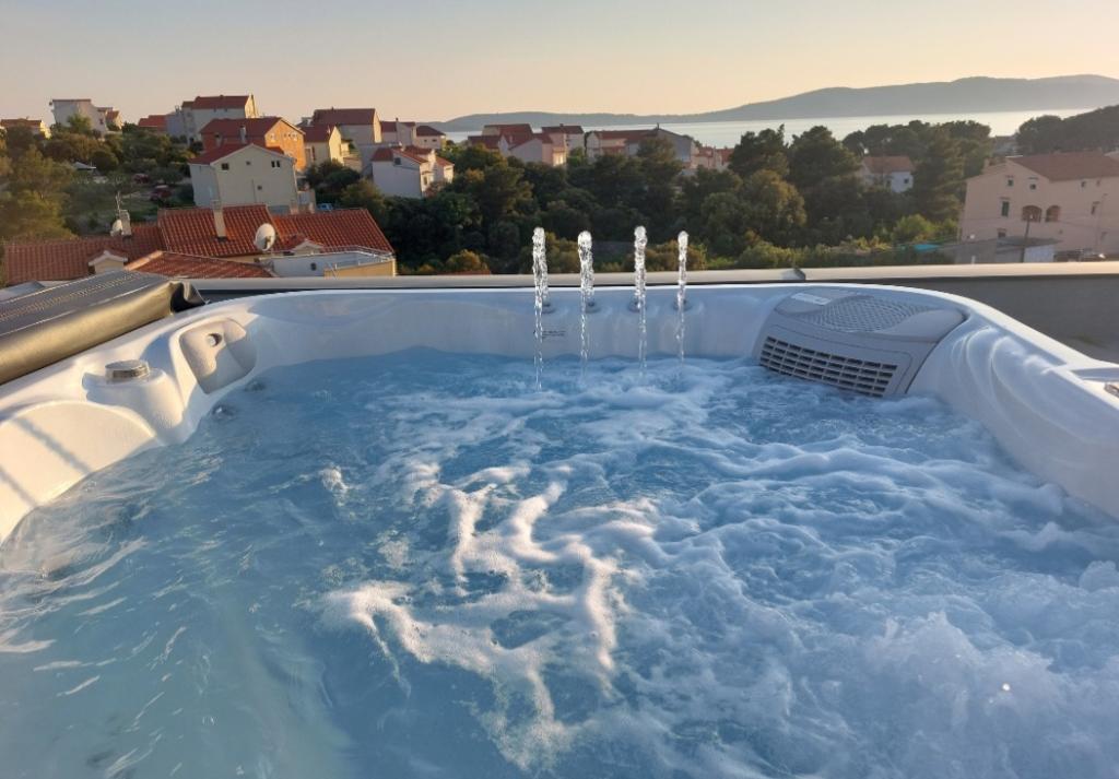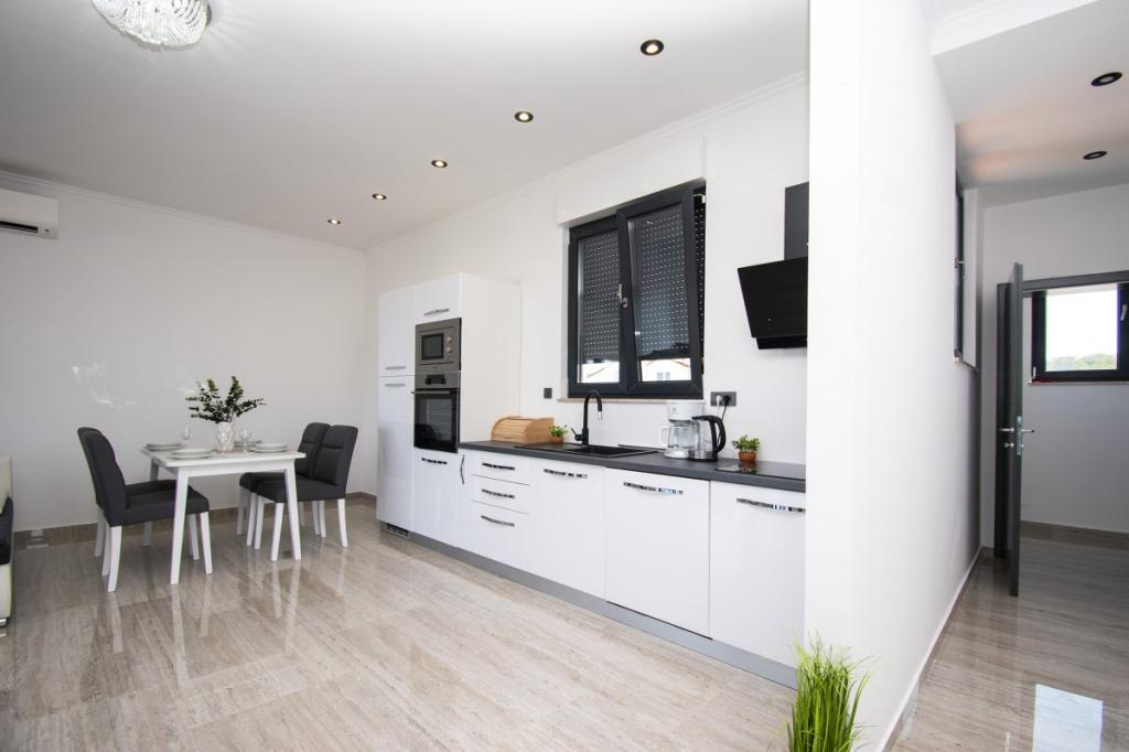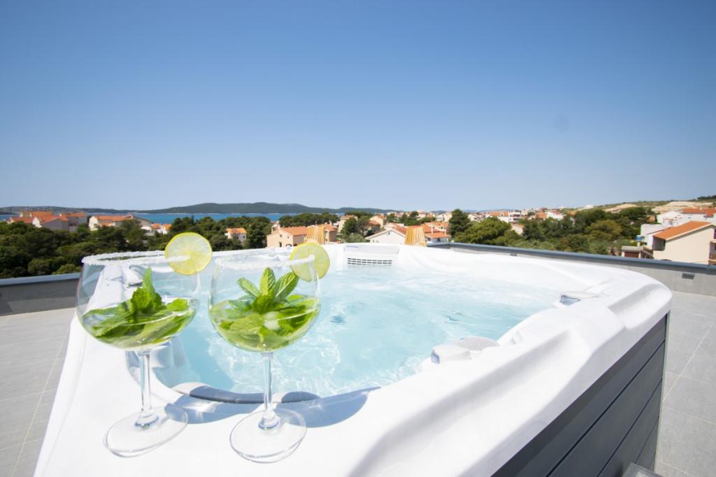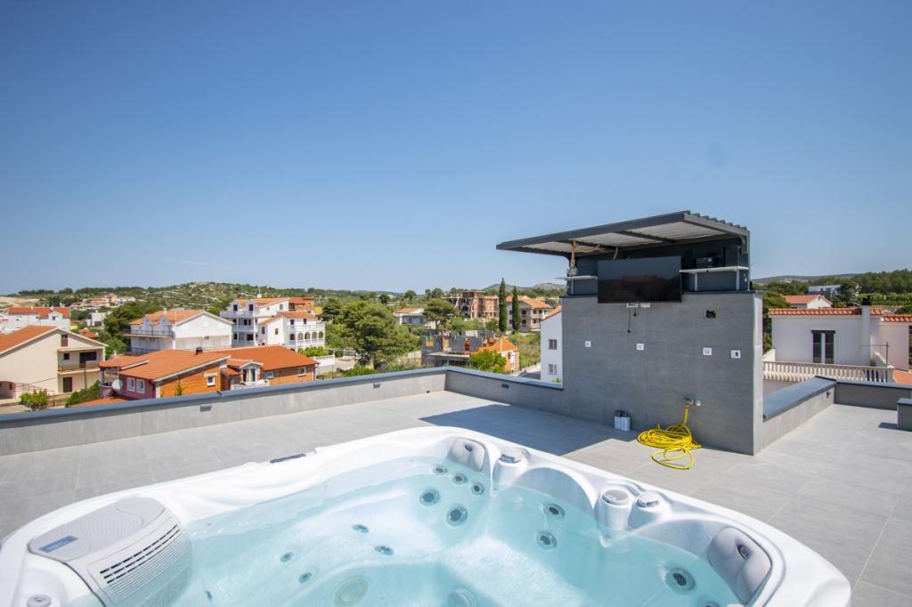 Dům pro 10 osob s bazénem a jacuzzi se nachází v klidné části Brodarica, obklopený spoustou zeleně a květin. První dva byty jsou v přízemí, jeden má 45 m2 a druhý 50 m2. Každý apartmán má ložnici s manželskou postelí, kuchyň, rozkládací pohovku, koupelnu a terasu se stolem a židlemi. Třetí apartmán je 90 m2, nachází se v prvním patře, má dvě velké dvoulůžkové ložnice, velký obývací pokoj, kuchyň, koupelnu a terasu 45 m2 se stolem a židlemi. Je vhodný pro trochu větší rodinu a přátele. Byt je klimatizovaný. Čtvrtý apartmán je luxusně zařízený, cca 100m2, má velký obývací pokoj, plně vybavenou kuchyň, velký pokoj s televizí a klimatizací, v bytě je i sauna. na střeše je vířivka s velkou terasou. každý apartmán má klimatizaci a každý pokoj má také televizi. Bazén je společný. Dům je 5-6 minut chůze od moře. Vedle domu jsou další dva byty, jeden má 110m2 luxusně zařízený a druhý 55m2.