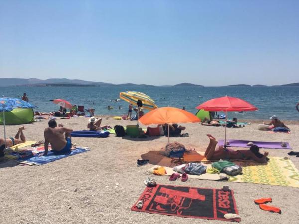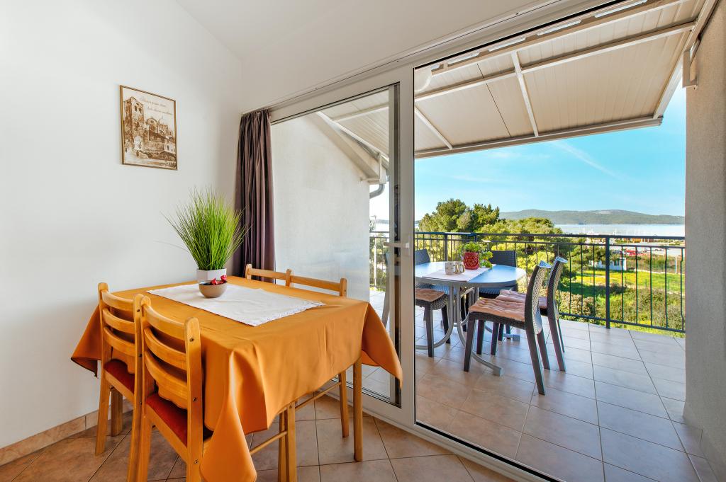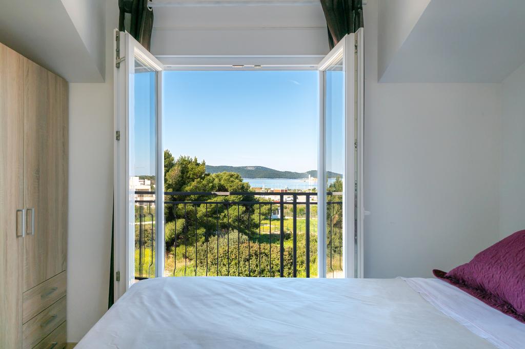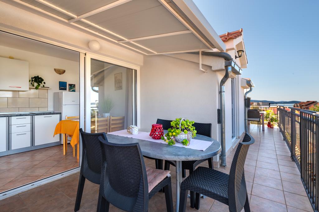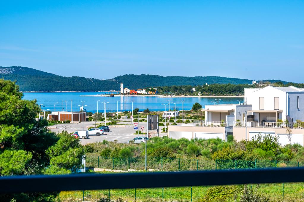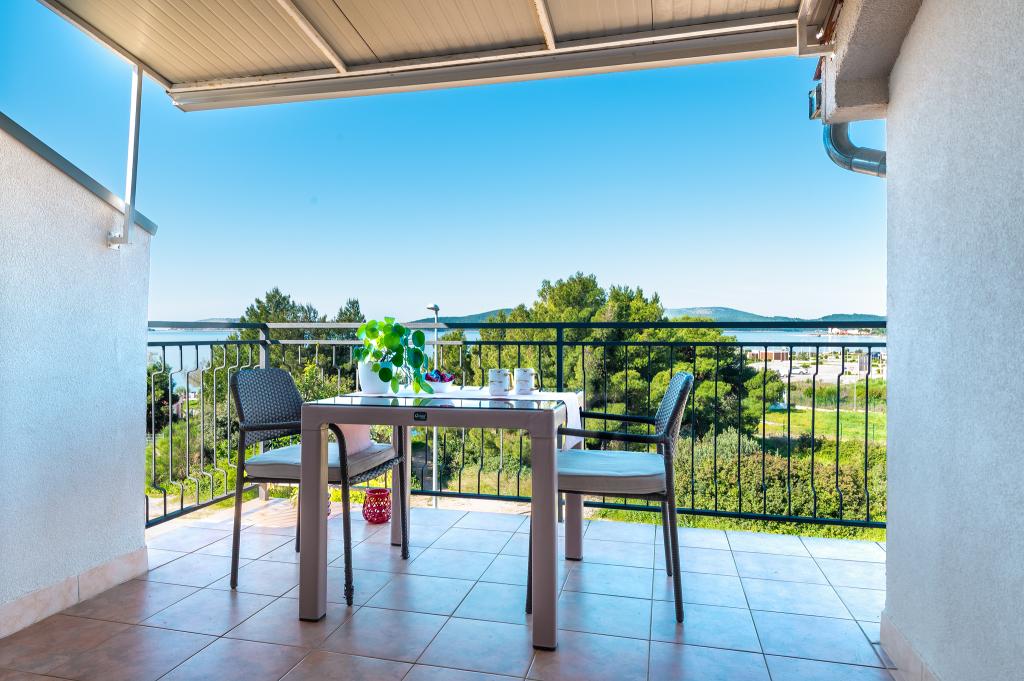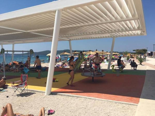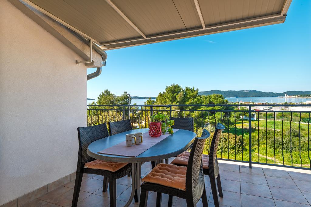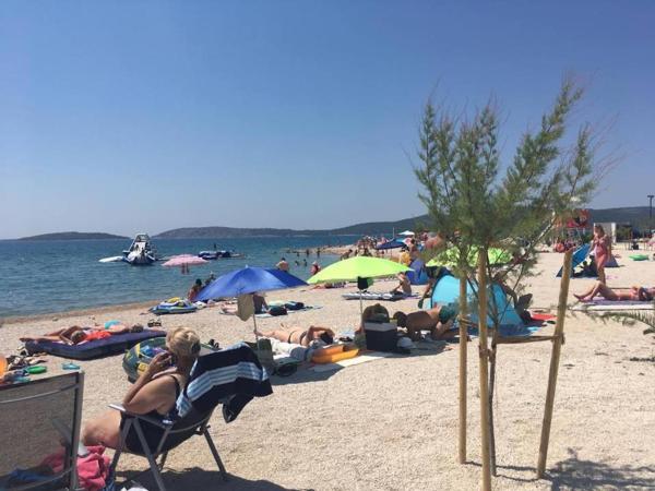 Apartmán v krásné části Brodarica. Výhled z terasy na pláži. velké parkoviště. Gril ve dvoře. vedle grilu je jídelní stůl u všech doprovodných zařízení. Solaris, Sibenik Národní parky Krka a Kornati Oscillační centra, dětské hřiště