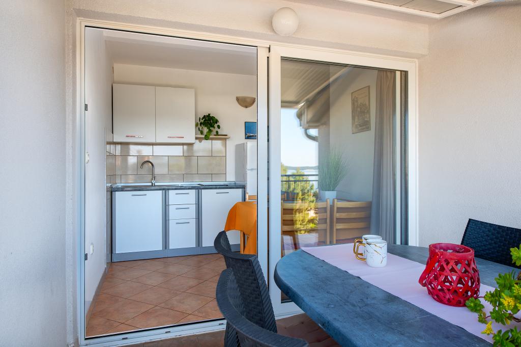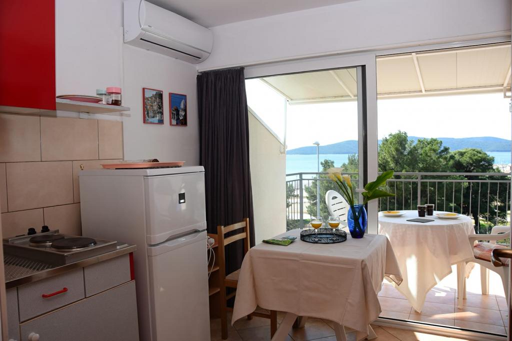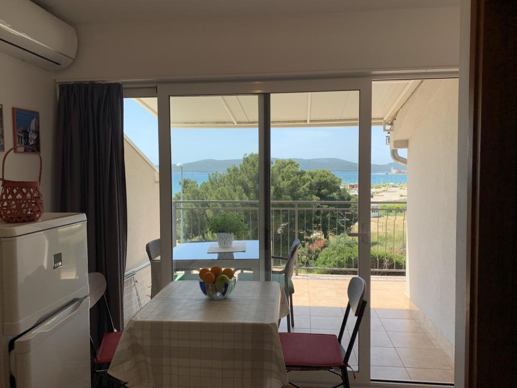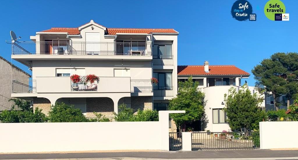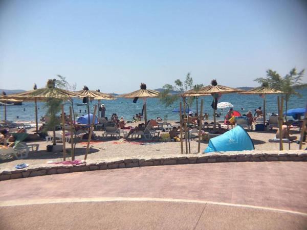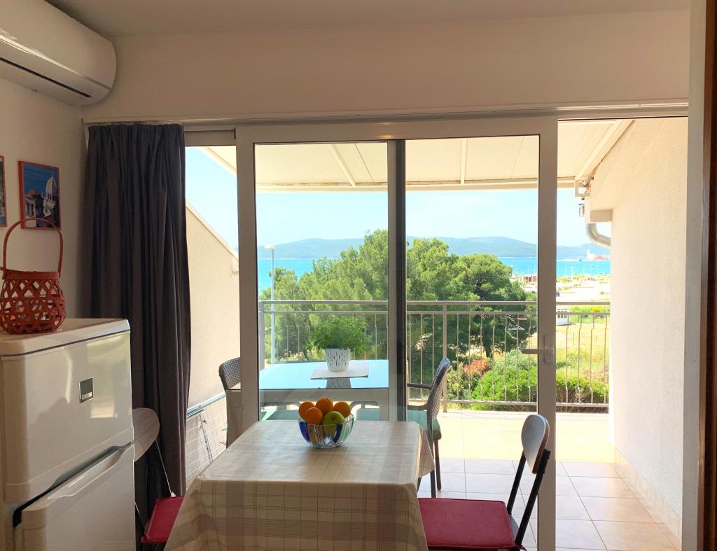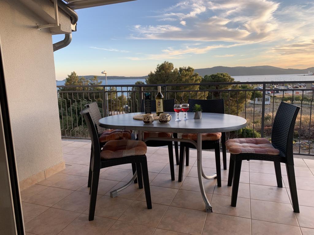 Apartmán v krásné části Brodarica. Výhled z terasy na pláži. velké parkoviště. Gril ve dvoře. vedle grilu je jídelní stůl u všech doprovodných zařízení. Solaris, Sibenik Národní parky Krka a Kornati Oscillační centra, dětské hřiště