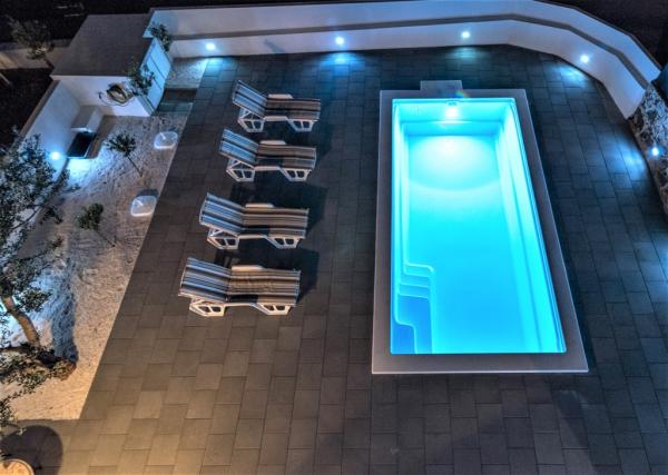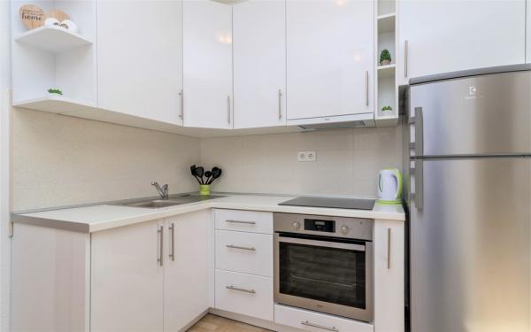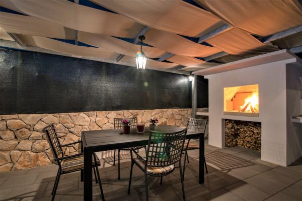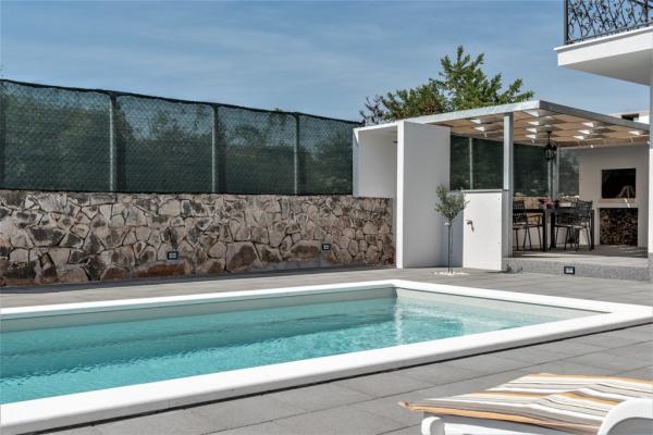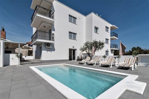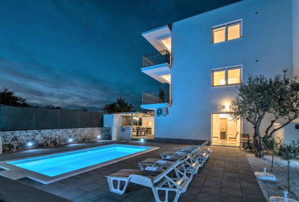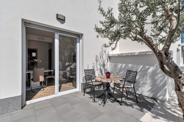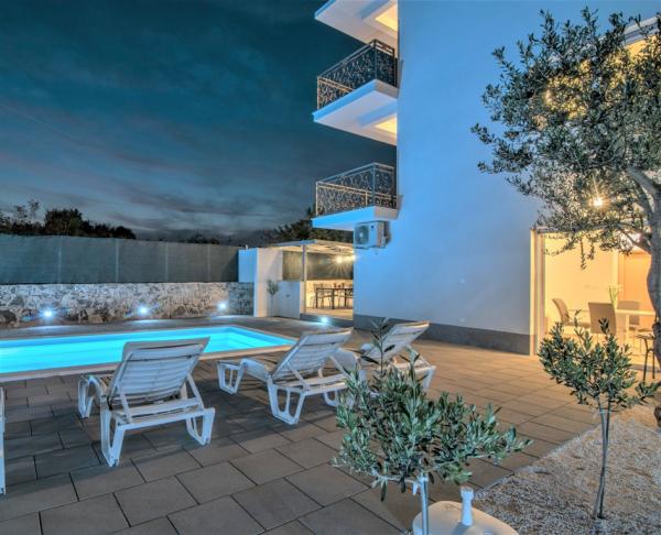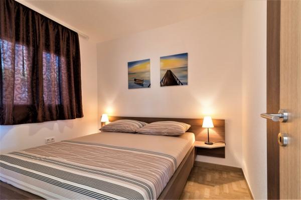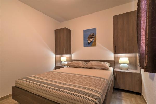 Pobytová taxa je v ceně.Byt se nachází v přízemí. Byt má dvě ložnice, obývací pokoj, kuchyň, koupelna a dvůr, který má 220 m2 s vlastním grilem a vlastním bazénem a parkovištěm.