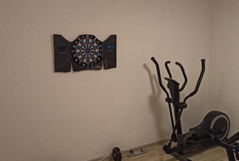 Zábavní a fitness místnost v suterénu, která je zahrnuta v ceně, je vybavena cvičebními stroji, eliptickým trenažérem, stolním fotbálkem, šipkami a jízdním kolem - ideální pro rekreaci a rodinnou zábavu.