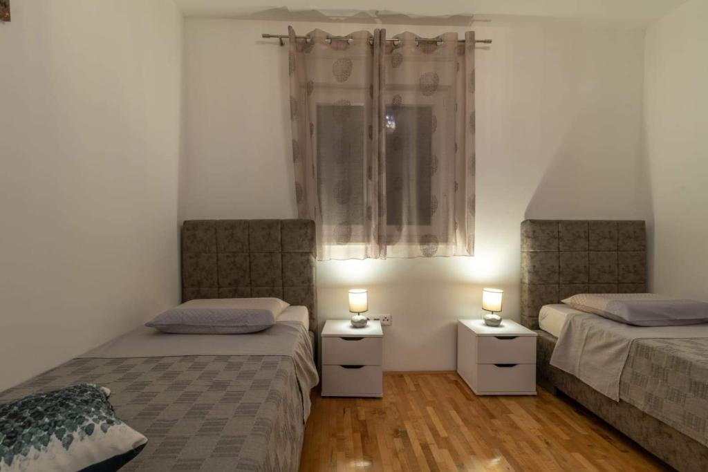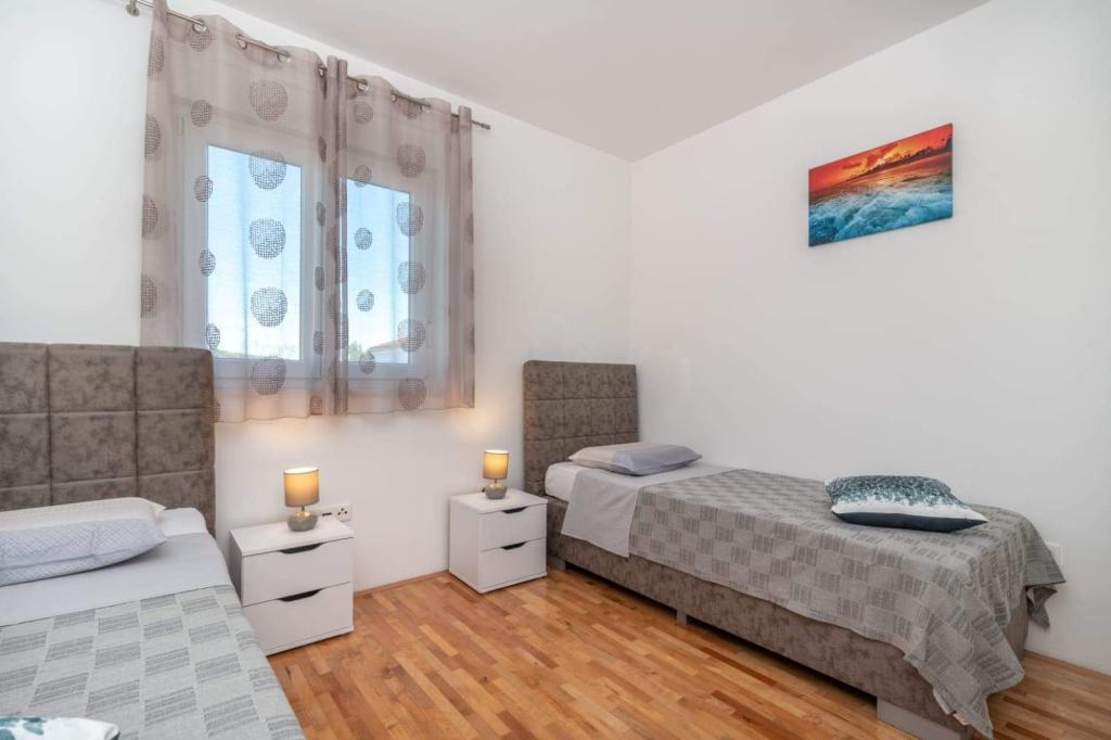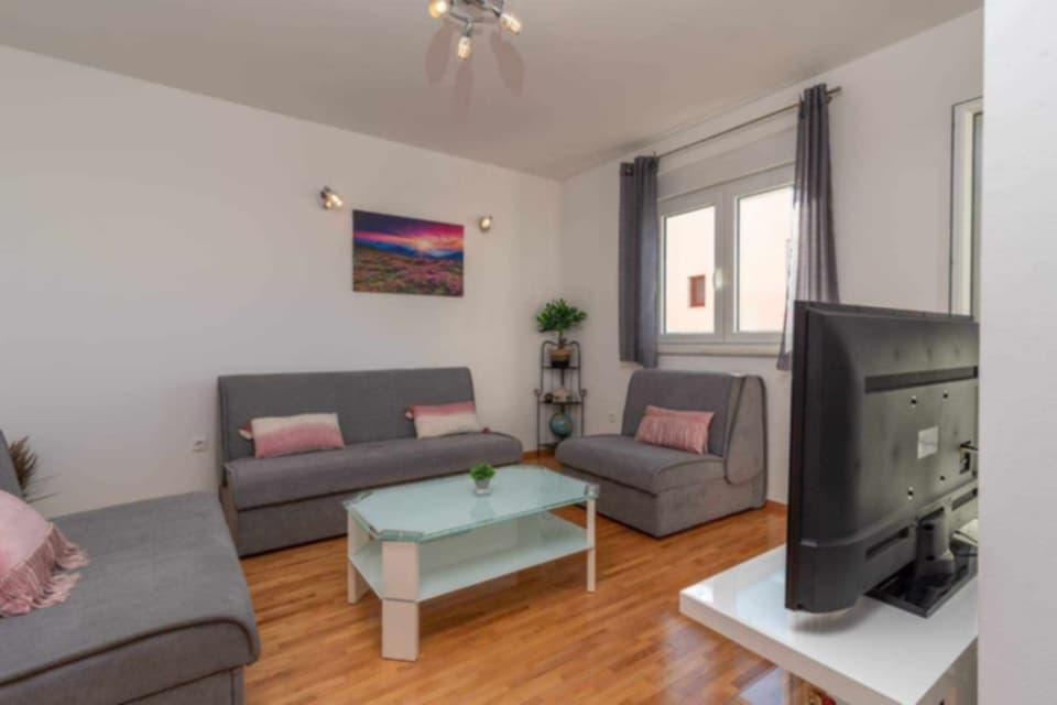 Apartmán se nachází na ostrově Čiovo, v klidné zátoce Okrug Gornji – Rastići, ideální pro rodinnou dovolenou. Je vzdálený 200 m od skalnatých pláží a 400 m od písečných pláží, zatímco slavná pláž Copacabana je vzdálená 1,6 km. Město Trogir, které je zapsáno na seznamu UNESCO, je vzdálené jen pár kilometrů. Apartmán se nachází v prvním patře, má rozlohu 72,5 m² s balkonem o velikosti 7 m² a může ubytovat až 6 osob (7 v případě potřeby), včetně dětské postýlky. Hosté mohou využívat klimatizaci, bezplatné Wi-Fi a soukromé parkovací místo. Zvláštností apartmánu je fitness centrum a herna v suterénu, které jsou zahrnuty v ceně a jsou vybaveny posilovacími stroji, eliptickým trenažérem, stolním fotbalem, šipkami a jízdním kolem – ideální pro rekreaci a rodinnou zábavu.