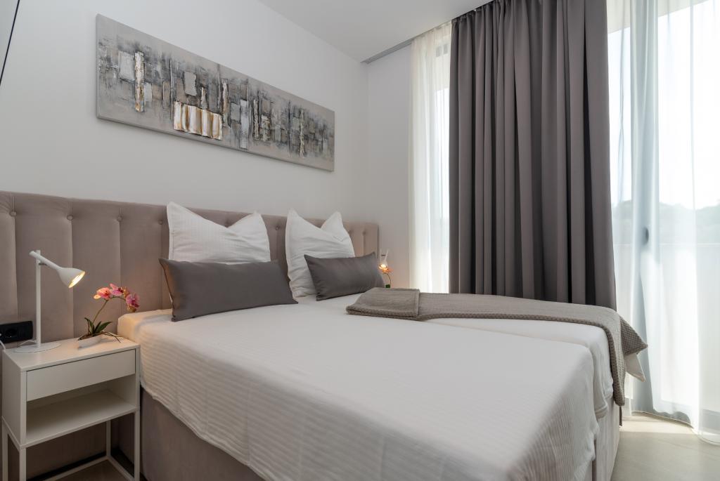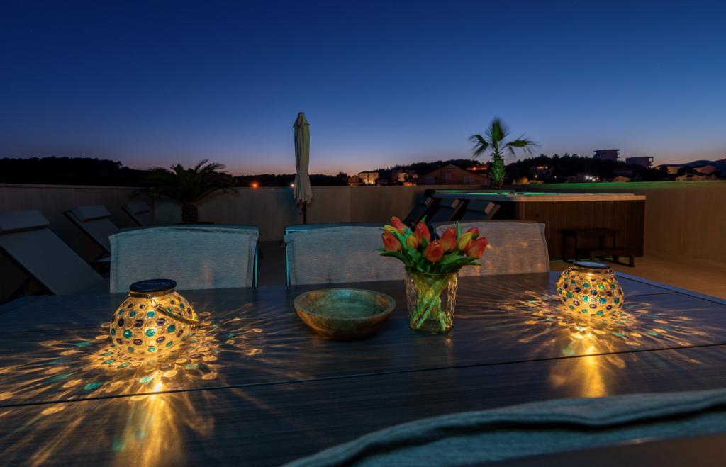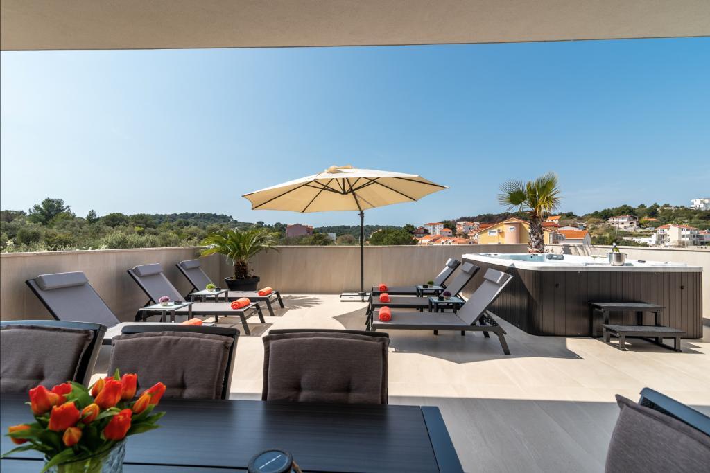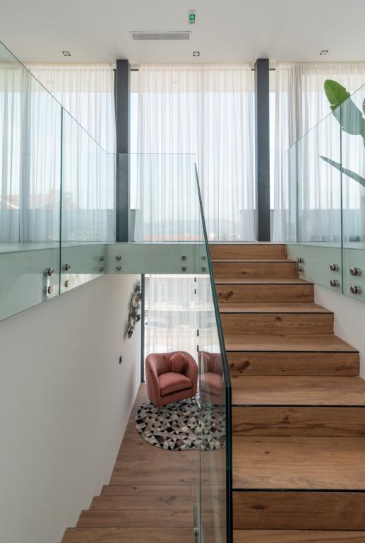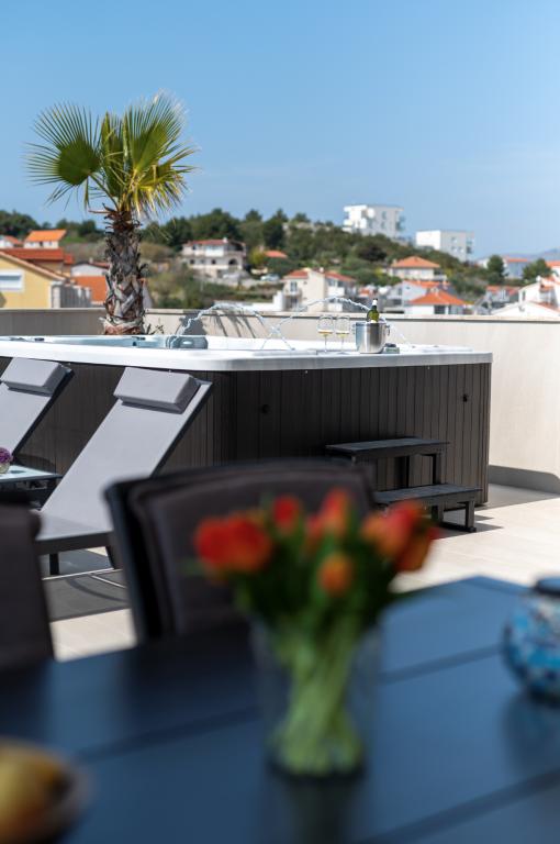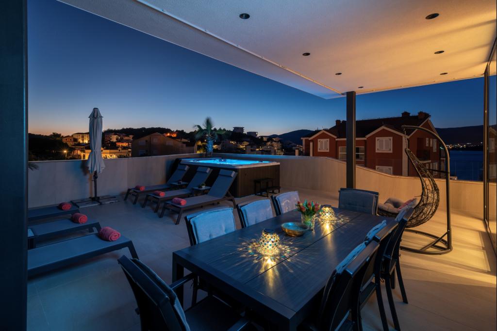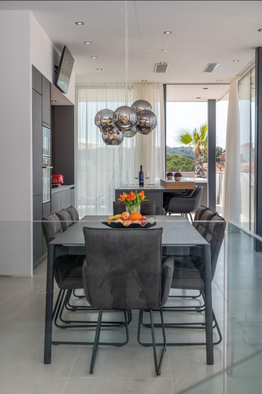 Penthouse Majestic je zcela nové luxusní mistrovské dílo ze skla a oceli s prostornými okny a krásným obývacím a jídelním koutem. Z plně vybavené kuchyně máte přímý přístup na fantastickou 360° terasu s výhledem na moře a olivový háj. Užijte si velkou terasu s panoramatickým výhledem, plynový gril, jídelní kout, prostor na opalování a naši SPA vířivku pro 8 osob. Velký penthouse s terasou 120 m2 zabírá celé třetí patro. Před vchodem jsou tři bezplatná parkovací místa, nabíjecí stanice pro elektromobily a malá garáž s elektřinou, do které se vejdou kola, kočárky, malé přívěsy, surfovací prkna atd. Penthouse nabízí čtyři elegantní dvoulůžkové pokoje a vlastní koupelny s přímý přístup na terasu, 360°, TV s plochou obrazovkou a bezplatné Wi-Fi. Dodatečnou relaxaci nabízí kombinovaná infrasauna se sprchou.