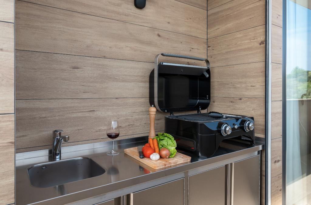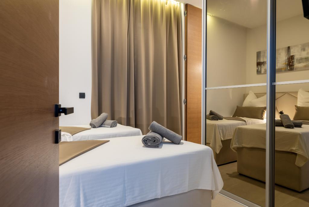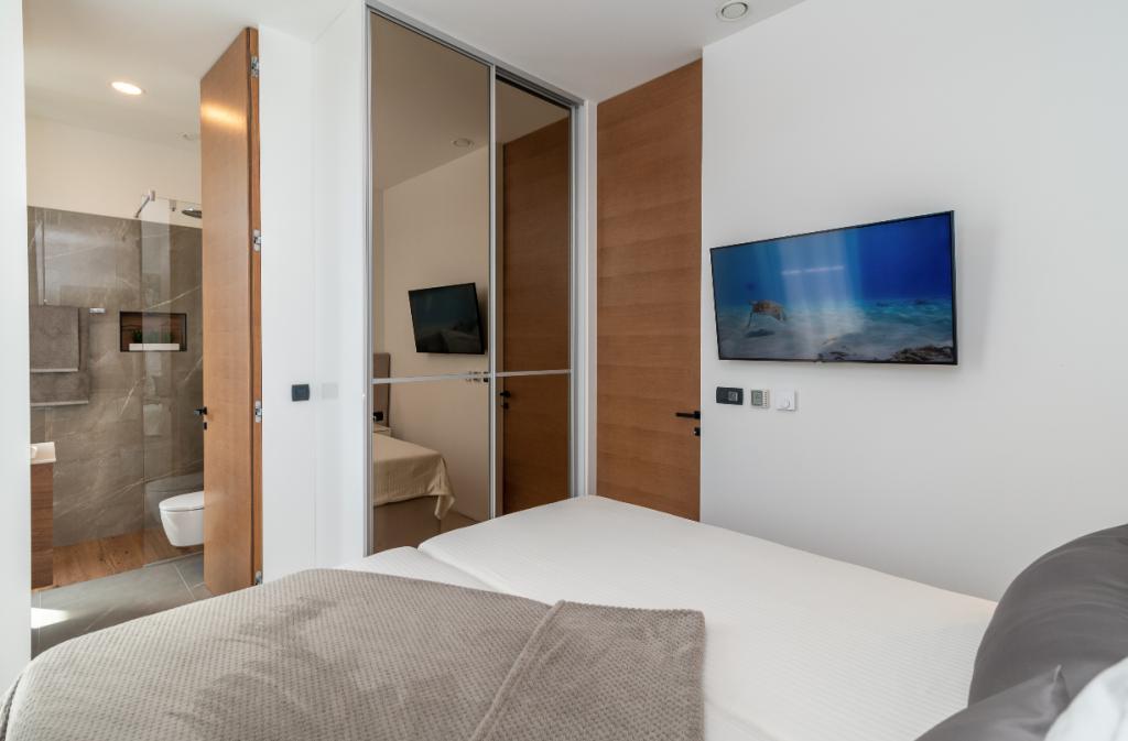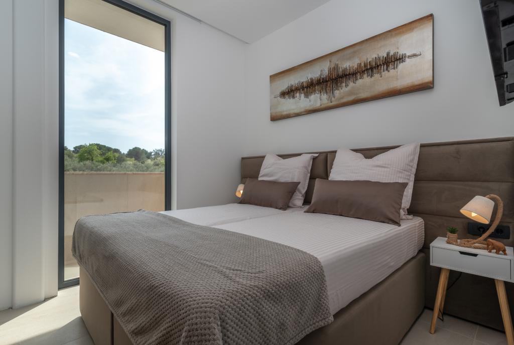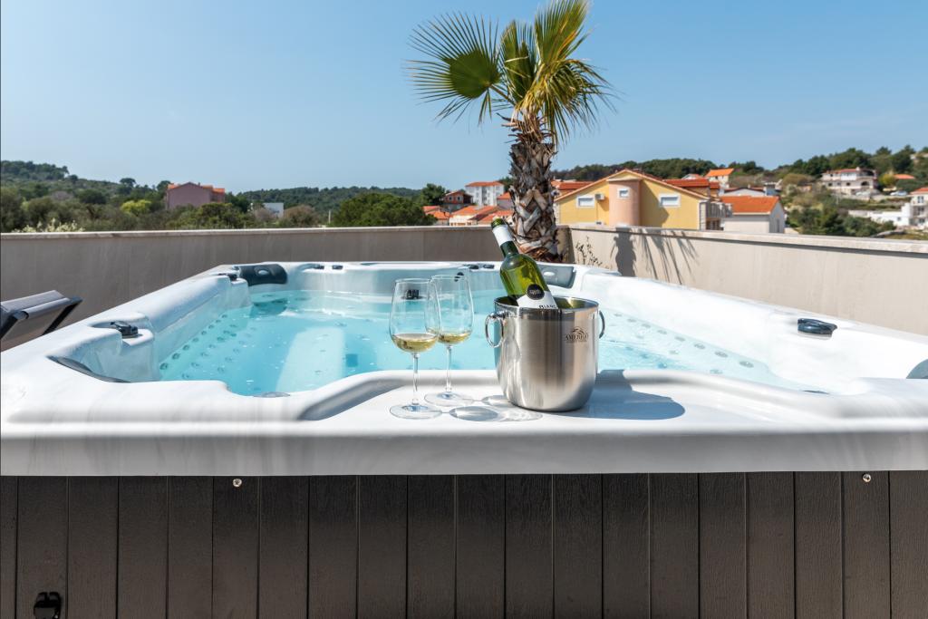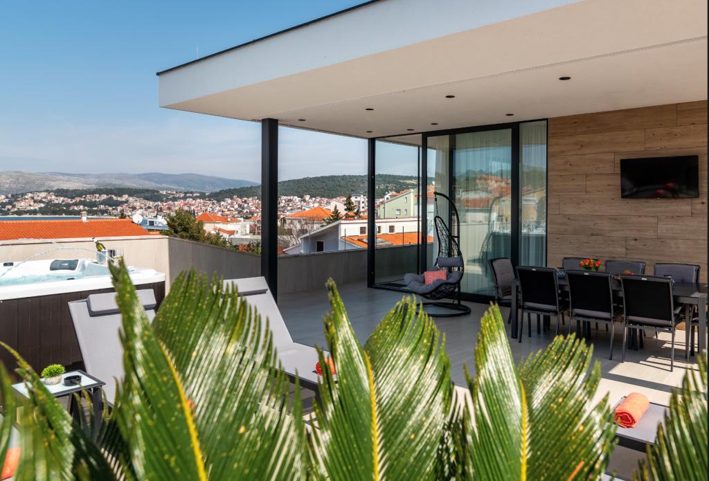 Penthouse Majestic je zcela nové luxusní mistrovské dílo ze skla a oceli s prostornými okny a krásným obývacím a jídelním koutem. Z plně vybavené kuchyně máte přímý přístup na fantastickou 360° terasu s výhledem na moře a olivový háj. Užijte si velkou terasu s panoramatickým výhledem, plynový gril, jídelní kout, prostor na opalování a naši SPA vířivku pro 8 osob. Velký penthouse s terasou 120 m2 zabírá celé třetí patro. Před vchodem jsou tři bezplatná parkovací místa, nabíjecí stanice pro elektromobily a malá garáž s elektřinou, do které se vejdou kola, kočárky, malé přívěsy, surfovací prkna atd. Penthouse nabízí čtyři elegantní dvoulůžkové pokoje a vlastní koupelny s přímý přístup na terasu, 360°, TV s plochou obrazovkou a bezplatné Wi-Fi. Dodatečnou relaxaci nabízí kombinovaná infrasauna se sprchou.