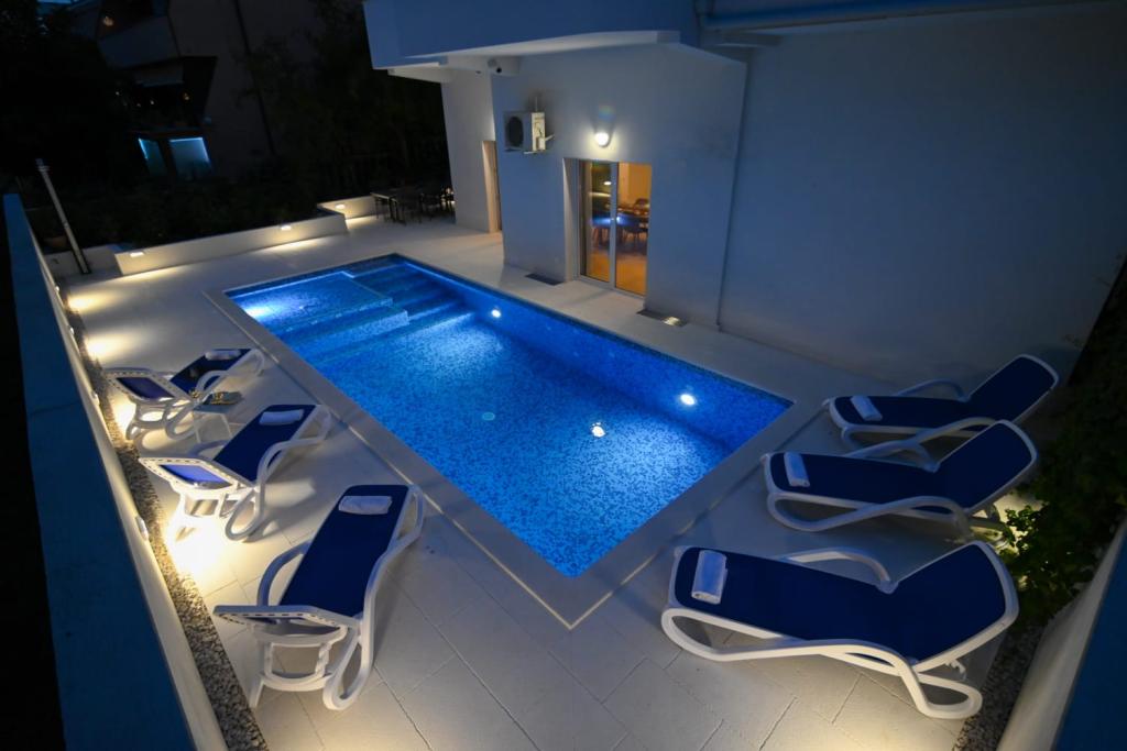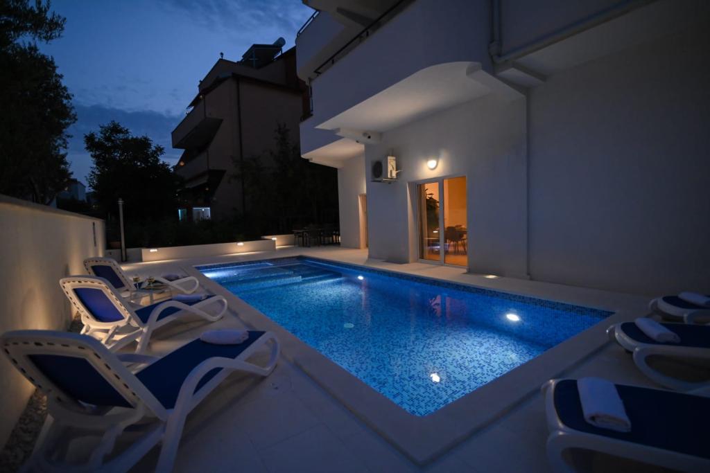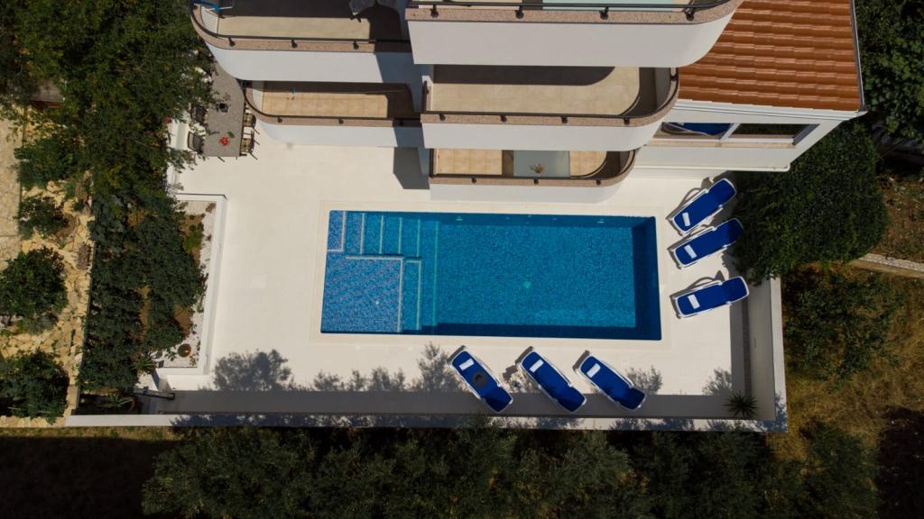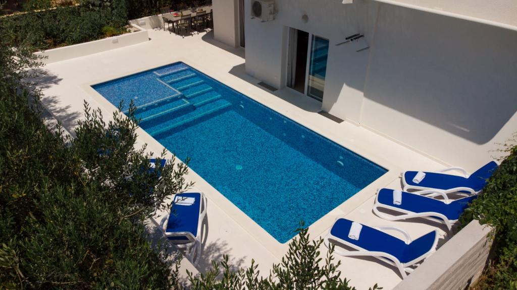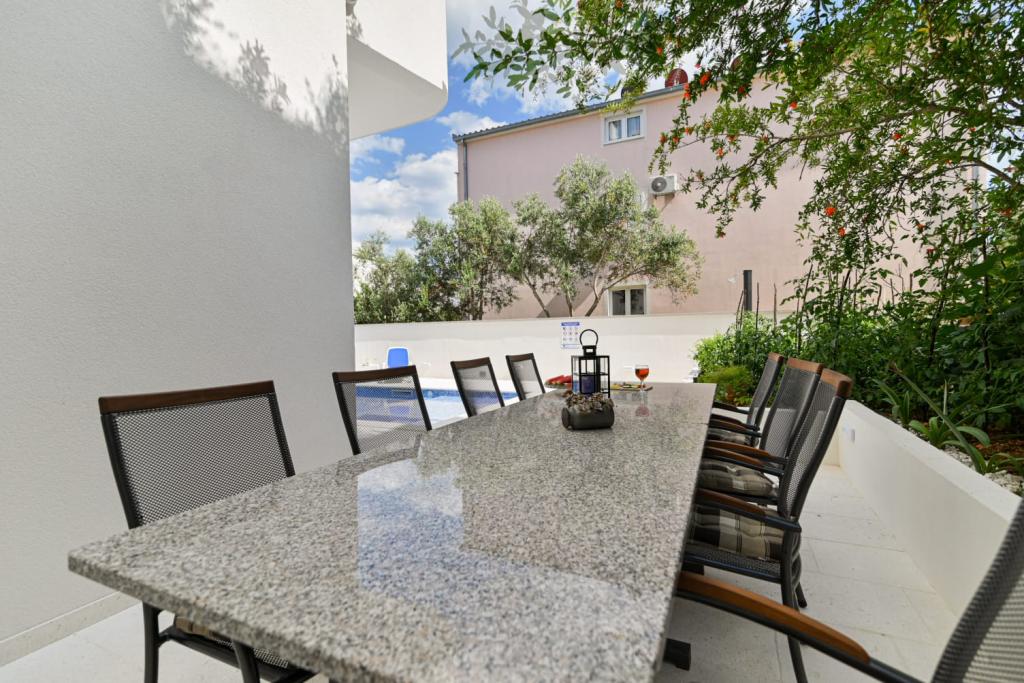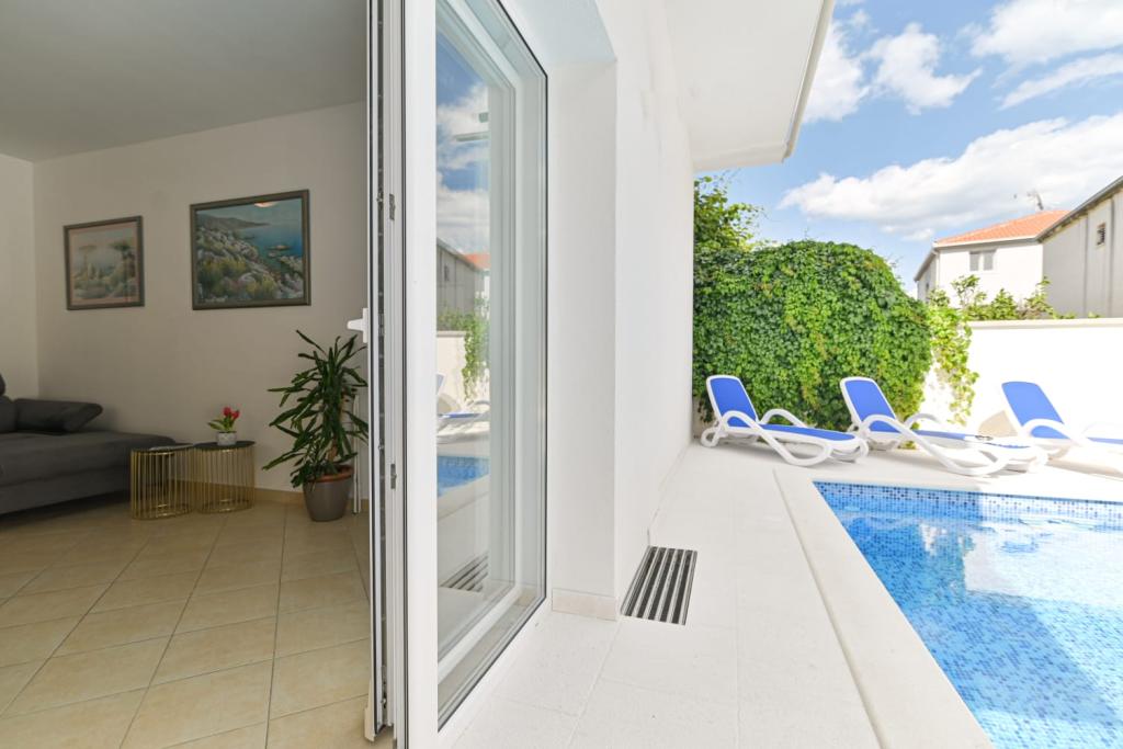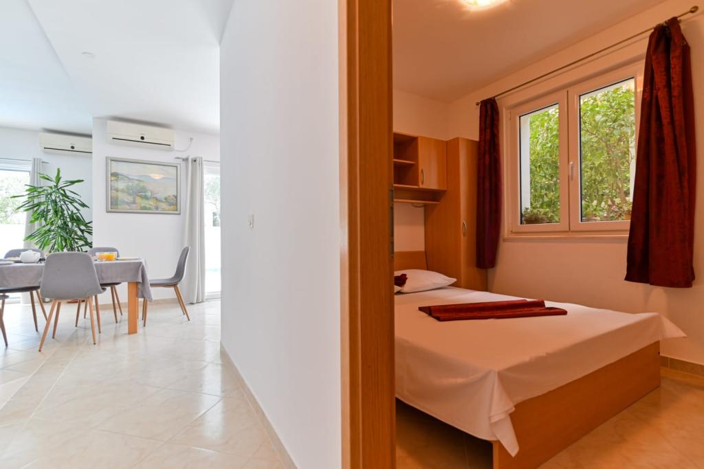 Na jižní straně ostrova Čiovo, který je spojen dvěma mosty se starým a historickým městem Trogir a pevninou, 200 m od křišťálově čistého moře a pláže, vám nabízíme plně vybavený apartmán s vlastním bazénem . Apartmán se dvěma ložnicemi se nachází v přízemí, před kterým je soukromý bazén a gril. Parkování je zajištěno uvnitř budovy.