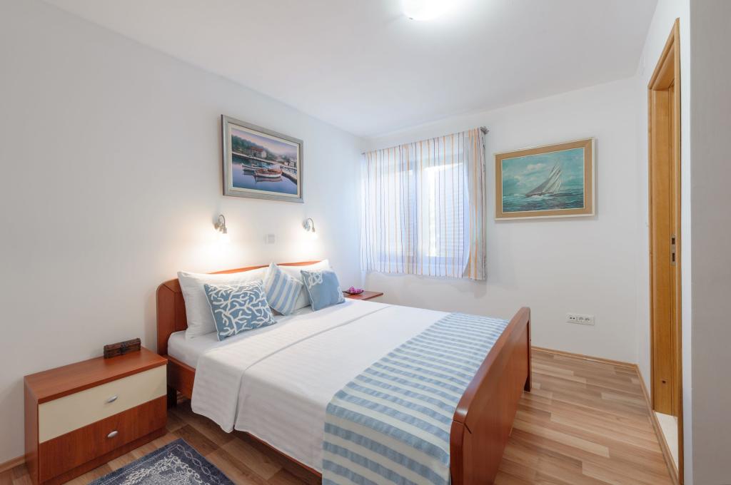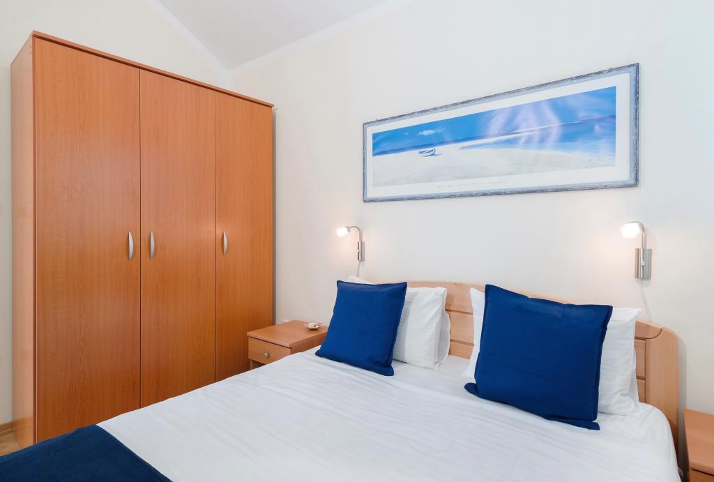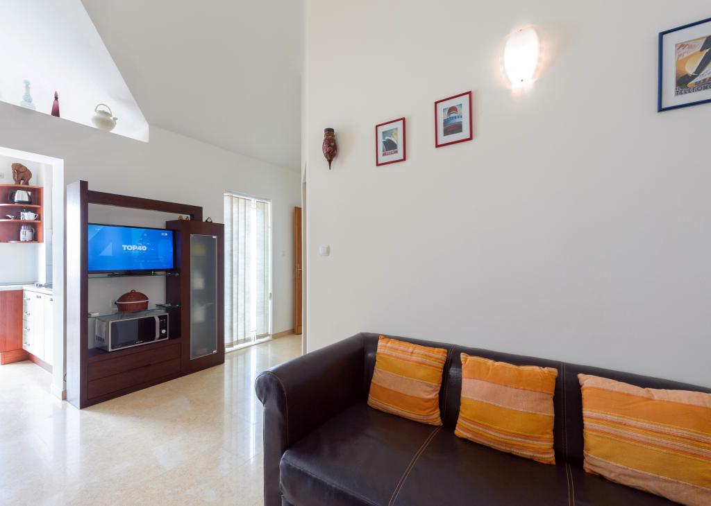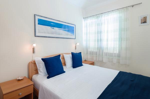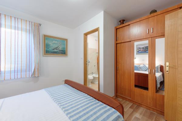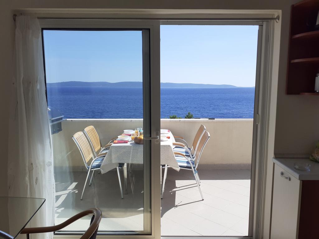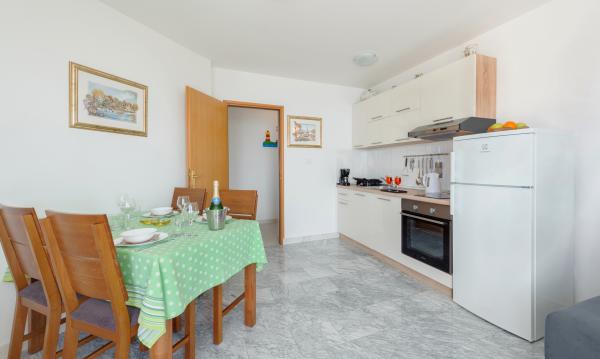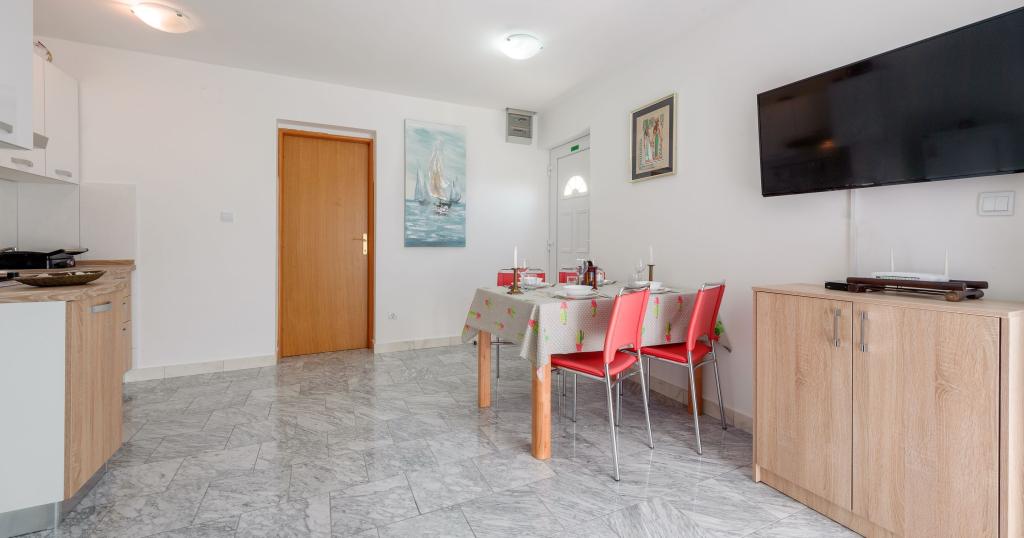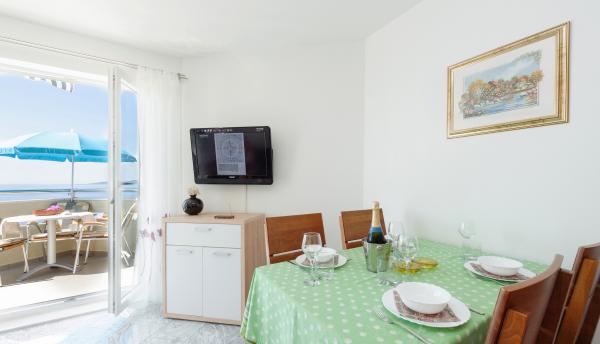 Byli jsme dva v bytě pro max. Lidi, ložnici s velkou postelí a obývací pokoj s kuchyňským koutem, rozkládací pohovkou a přístupem na velký balkon se stolem. Krásný výhled na moře, pěkný velký obývací pokoj. klimatizace samozřejmě. V chladničce na nás čekaly chladné nápoje, ve skříních domácí olivový olej, smažící olej, mouka, sůl a cukr, vinný ocet a pepř. V přízemí kamenný gril se stolem vedle něj. Dostatek parkování, v blízkosti moře a skvělá rodinná restaurace (ceny nižší než ve městě)