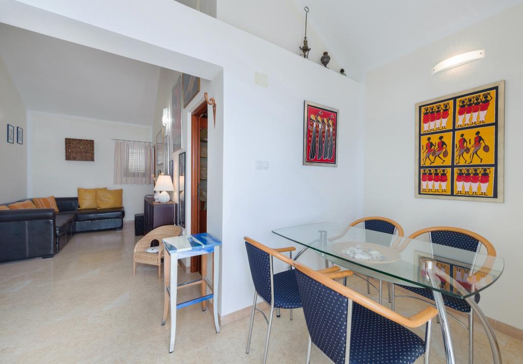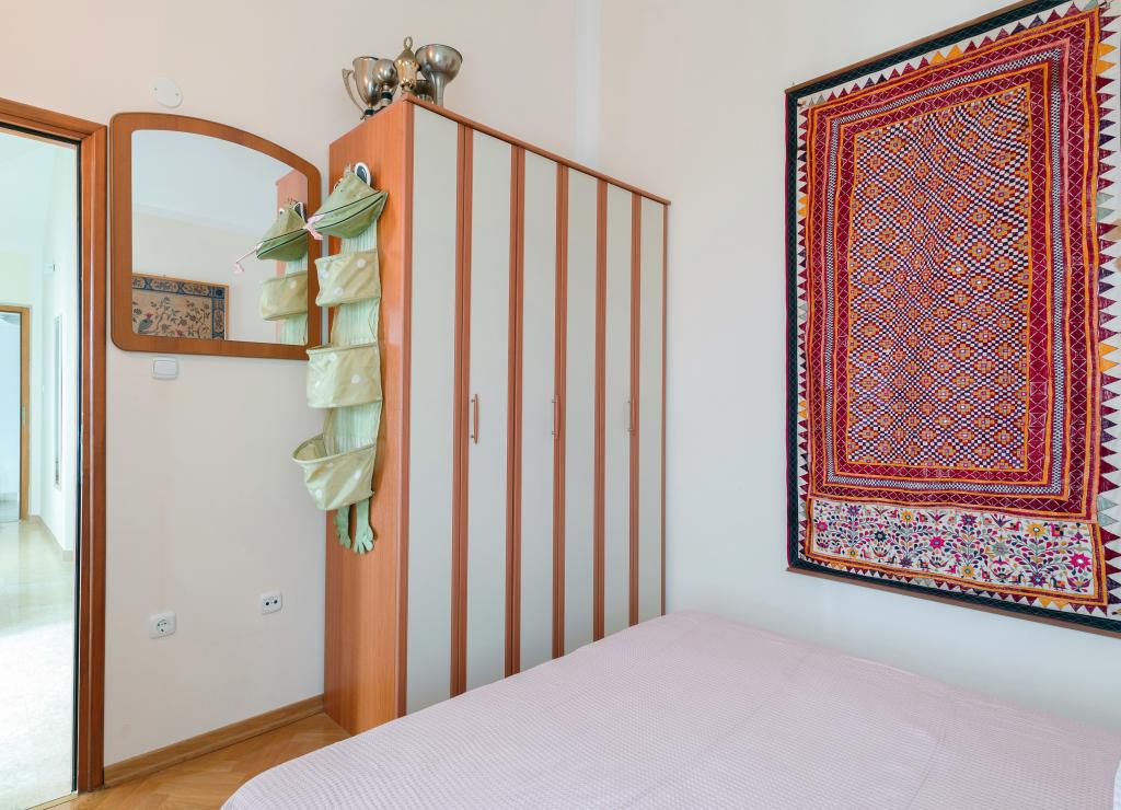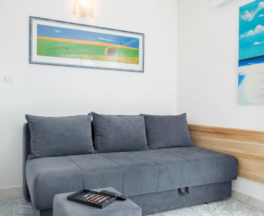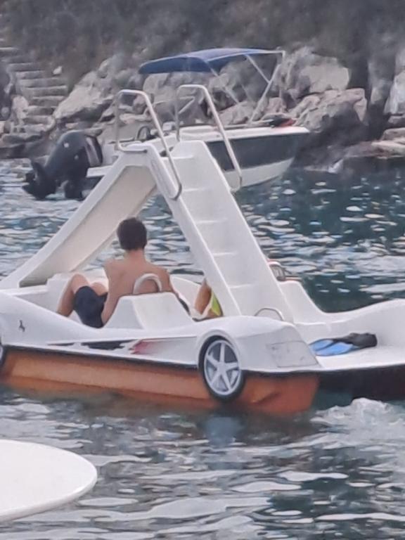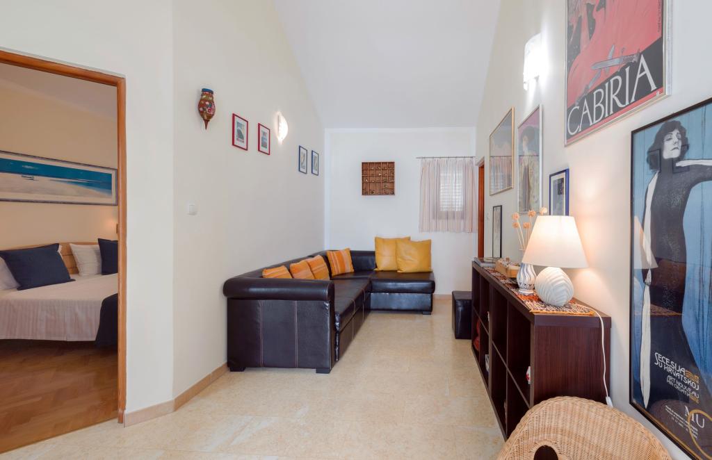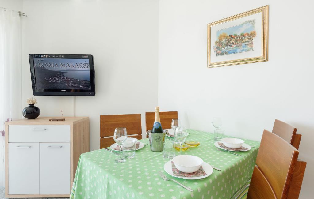 Byli jsme dva v bytě pro max. Lidi, ložnici s velkou postelí a obývací pokoj s kuchyňským koutem, rozkládací pohovkou a přístupem na velký balkon se stolem. Krásný výhled na moře, pěkný velký obývací pokoj. klimatizace samozřejmě. V chladničce na nás čekaly chladné nápoje, ve skříních domácí olivový olej, smažící olej, mouka, sůl a cukr, vinný ocet a pepř. V přízemí kamenný gril se stolem vedle něj. Dostatek parkování, v blízkosti moře a skvělá rodinná restaurace (ceny nižší než ve městě)
