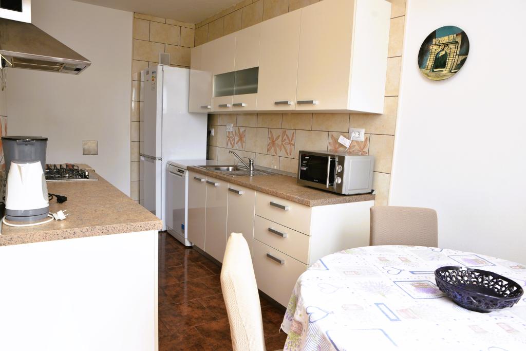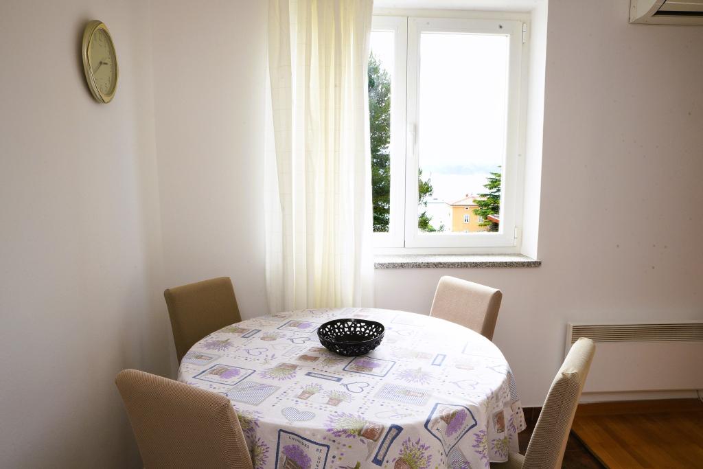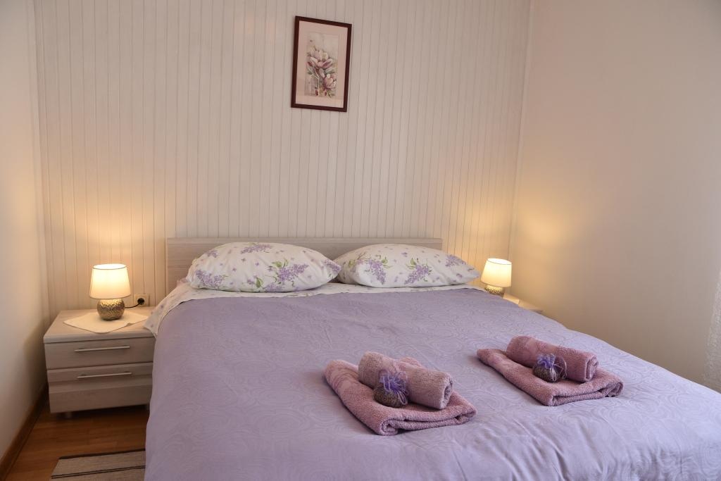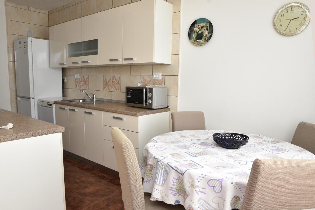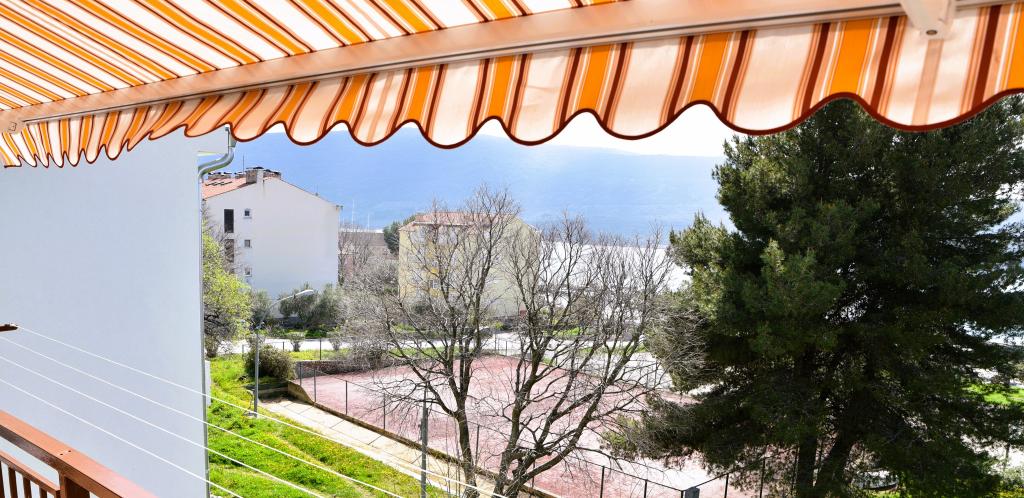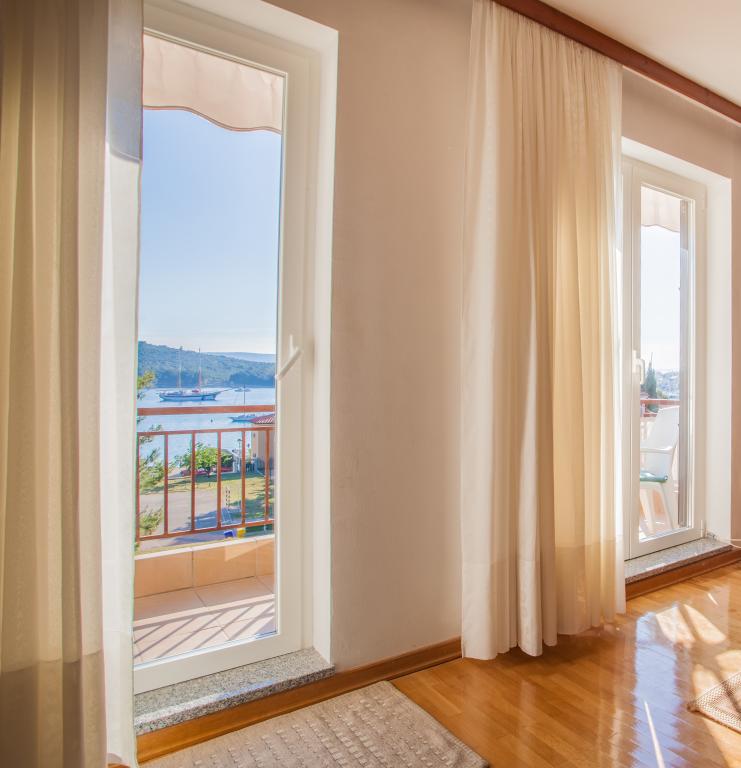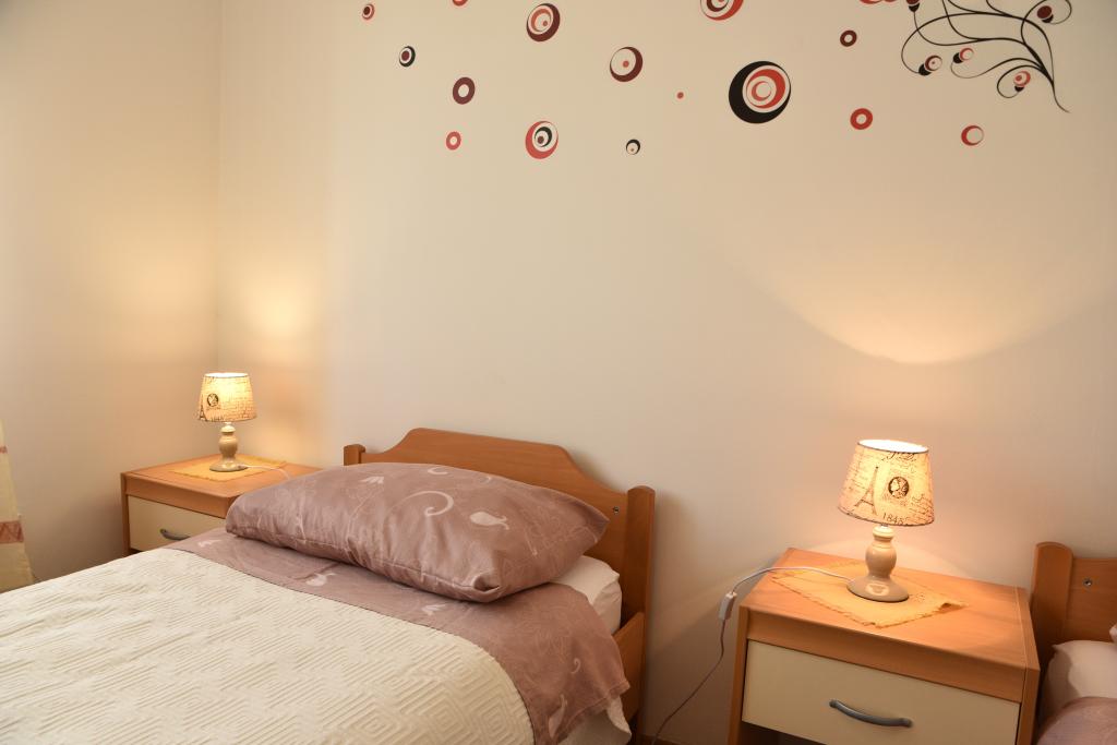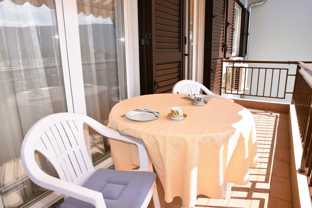 Apartmán s výhledem na moře se nachází na klidném místě ve druhém (posledním) patře malé budovy, 100 metrů od oblázkové pláže. Před budovou je bezplatné veřejné parkoviště s vyhrazeným parkovacím místem. Apartmán (67 m2) má dvě ložnice, plně vybavenou kuchyň, koupelnu, obývací pokoj a balkon s výhledem na moře. Zdarma je k dispozici WI-FI. Byt se nachází 5 minut chůze od oblázkové pláže a 10 minut chůze od centra. Nejbližší obchod, kavárna a restaurace jsou od apartmánů vzdálené 3 minuty chůze.