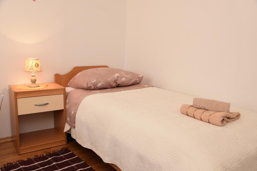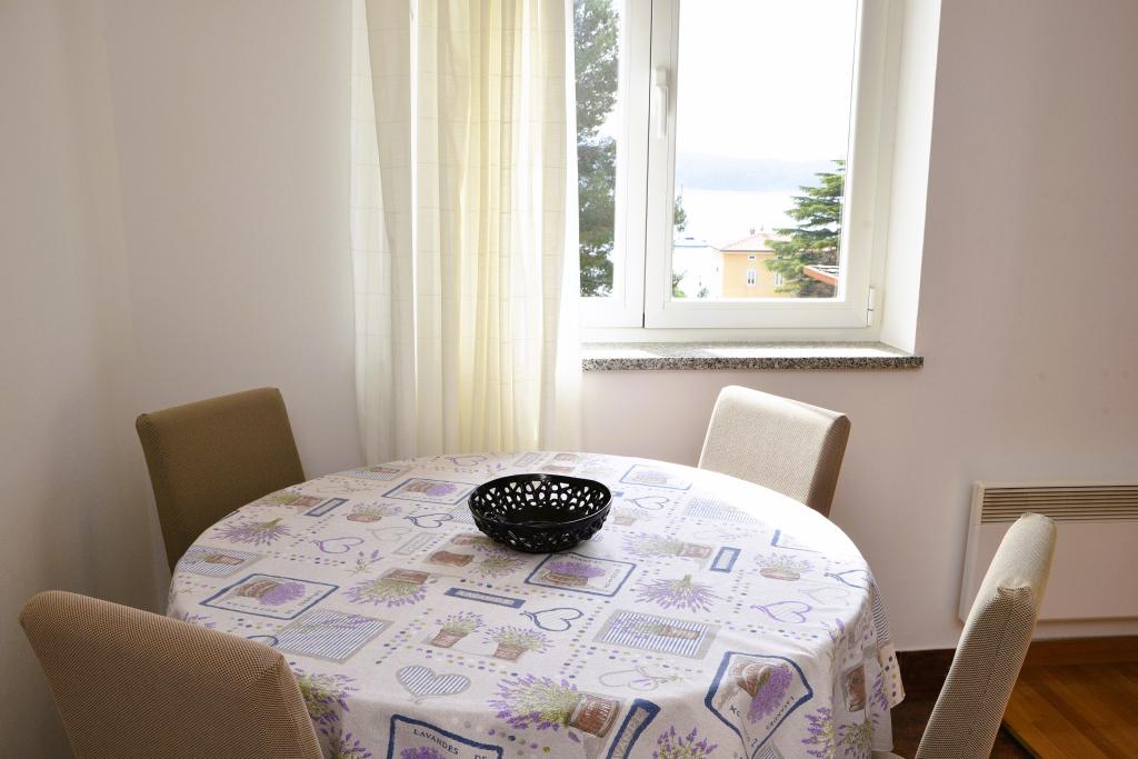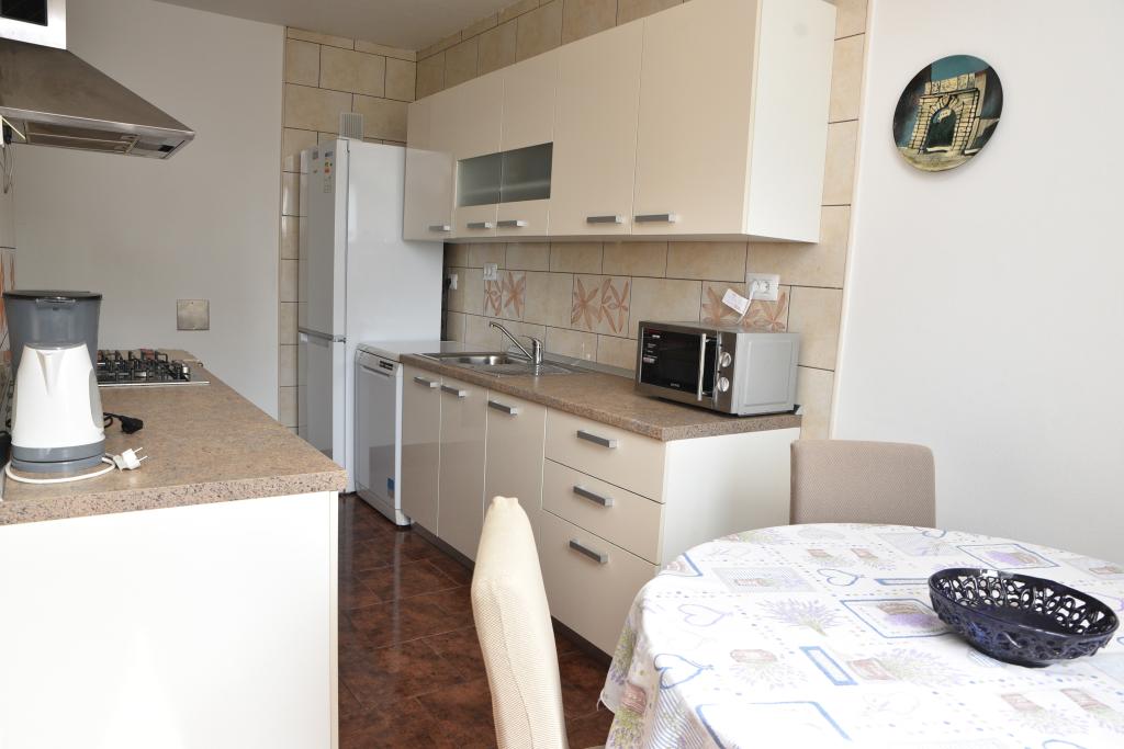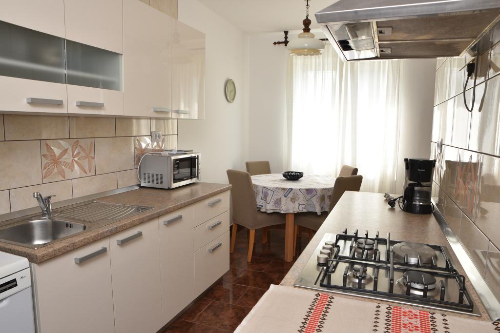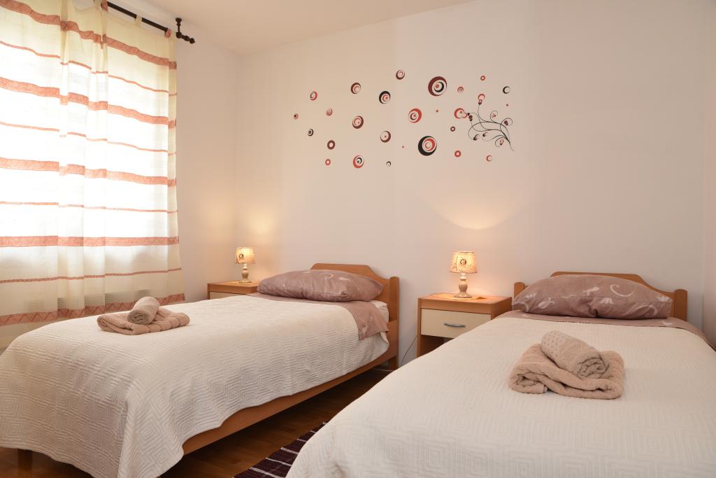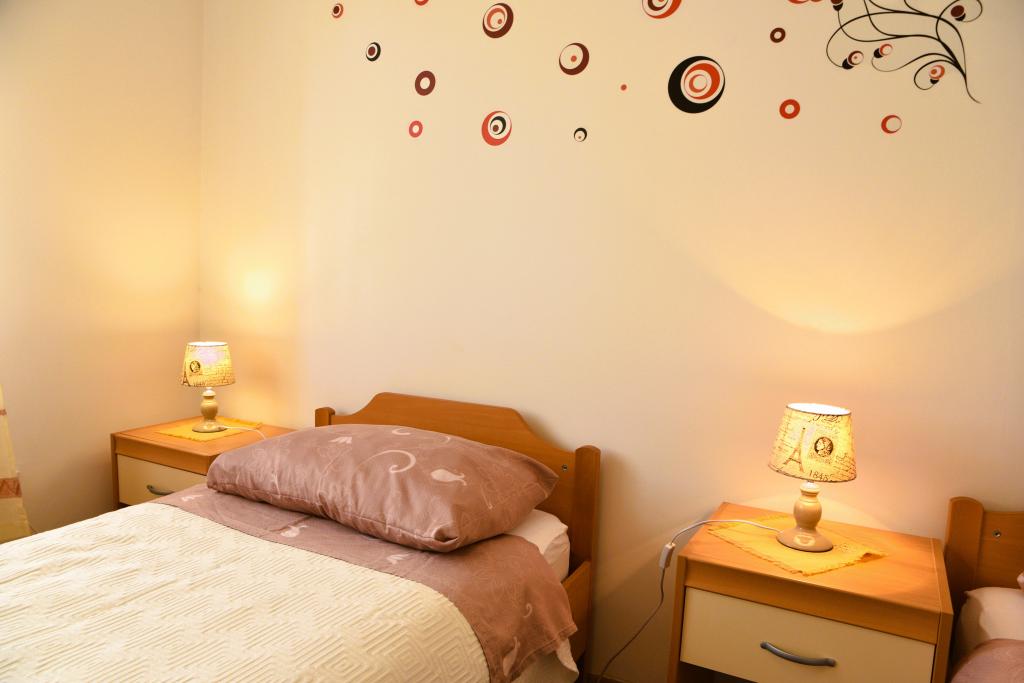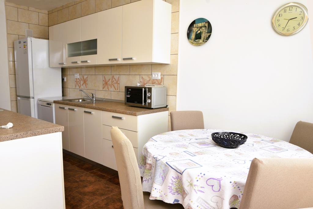 Apartmán s výhledem na moře se nachází na klidném místě ve druhém (posledním) patře malé budovy, 100 metrů od oblázkové pláže. Před budovou je bezplatné veřejné parkoviště s vyhrazeným parkovacím místem. Apartmán (67 m2) má dvě ložnice, plně vybavenou kuchyň, koupelnu, obývací pokoj a balkon s výhledem na moře. Zdarma je k dispozici WI-FI. Byt se nachází 5 minut chůze od oblázkové pláže a 10 minut chůze od centra. Nejbližší obchod, kavárna a restaurace jsou od apartmánů vzdálené 3 minuty chůze.