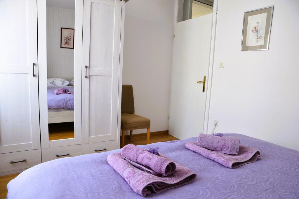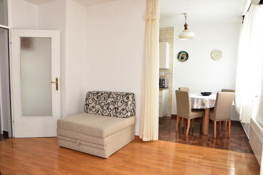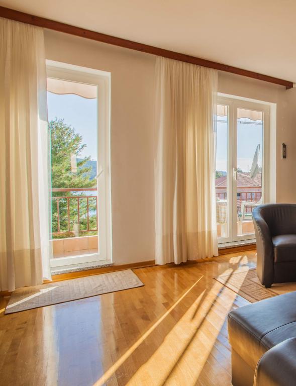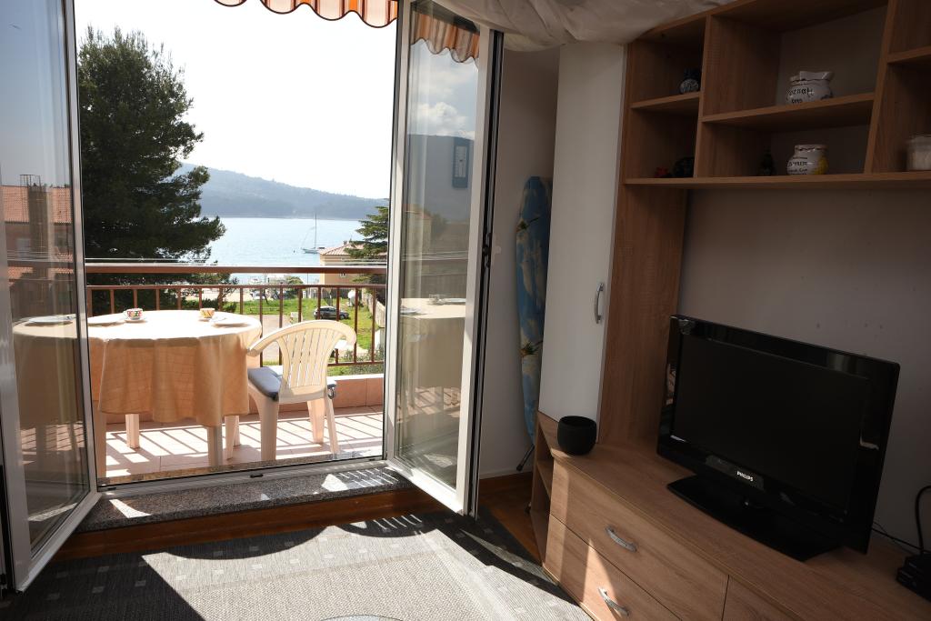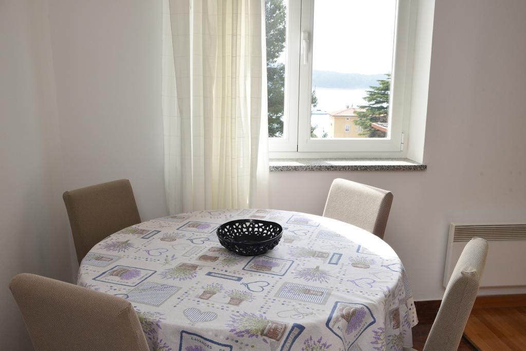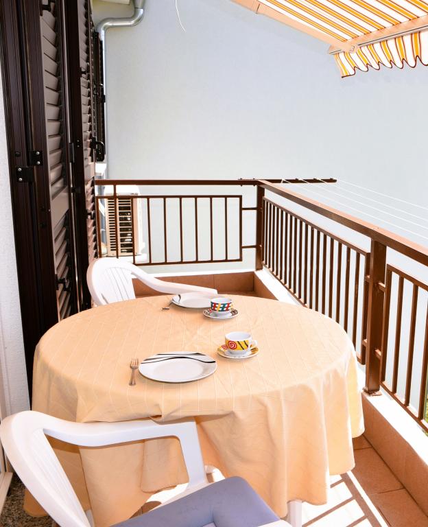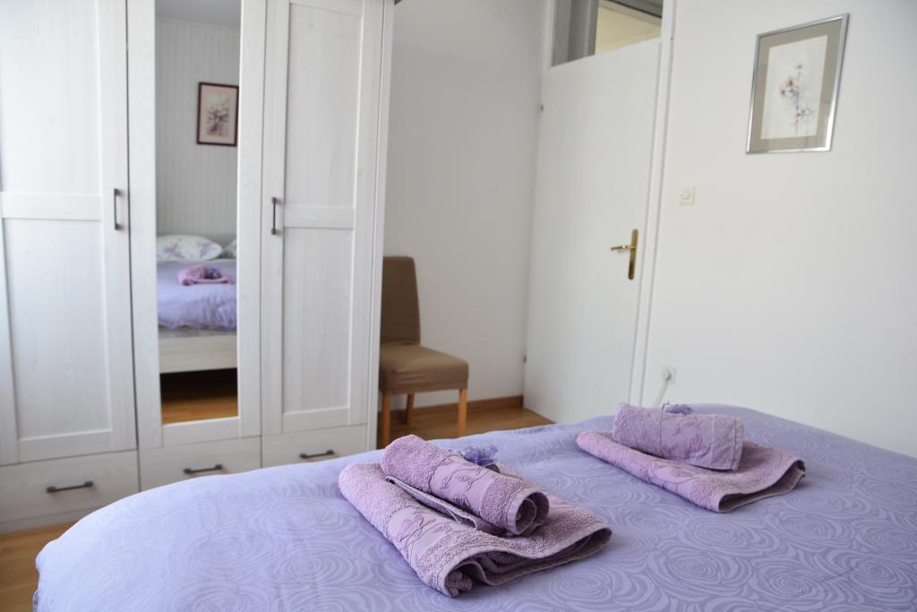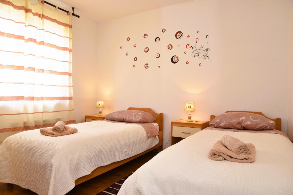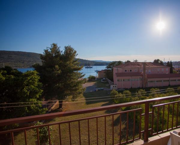 Apartmán s výhledem na moře se nachází na klidném místě ve druhém (posledním) patře malé budovy, 100 metrů od oblázkové pláže. Před budovou je bezplatné veřejné parkoviště s vyhrazeným parkovacím místem. Apartmán (67 m2) má dvě ložnice, plně vybavenou kuchyň, koupelnu, obývací pokoj a balkon s výhledem na moře. Zdarma je k dispozici WI-FI. Byt se nachází 5 minut chůze od oblázkové pláže a 10 minut chůze od centra. Nejbližší obchod, kavárna a restaurace jsou od apartmánů vzdálené 3 minuty chůze.