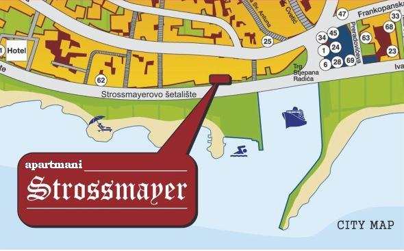 Apartmány Strossmayer se nacházejí na nejkrásnější části staré Crikvenické riviéry na promenádě přímo naproti balustradské pláži ve Strossmayerově 2 a 3 zastávkách, pouhých 50 metrů od hlavního náměstí a starého přístavu a 100 metrů od hlavní městské pláže. Hosté mají k dispozici dva nově zrekonstruované apartmány KORANA se 4 hvězdami pro 2 osoby s přistýlkou v 1. patře s výhledem na náměstí a pláž, dva studio apartmány ZLATA s 3 hvězdičkami pro 2 osoby s přistýlkou jedna z nich v 1. patře s výhledem na náměstí a pláž, zatímco druhý je v druhé polovině bez výhledu na moře. Apartmány nemají parkoviště je stejné platí za den