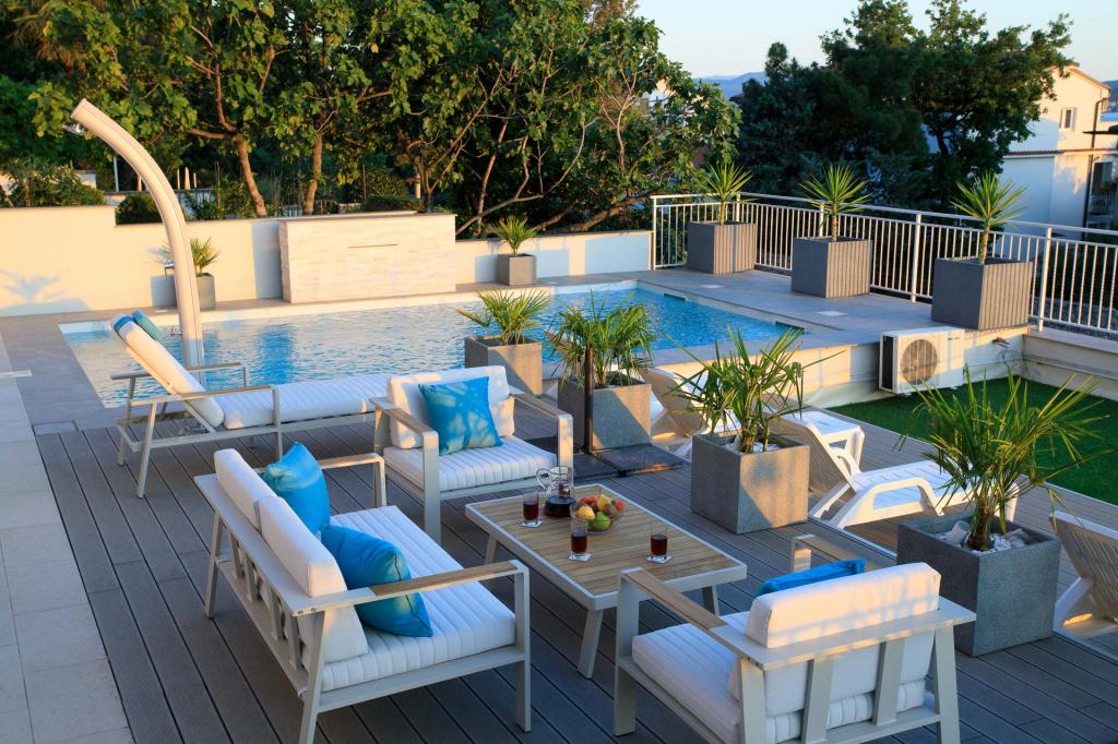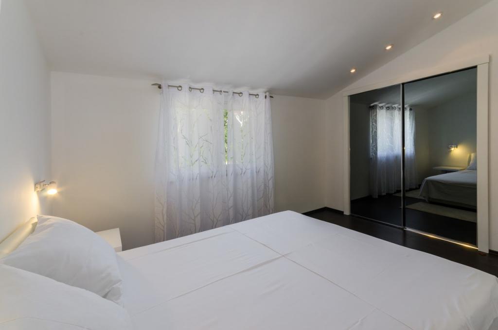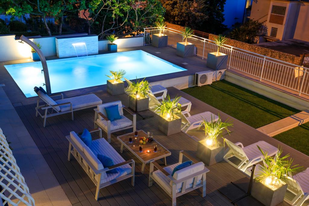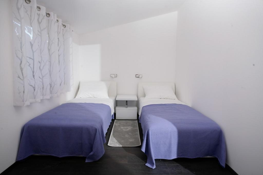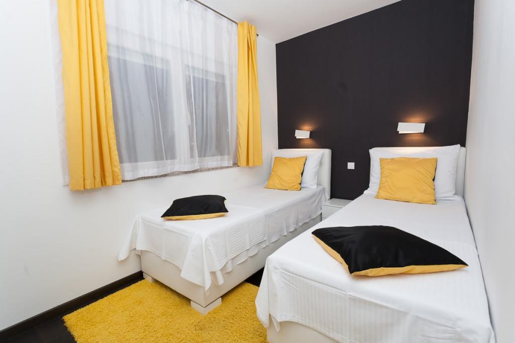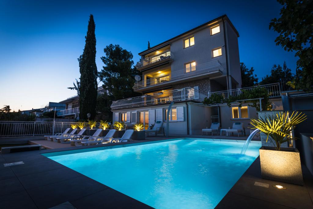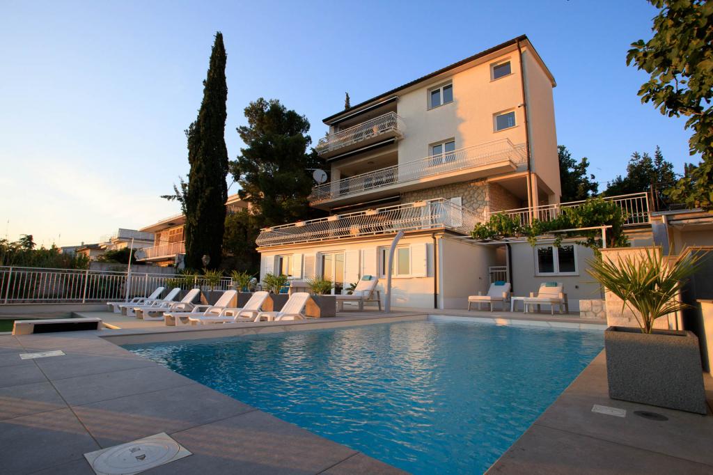 Moderně vybavené, luxusní 4hvězdičkové apartmány, klimatizace a internet zdarma. Možnost ubytování jedné další osoby na přistýlce (15€/den). Domácí zvířata povolena (10 €/den). Použití pračky (7 eur za praní). Apartmány se skládají ze dvou ložnic, obývacího pokoje, kuchyně, koupelny s WC a dalšího samostatného WC. Na jižní straně domu má každý apartmán terasu s výhledem na moře a bazén. Bazén je ekologický, což znamená, že nedochází k žádnému zápachu chlóru ani podráždění očí a pokožky. Velmi bezpečné pro zdraví dětí. Každý apartmán má vlastní parkoviště, které je hlídané 24 hodin denně. V přízemí domu je obchod s potravinami a nápoji. Na nejbližší pláž dojdete za 4 minuty. Objekt se nachází 20 minut chůze od centra města, je zde možnost dopravy turistickým vláčkem, jehož zastávka je před domem.