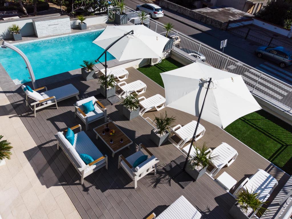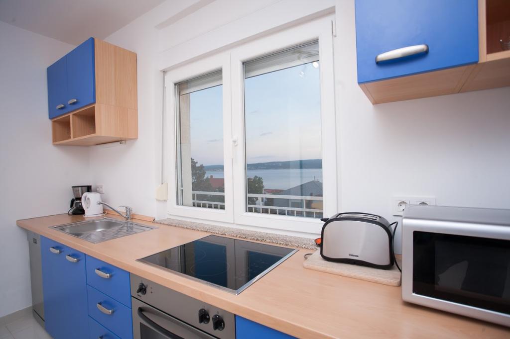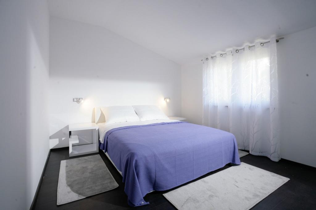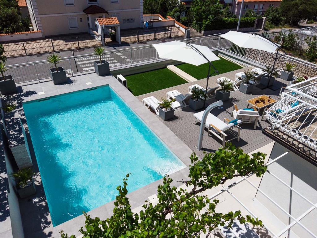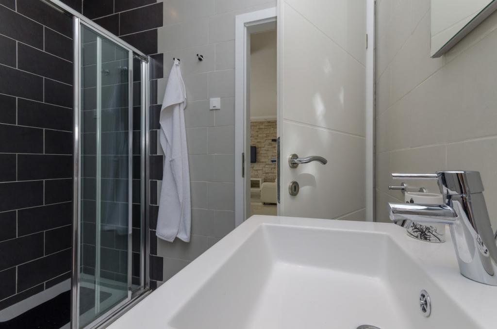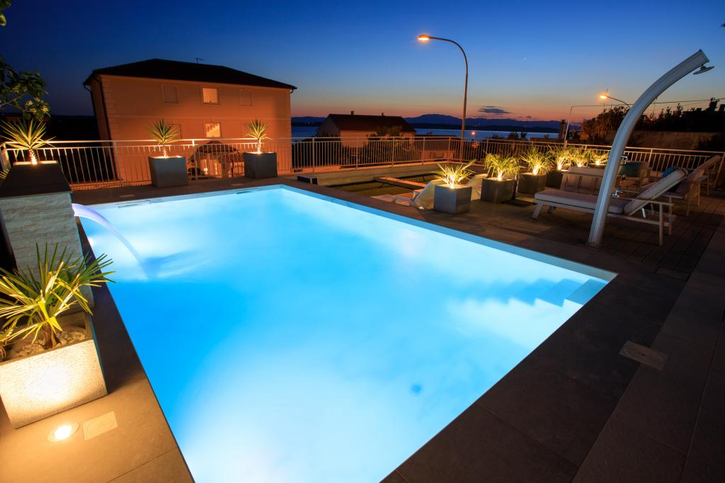 Moderně vybavené, luxusní 4hvězdičkové apartmány, klimatizace a internet zdarma. Možnost ubytování jedné další osoby na přistýlce (15€/den). Domácí zvířata povolena (10 €/den). Použití pračky (7 eur za praní). Apartmány se skládají ze dvou ložnic, obývacího pokoje, kuchyně, koupelny s WC a dalšího samostatného WC. Na jižní straně domu má každý apartmán terasu s výhledem na moře a bazén. Bazén je ekologický, což znamená, že nedochází k žádnému zápachu chlóru ani podráždění očí a pokožky. Velmi bezpečné pro zdraví dětí. Každý apartmán má vlastní parkoviště, které je hlídané 24 hodin denně. V přízemí domu je obchod s potravinami a nápoji. Na nejbližší pláž dojdete za 4 minuty. Objekt se nachází 20 minut chůze od centra města, je zde možnost dopravy turistickým vláčkem, jehož zastávka je před domem.