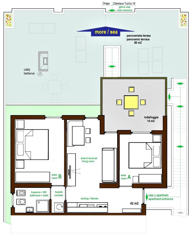 Zařízení PERICA se nachází ve 3. části osady postavené v zátoce Dolaška v půvabném městečku Drage, 100 m od moře a pláže, vedle kterého se rozprostírá hustý borový les s promenádou a díky svou dominantní polohou nabízí jedinečný panoramatický výhled na osadu, pláže, přístav, blízké ostrovy a souostroví Kornati. Objekt se skládá z garáže, panoramatické terasy v 1.NP a dvou bytů ve 2. a 3.NP. Pronajímá se pouze apartmán ve 2. patře, který hostům umožňuje odpočívat v naprostém soukromí, zatímco hostitelé jsou jim k dispozici pro všechny dotazy a potřeby. Byt je klimatizovaný, má dvě ložnice s lůžky šířky 180 a 140 cm a rozkládacím gaučem šířky 110 cm jako přistýlka Je dobře vybaven pro příjemný pobyt (SAT/TV, plochý bezdrátový internet, elektrický sporák, mikrovlnná trouba trouba, 20l mrazák, nádobí, myčka atd.). Hosté mají k dispozici 1 parkovací/garáž/stání pro auto a neomezené využívání panoramatické terasy (80 m2) s grilem.
