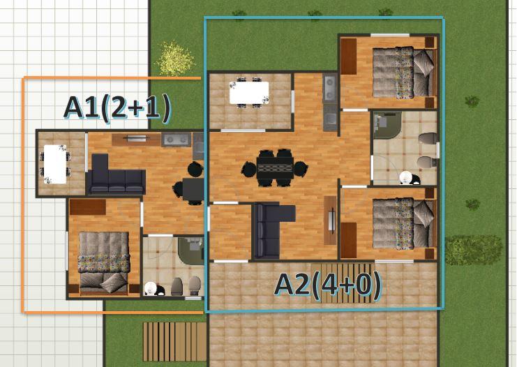 Plně vybavené apartmány v klidném prostředí. V blízkosti domu se nachází veškerá občanská vybavenost a vše je do 500m. Hostům je k dispozici malý bazén s lehátky, koutek pro odpočinek s houpacími sítěmi, kryté posezení, gril a další stůl k posezení u grilu.