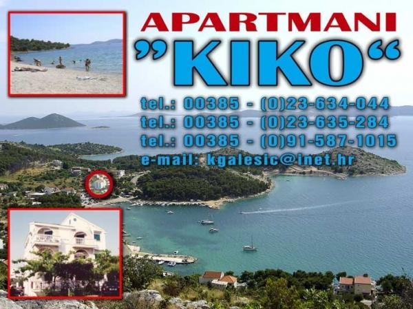Kiko Apartmány se nacházejí v Drage, turistické letovisko v severní části Dalmácie, 6 km od Biogradu na Moru, 30 km od Zadaru a 35 km od Šibeniku. Z centra parku Vranské jezero přírodě jsou 1 km a ve vzdálenosti cca. 35km jsou Národní park Kornati a Krka. Kiko Apartmány se nacházejí na ploše 1.500 m2. Na pláži je 100 m ve stínu husté světský borovicemi a je obklopen středomořskou vegetací. Apartmány jsou vybaveny WC / sprchou, LCD TV / SAT, kuchyň, Wi-Fi a Mitsubishi klimatizací. U všech vozidel je parkoviště s krytou strukturou. Apartmány Kiko jsou ideální pro ty, kteří chtějí strávit svou dovolenou v přímém kontaktu s přírodou.