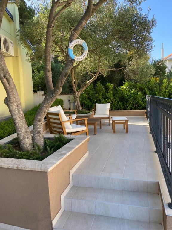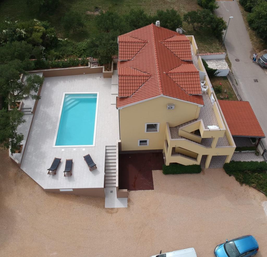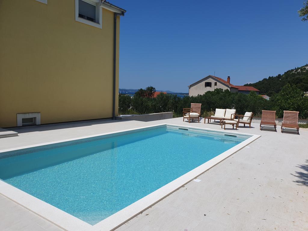 Nové, plně vybavené apartmány s výhledem na moře, bazénem, SAT TV, klimatizací, kuchyní, WC/sprchou, 2-3 minuty chůze k moři. Nemovitost se nachází v krásném olivovém háji, který se rozkládá na ploše cca 2500 m2, s množstvím květin a zeleně. Nově postavený bazén o rozloze 32 m2 s 200 m2 koupací plochy a výhledem na moře. Gril k dispozici ke společnému užívání. Apartmán číslo 1 se skládá ze 3 pokojů (z toho 2 ložnice), 55 m2, 4+2 osoby. Vchod v přízemí, přes terasu do obývacího pokoje. Přízemí: ložnice 1 s manželskou postelí, obývací pokoj s kuchyní a posezením, ložnice 2 s manželskou postelí a rozkládací pohovkou, WC/sprcha, terasa. Apartmány 2 a 3 se skládají ze 2 pokojů z toho 1 ložnice, obývacího pokoje s kuchyní a posezením, WC/sprcha, balkon. Relax House se skládá ze 3 pokojů, z toho 2 ložnice, v obývacím pokoji je kuchyň a rozkládací pohovka, WC/sprcha, terasa. Rekreační dům se skládá ze 3 pokojů, včetně 2 ložnic, obývacího pokoje a toalety/sprchy, terasy.