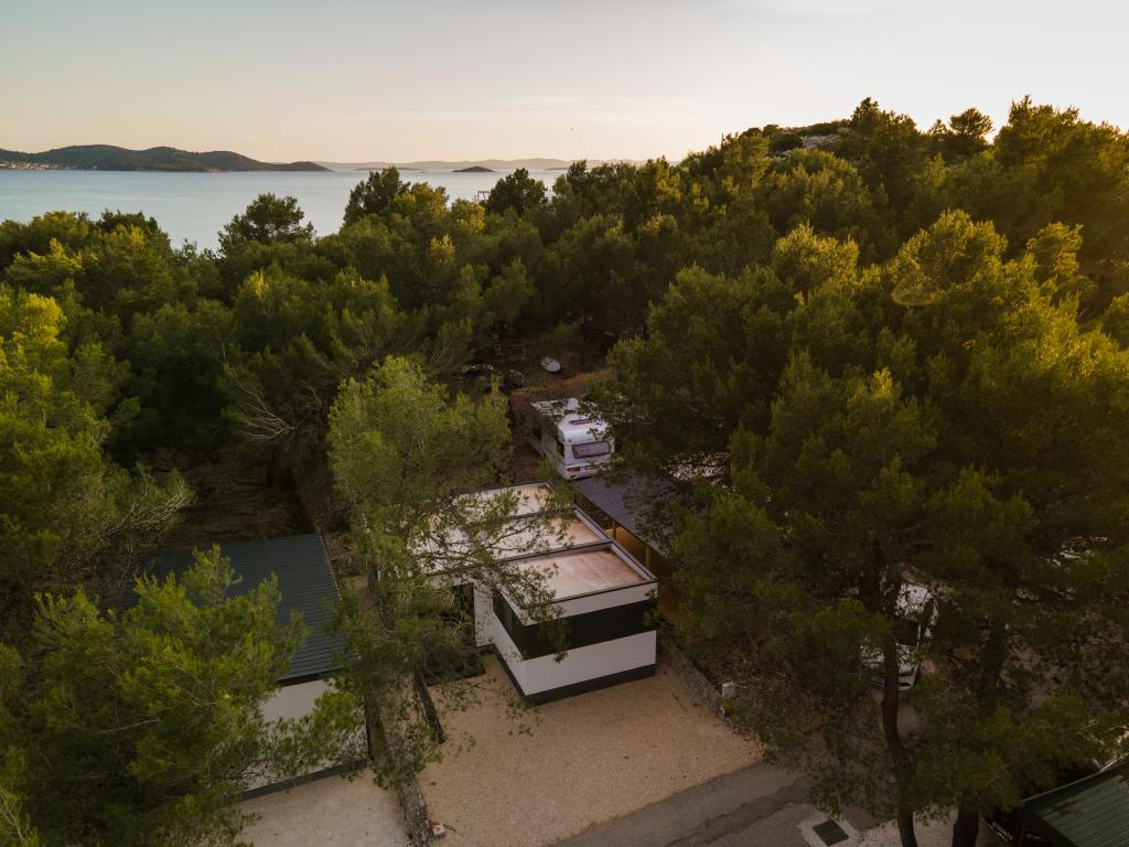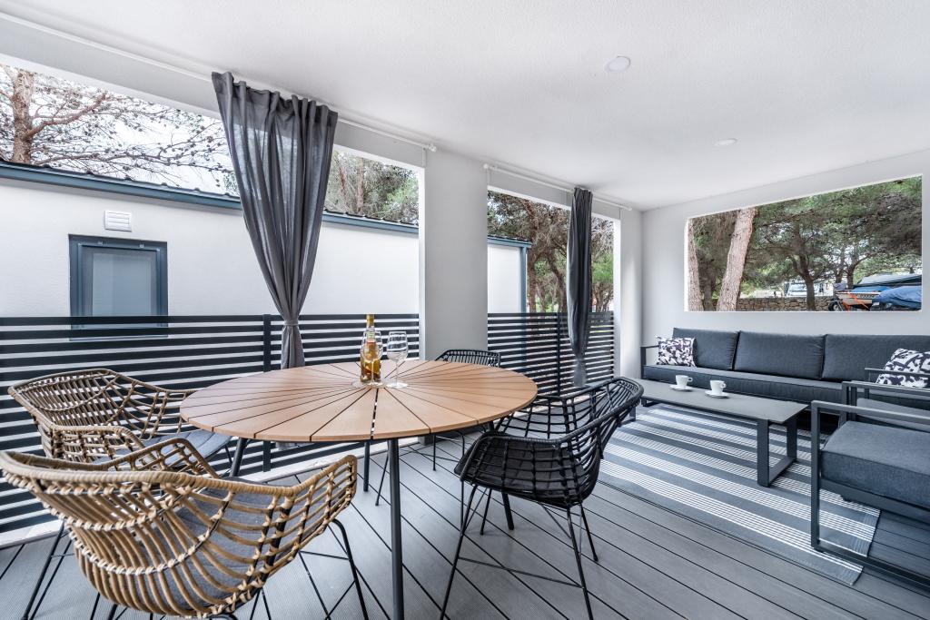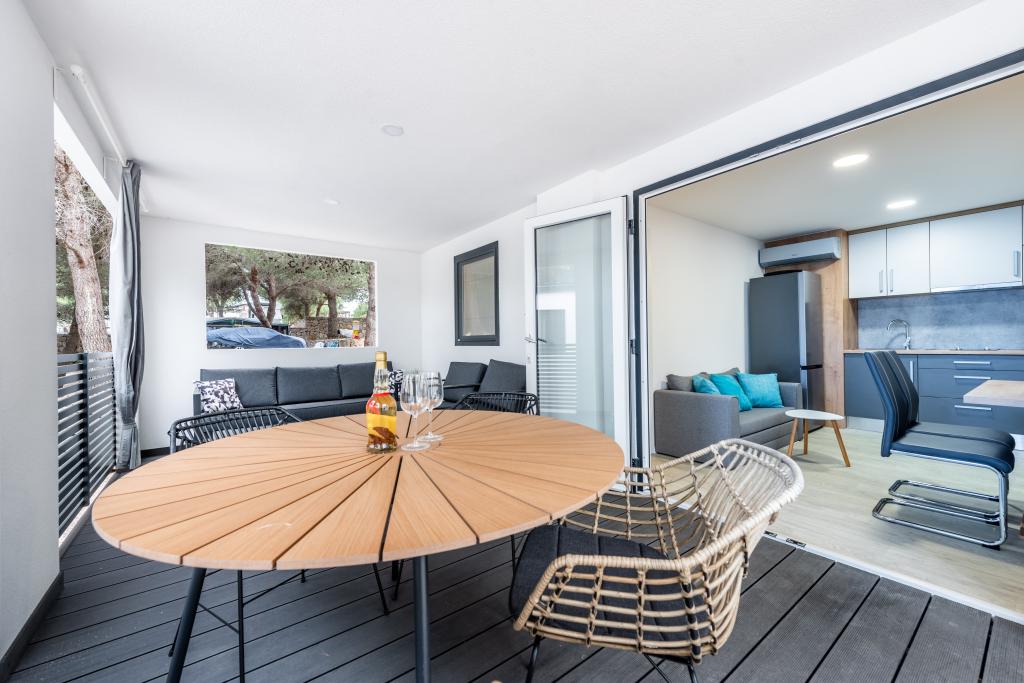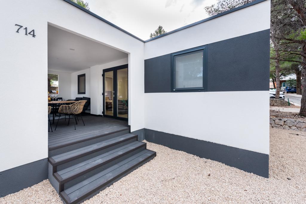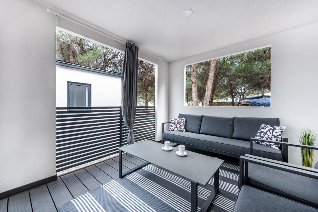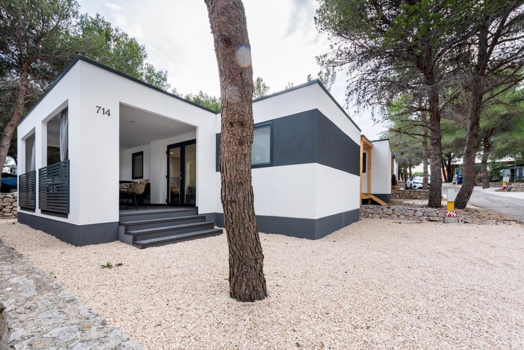 Luxusní mobilní dům, moderně vybavený s krásnou terasou, která uspokojí všechny chutě. Mobilní dům se nachází v kempu "Oaza mira" na skvělém místě ve stinném borovém lese, pouhých 50 m od krásné pláže. V bezprostřední blízkosti se nachází velký bazén a četná sportovní zařízení (tenisový kurt, hřiště na bocciu, dětské hřiště). V kempu je restaurace, supermarket a velké sociální zařízení s prádelnou. Každý dům má dvě ložnice, pokoj s manželskou postelí a pokoj se dvěma samostatnými lůžky. V obývacím pokoji může rohová sedací souprava sloužit jako přistýlka pro další dvě osoby. Dům má velký obývací pokoj, kuchyň s nádobím, sporákem a lednicí a jednu/dvě koupelny se sprchovým koutem, umyvadlem a WC. Mobilní dům má zahradu s terasou a přístřeškem.