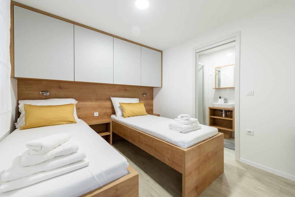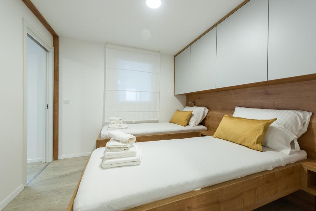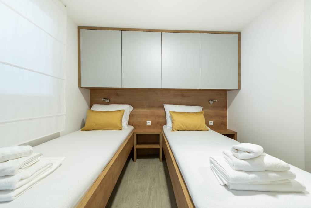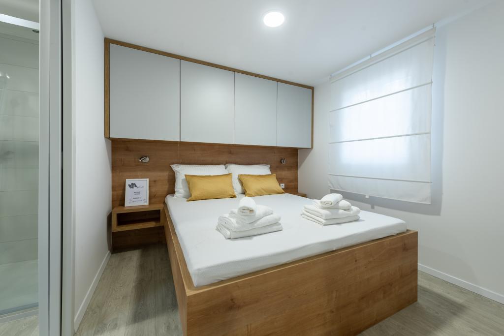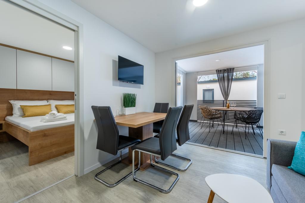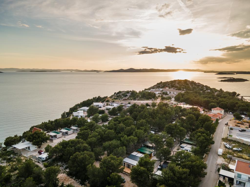 Luxusní mobilní dům, moderně vybavený s krásnou terasou, která uspokojí všechny chutě. Mobilní dům se nachází v kempu "Oaza mira" na skvělém místě ve stinném borovém lese, pouhých 50 m od krásné pláže. V bezprostřední blízkosti se nachází velký bazén a četná sportovní zařízení (tenisový kurt, hřiště na bocciu, dětské hřiště). V kempu je restaurace, supermarket a velké sociální zařízení s prádelnou. Každý dům má dvě ložnice, pokoj s manželskou postelí a pokoj se dvěma samostatnými lůžky. V obývacím pokoji může rohová sedací souprava sloužit jako přistýlka pro další dvě osoby. Dům má velký obývací pokoj, kuchyň s nádobím, sporákem a lednicí a jednu/dvě koupelny se sprchovým koutem, umyvadlem a WC. Mobilní dům má zahradu s terasou a přístřeškem.