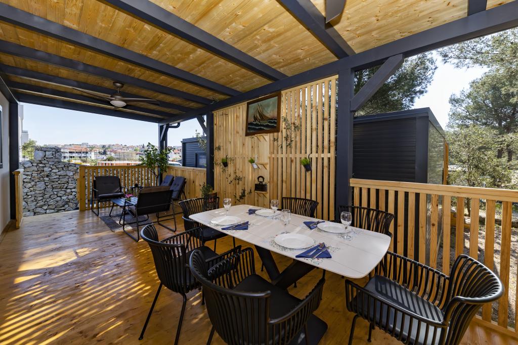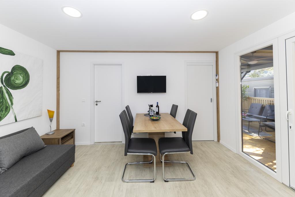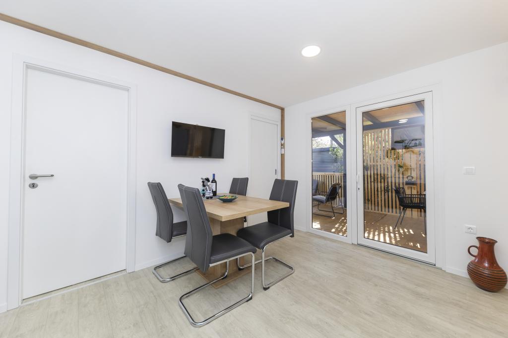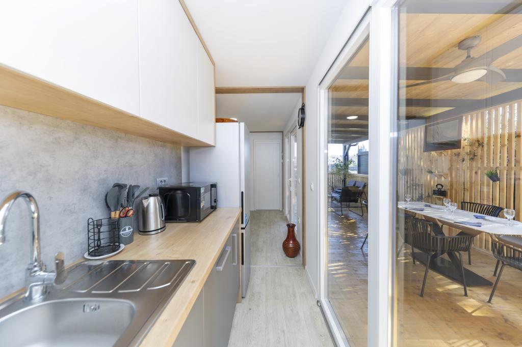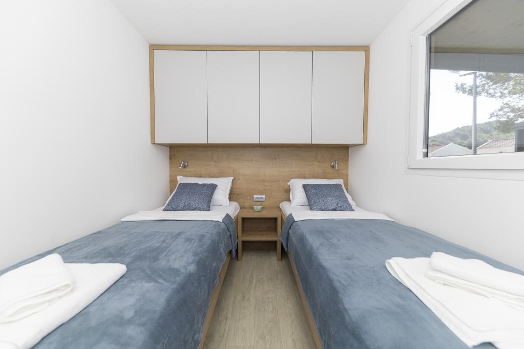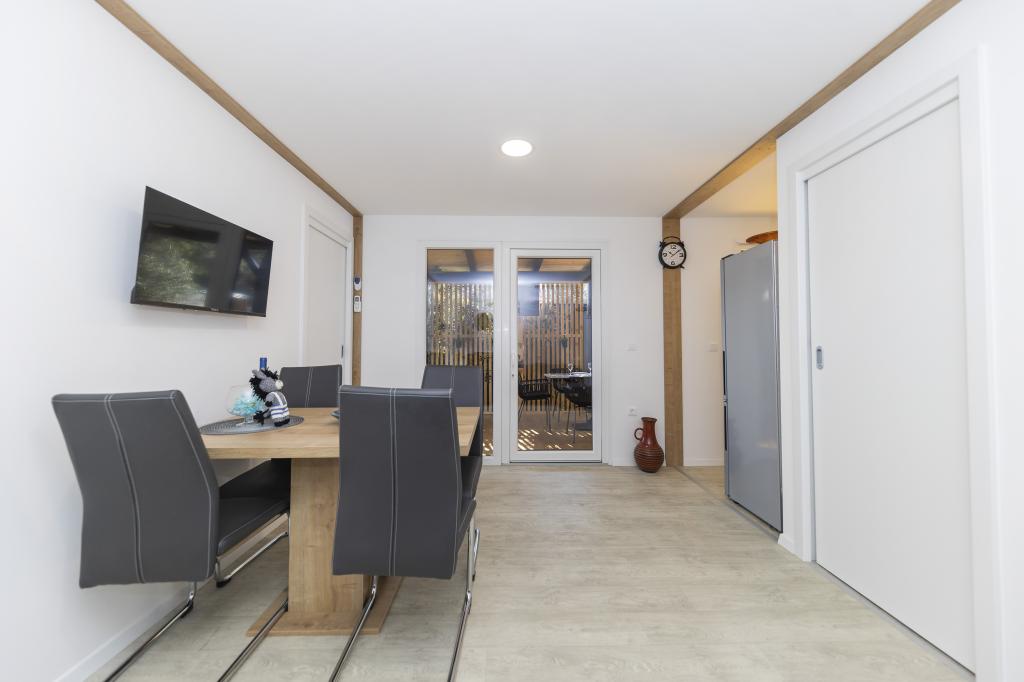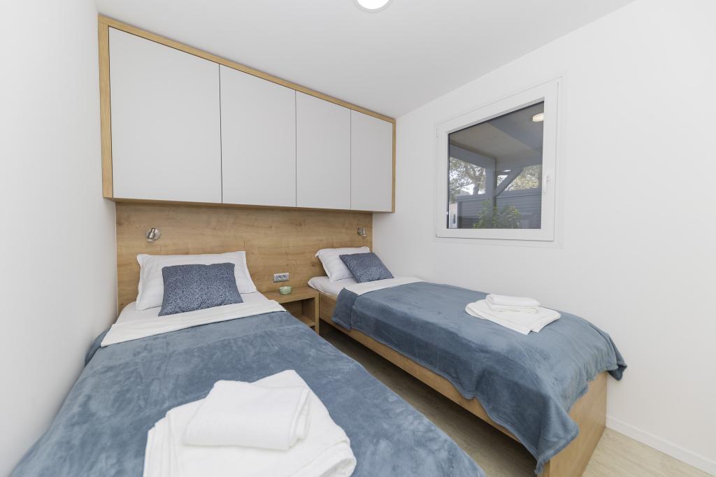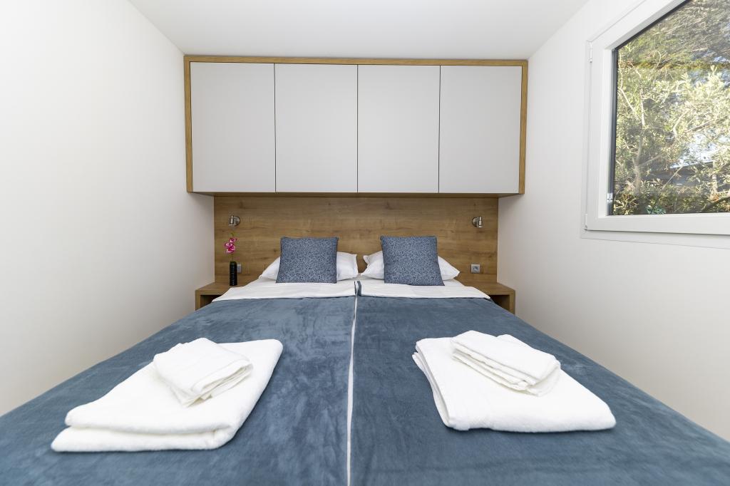 Nový mobilní dům se nachází v kempu Oaza Mira, který se nachází ve vesnici Drage, asi 10 km od Biogradu, v centru chorvatského pobřeží, na krásném místě s vlastní zátokou, v přírodním prostředí, které se otáčí. vaše dovolená v potěšení. Kemp je oddělen od vesnice, takže hosté kempu nejsou vystaveni davům a hluku. Výlety v okolí: NP Kornati, NP Krka, PP Vranské jezero. Dům se skládá ze dvou ložnic. Pokoj s manželskou postelí a pokoj se dvěma oddělenými lůžky. V obývacím pokoji je rozkládací pohovka, kterou lze využít jako přistýlku pro další dvě osoby. V chatě je obývací pokoj, kuchyň s nádobím a nádobím, indukční sporák, lednice, mikrovlnná trouba, toustovač, varná konvice, myčka. Koupelna se sprchovým koutem, umyvadlem a WC, vysoušeč vlasů. V obývacím pokoji je TV s klimatizací pro chlazení a topení, Wi-fi. K ubytování patří krytá terasa 27 m2 s venkovním jídelním koutem, lehátky a venkovní sprchou. Elektrický gril.