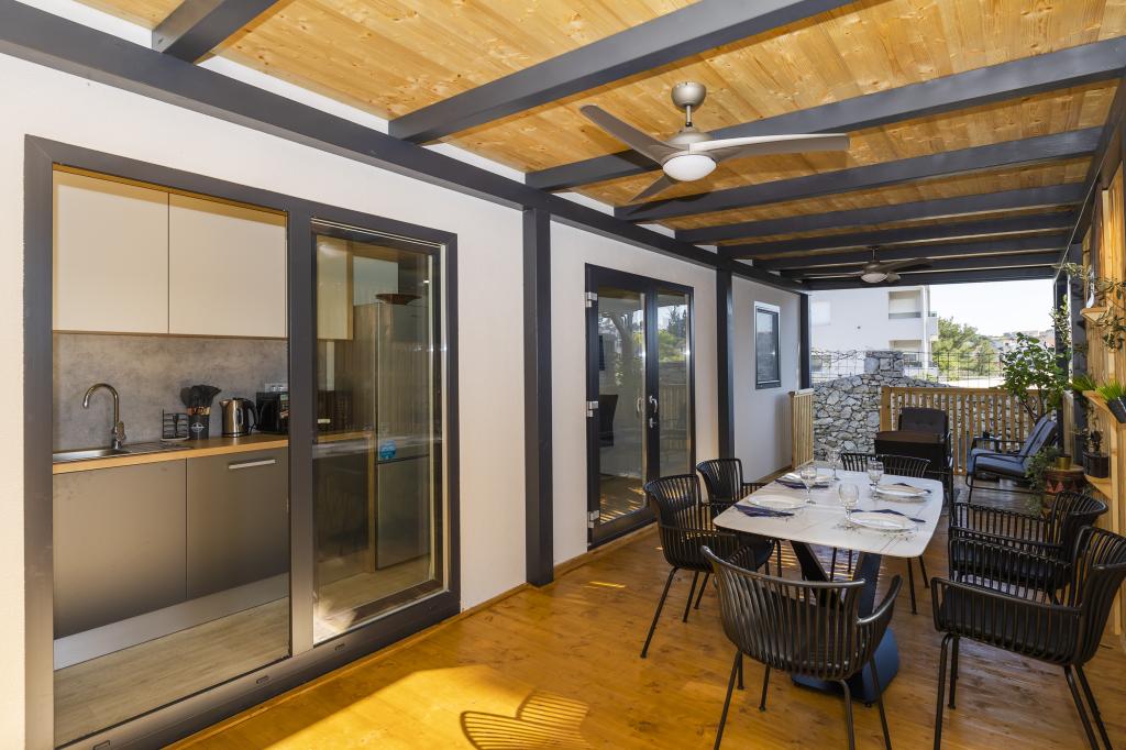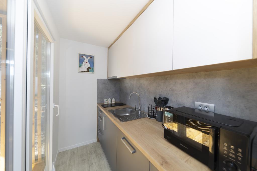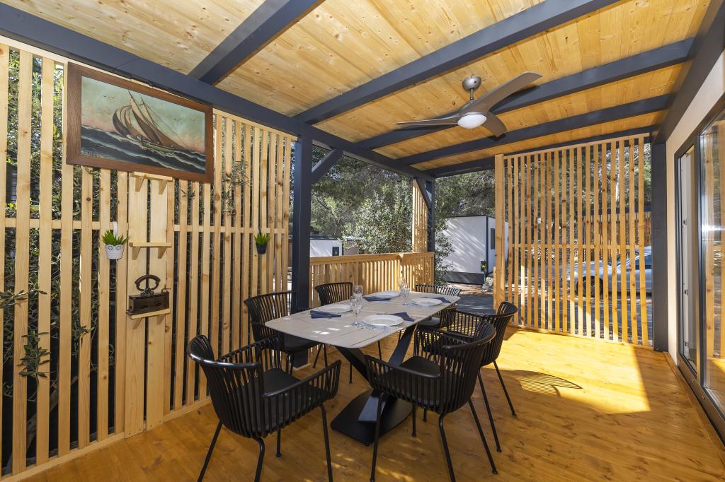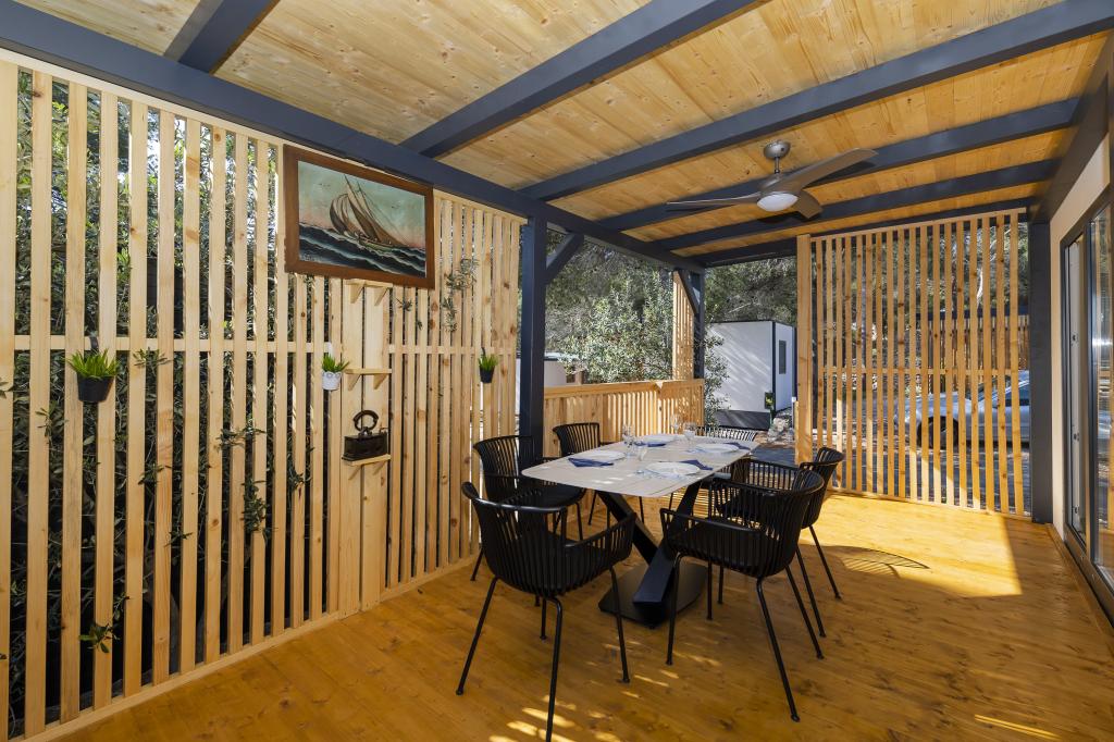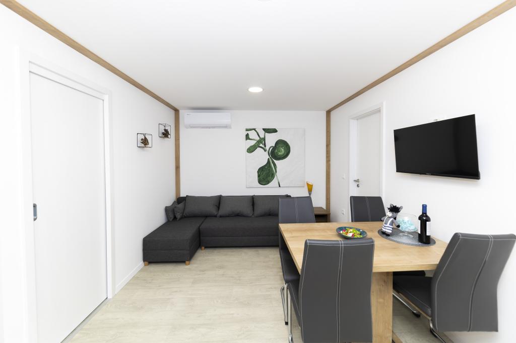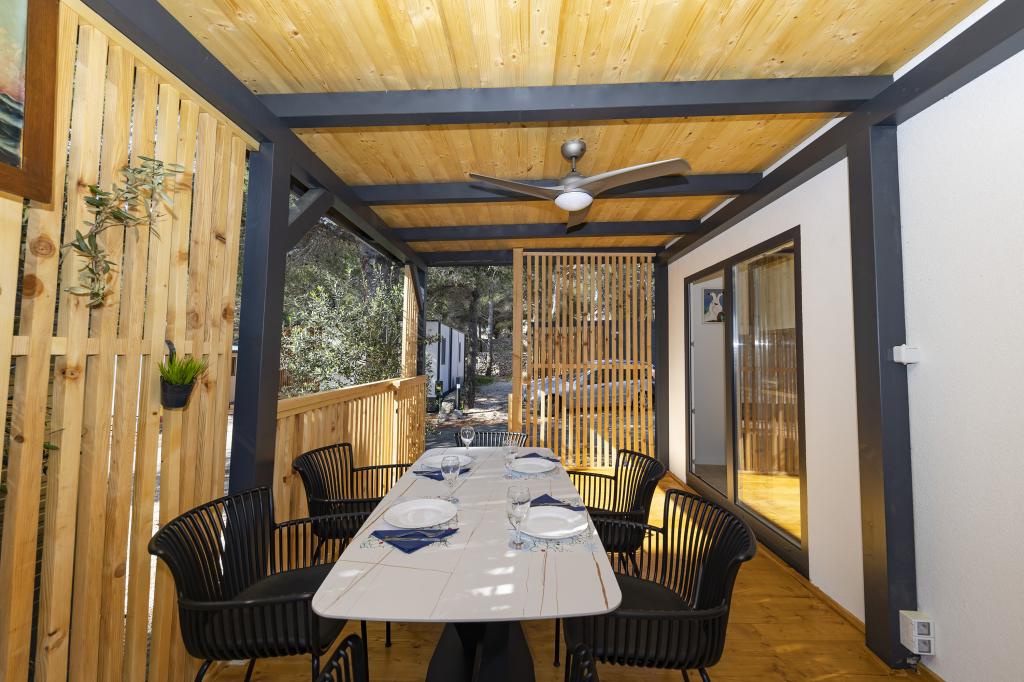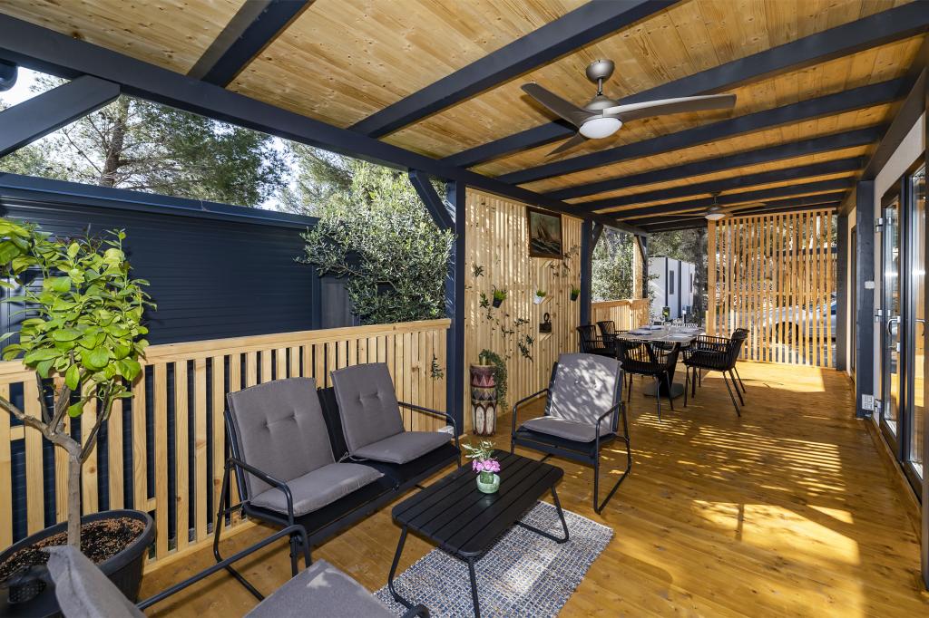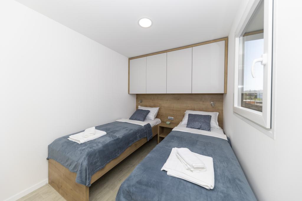 Nový mobilní dům se nachází v kempu Oaza Mira, který se nachází ve vesnici Drage, asi 10 km od Biogradu, v centru chorvatského pobřeží, na krásném místě s vlastní zátokou, v přírodním prostředí, které se otáčí. vaše dovolená v potěšení. Kemp je oddělen od vesnice, takže hosté kempu nejsou vystaveni davům a hluku. Výlety v okolí: NP Kornati, NP Krka, PP Vranské jezero. Dům se skládá ze dvou ložnic. Pokoj s manželskou postelí a pokoj se dvěma oddělenými lůžky. V obývacím pokoji je rozkládací pohovka, kterou lze využít jako přistýlku pro další dvě osoby. V chatě je obývací pokoj, kuchyň s nádobím a nádobím, indukční sporák, lednice, mikrovlnná trouba, toustovač, varná konvice, myčka. Koupelna se sprchovým koutem, umyvadlem a WC, vysoušeč vlasů. V obývacím pokoji je TV s klimatizací pro chlazení a topení, Wi-fi. K ubytování patří krytá terasa 27 m2 s venkovním jídelním koutem, lehátky a venkovní sprchou. Elektrický gril.