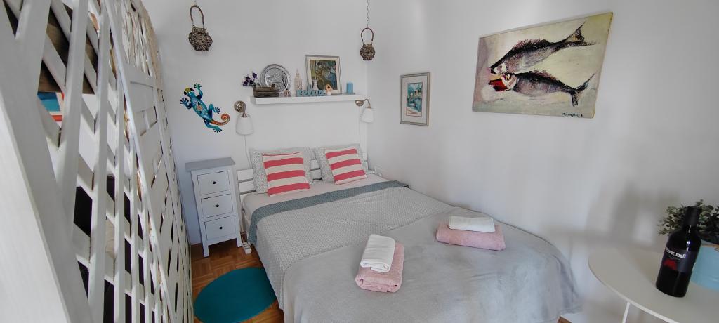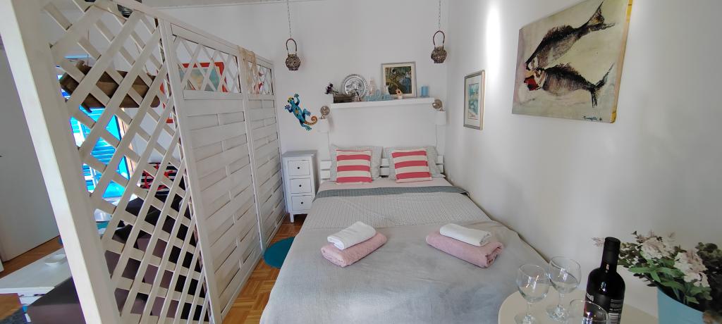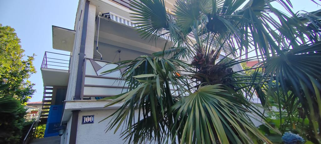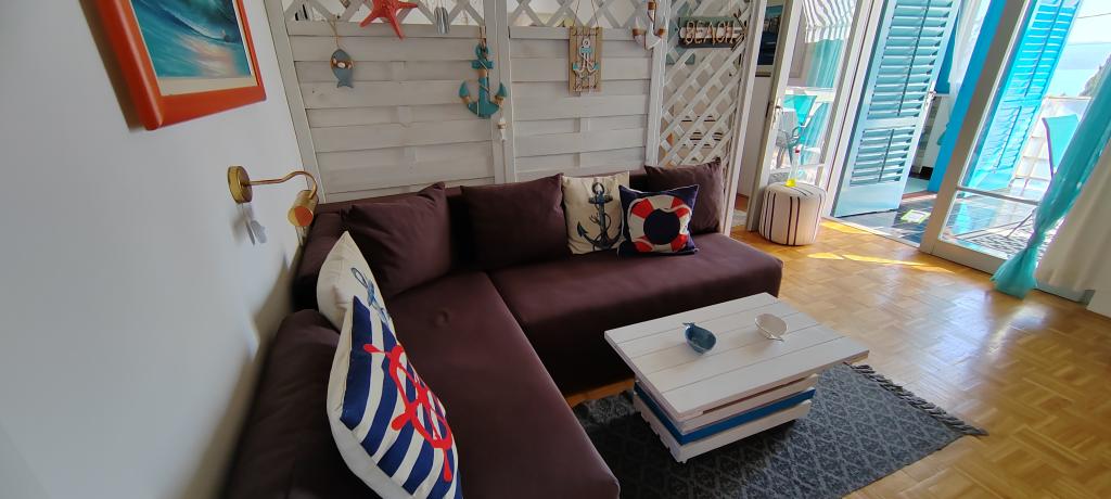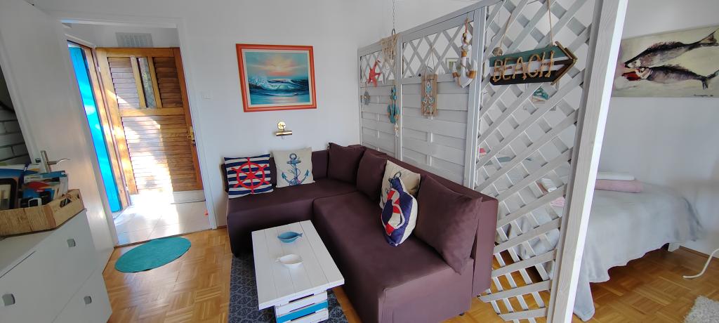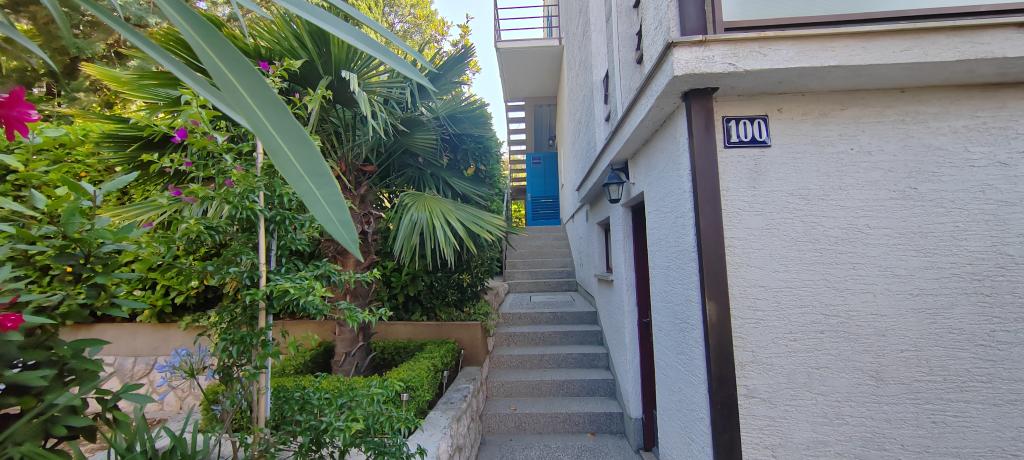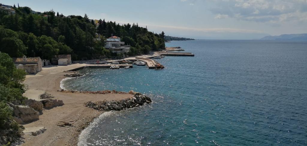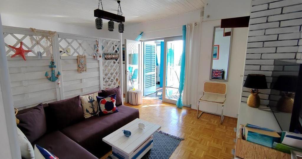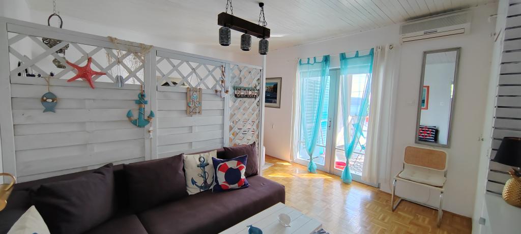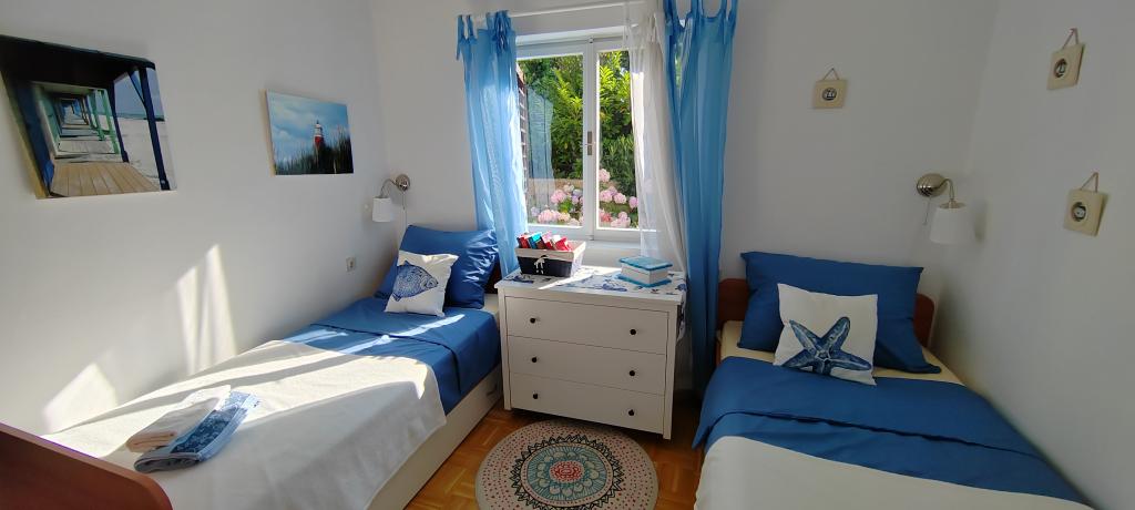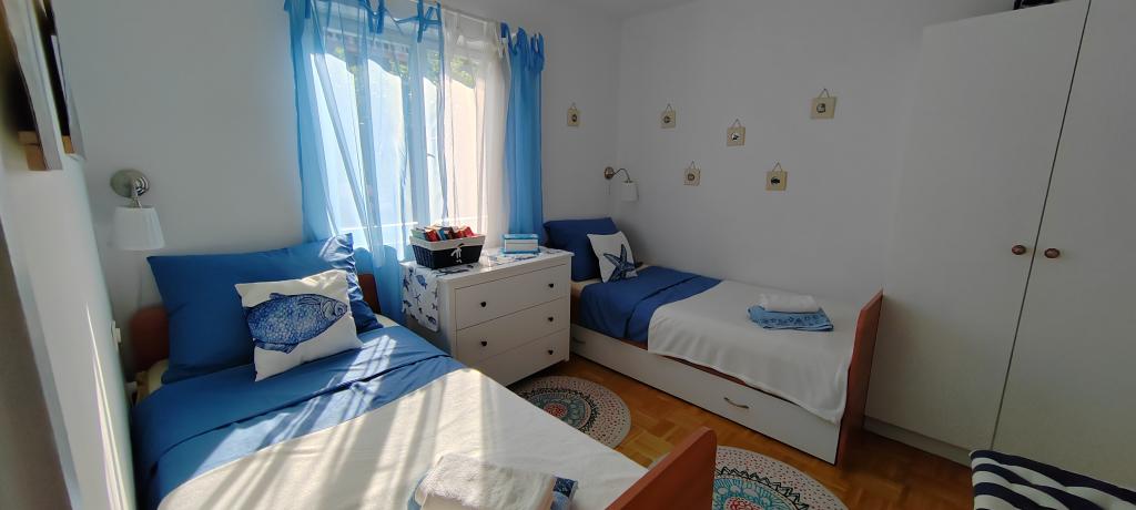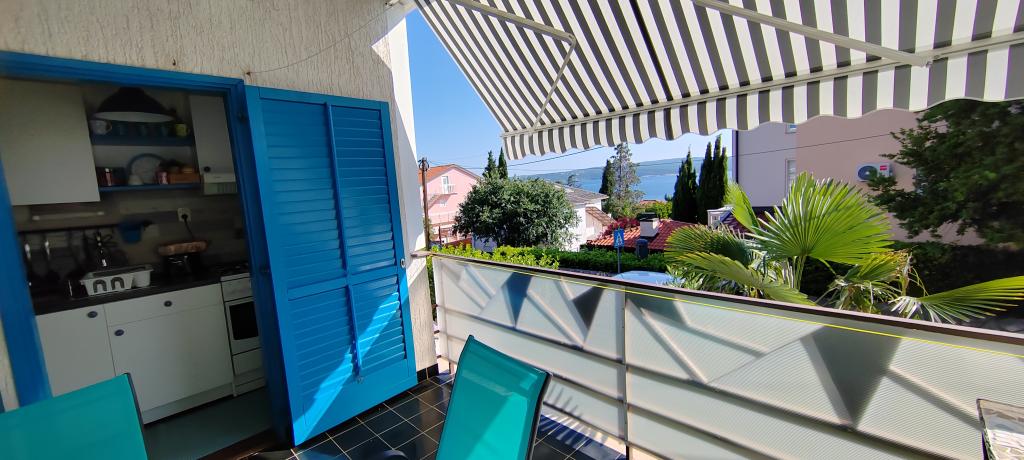 Apartmán se nachází v klidném místě Dramalj, 2 km od města Crikvenica. Vzdálenost od pláže je 250 m a máte na výběr: oblázková pláž, betonová a skalnatá. Obchod je od ubytování 100 m a je zde zastávka turistického vláčku, který jede do Crikvenice, Selce a Kačjaku. Do Crikvenice se také můžete projít po pobřežní promenádě, cesta trvá asi 20 minut. Apartmán se nachází v prvním patře a skládá se z obývacího pokoje, samostatné ložnice s manželskou postelí a přístupem na krásnou terasu s výhledem na moře, která zahrnuje kuchyň a další pokoj s oddělenými lůžky a koupelnou. Parkování je zajištěno pro hosty.