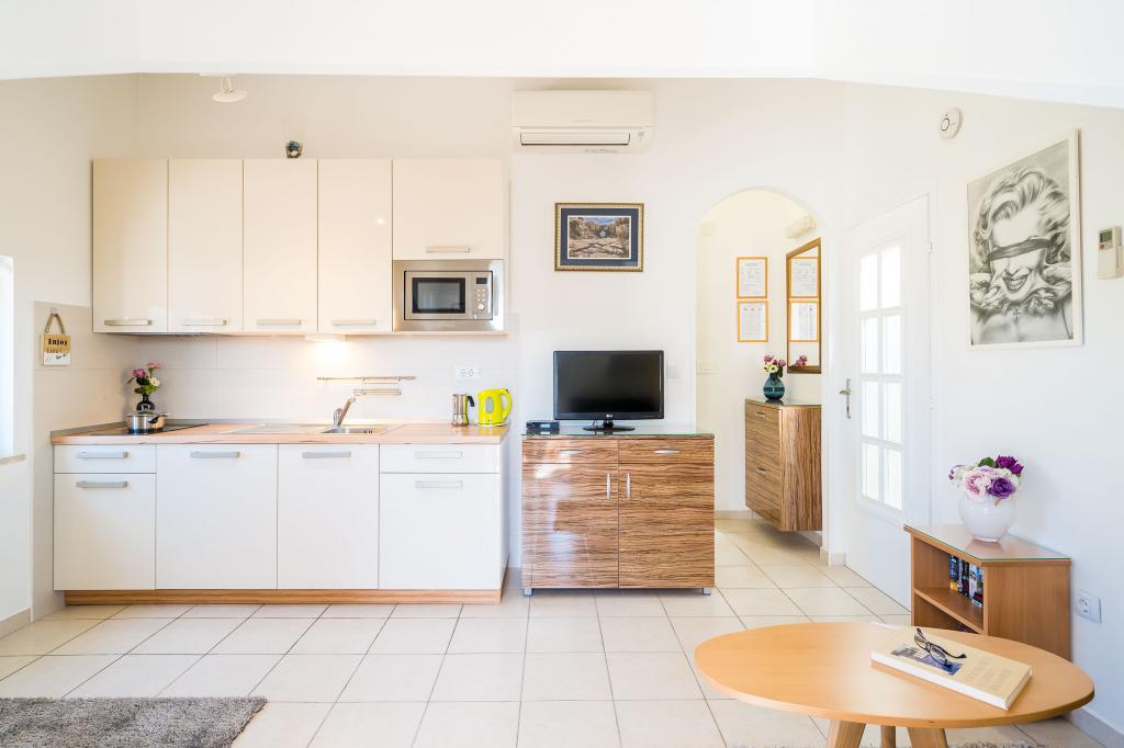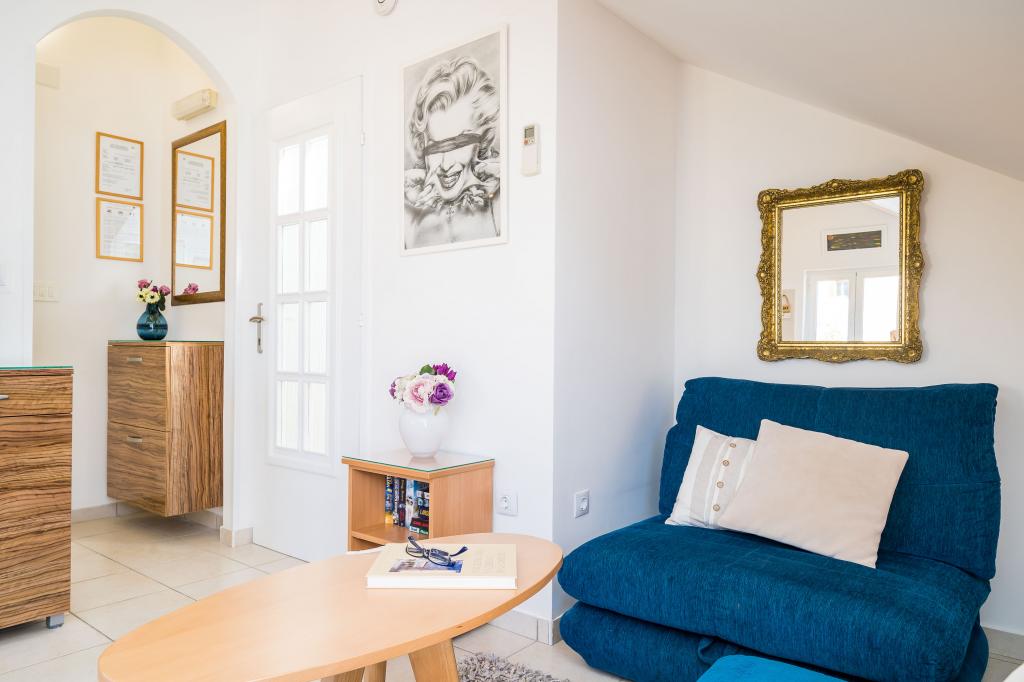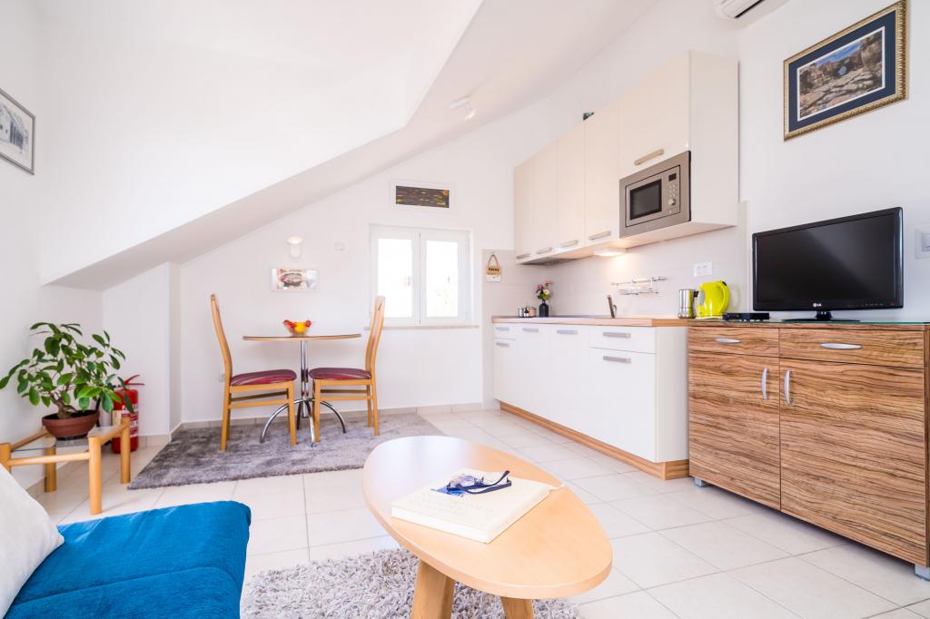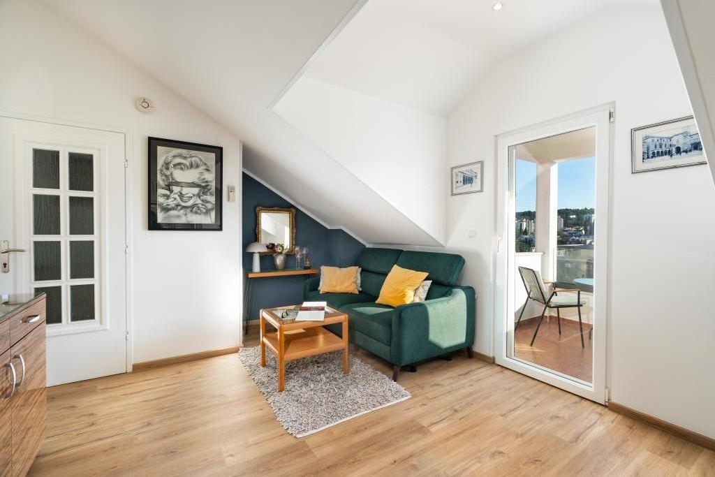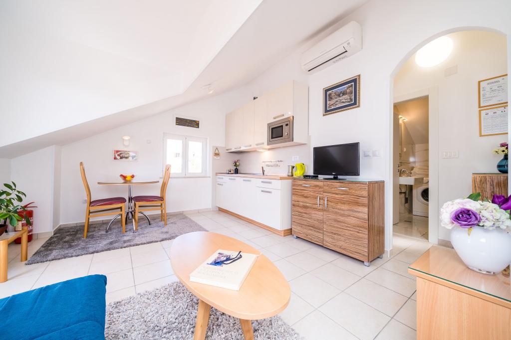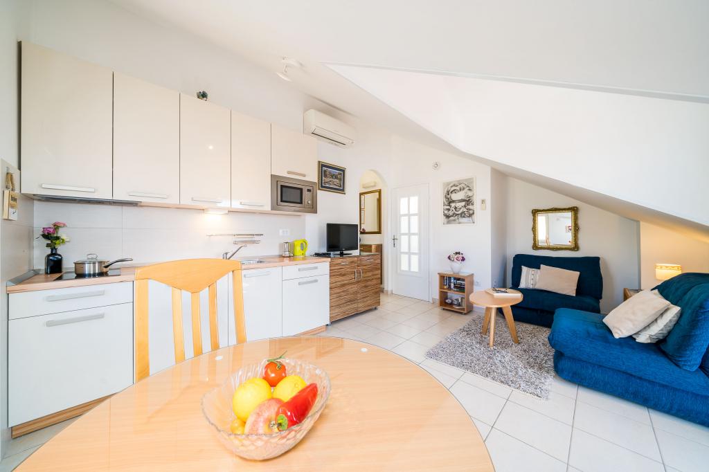 V první řadě, abychom Marijaně ještě jednou poděkovali za její pohostinnost a laskavost, apartmán nabízí vše, co potřebujete, abyste se na dovolené cítili extra. Od klimatizace v obývacím pokoji a v ložnici, pračka, kávovar, TV nabízejí různé v různých jazycích. Tento byt právem patří k Luxus Apartments. Pohled z balkonu se táhne od Lapadu k moři. Z bytu na pláž jsme potřebovali 5-6 minut, snadná procházka. Auto jsme nechali na parkovacím místě od apartmánu a během pobytu jsme ho již nepoužívali. Obchody, restaurace, autobusové nádraží se nachází několik minut od apartmánů. Jediná věc, která by někomu, kdo má problémy s koleny, mohla vadit, jsou Schody vedoucí na Promenádu a Plaza, osobně nás neobtěžovaly. Podívali jsme se na to jako na malé cvičení. Lapad se nám moc líbil a Apartmán ještě víc.