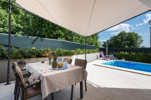 CASA DELPHIA je moderní rodinný dům s vyhřívaným bazénem o rozměrech 5 x 3 metry v obci Šegotići v obci Marčana. Nachází se na klidném a klidném místě a je ideální volbou pro kompletní dovolenou daleko od hluku a davů. Casa Delphia je pro 4 osoby, nachází se na pozemku o rozloze 315 m2 s obytnou plochou 72 m2 a skládá se z: kuchyně, jídelny a obývacího pokoje propojeného v jedné místnosti, dvou ložnic a koupelny a odděleného prostoru s pračkou. Dům je plně klimatizovaný. Z obývacího pokoje se vydáte na terasu, kde si můžete vychutnat ranní kávu, připravit si na grilu vynikající oběd a večer s osvětleným bazénem popíjet koktejl. Čekají na vás pohodlná lehátka, stůl a židle a solární sprcha u bazénu. Pokud chcete ochutnat své chutné pokrmy, použijte bylinky z koření z malé středomořské zahrady. V přední části domu se nachází parkoviště pro auta, kola nebo skútry. Pozemek je kompletně oplocený a uzavřený.