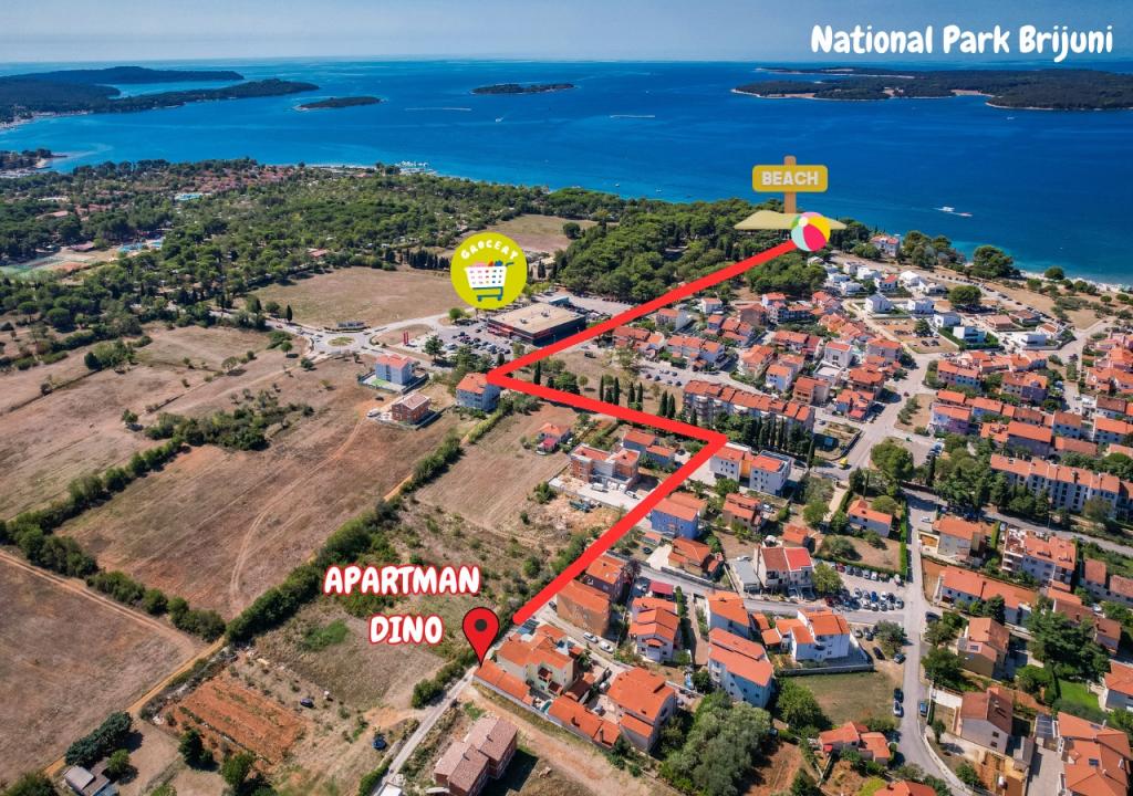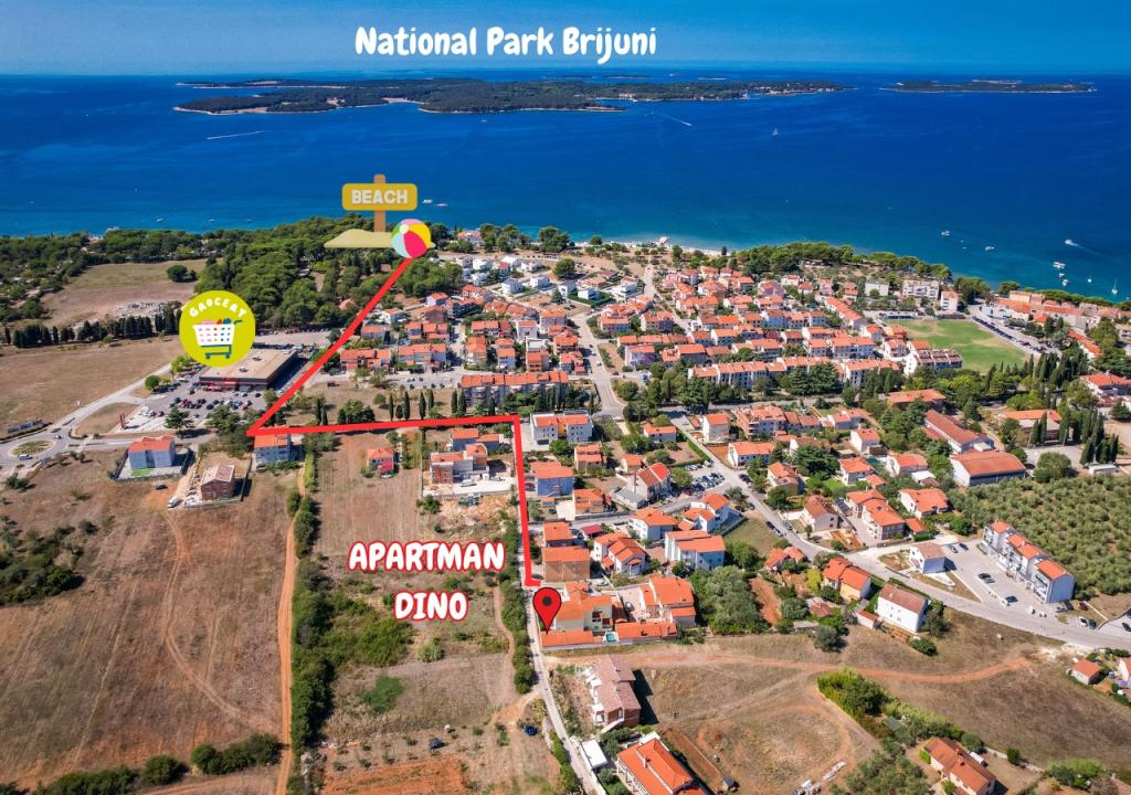 Apartmán Dino se nachází v obci Fažana, malé rybářské a turistické městečko, v blízkosti starobylé Puly, v blízkosti národního parku Brijuni, na klidném a tichém místě. Zařízení nabízí ubytování s kuchyní, obývacím pokojem, ložnicí, koupelnou, jídelnou a dlážděnou terasou pro společenské vyžití. Apartmán má bezplatné Wi-Fi a je klimatizovaný a má jedno kryté parkovací místo. Kuchyň je vybavena mikrovlnnou troubou, sporákem, lednicí, myčkou, rychlovarnou konvicí, kávovarem. Místo známé svým krásným mořem, dobrou zábavou, krásnými plážemi, olivovými háji, je tím pravým místem pro ideální dovolenou. Apartmán Dino je 500 m od pláže. Hostitel se domluví: anglicky, chorvatsky