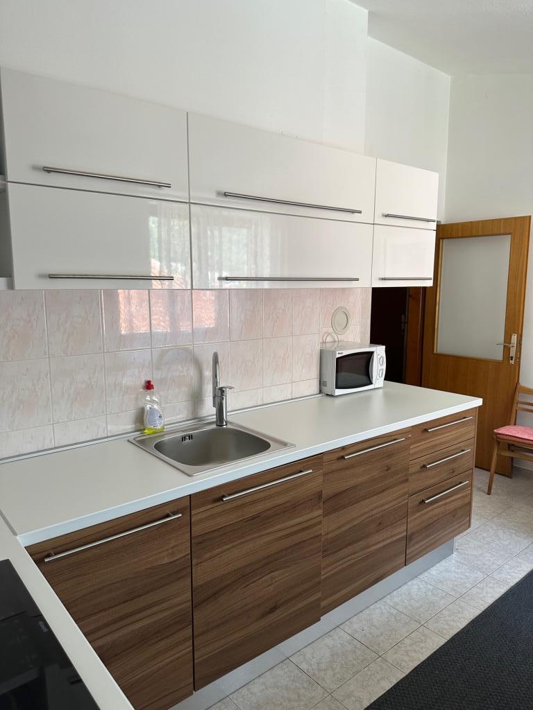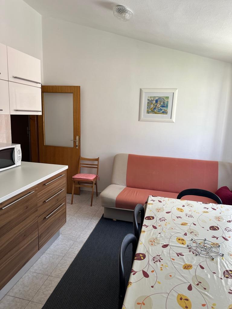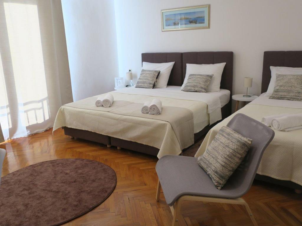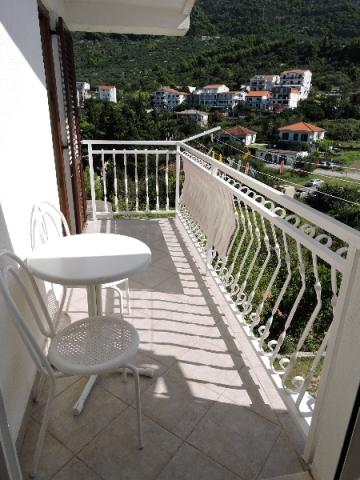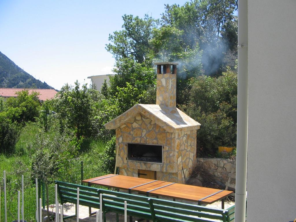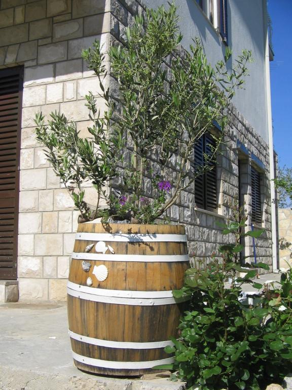 Apartmán 100 m2 pro 8 1 osob. Apartmán má tři samostatné ložnice (jedna dvoulůžkový a dvě třílůžkové), dvě koupelny, kuchyň s jídelnou a dva balkony s krásným výhledem na moře a okolí. Všechny pokoje mají klimatizaci. Ke stolování mohou hosté využít i gril se stolem a lavicemi. Parkování pro hosty je zdarma.