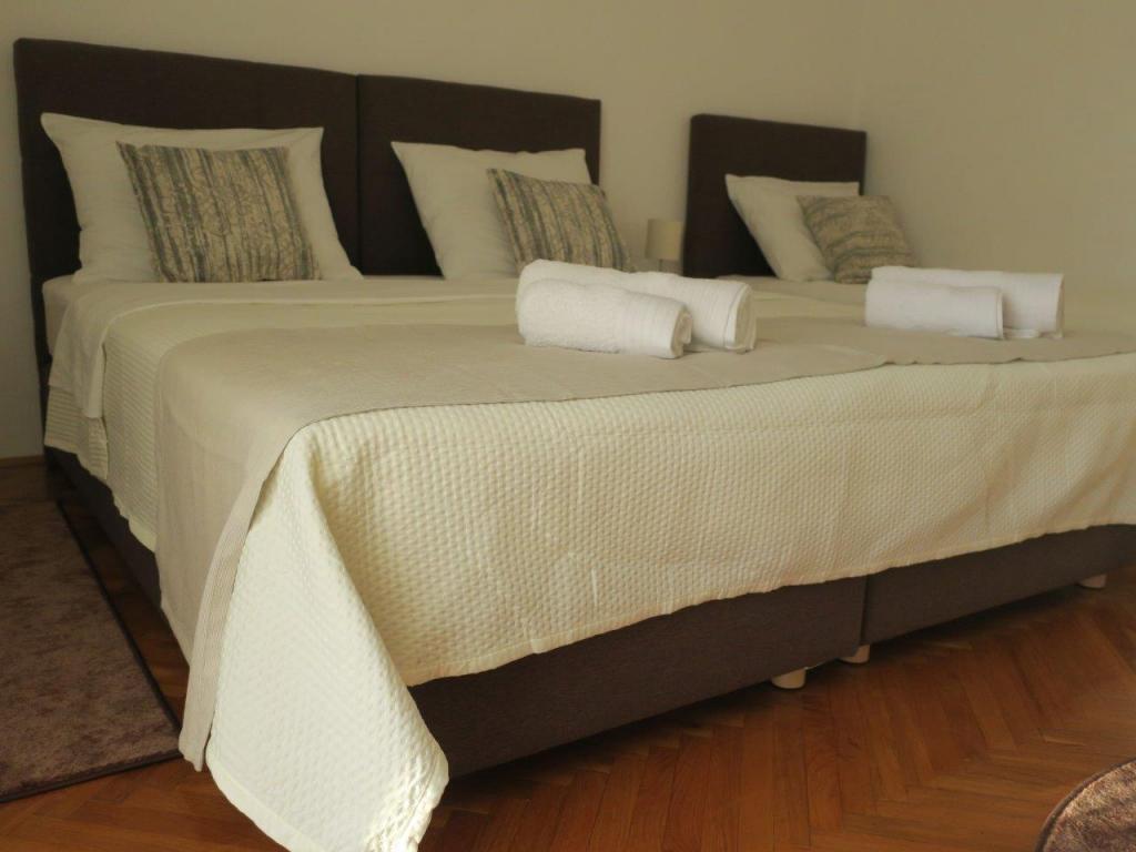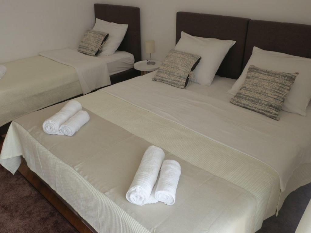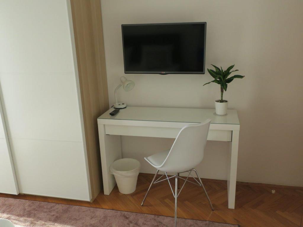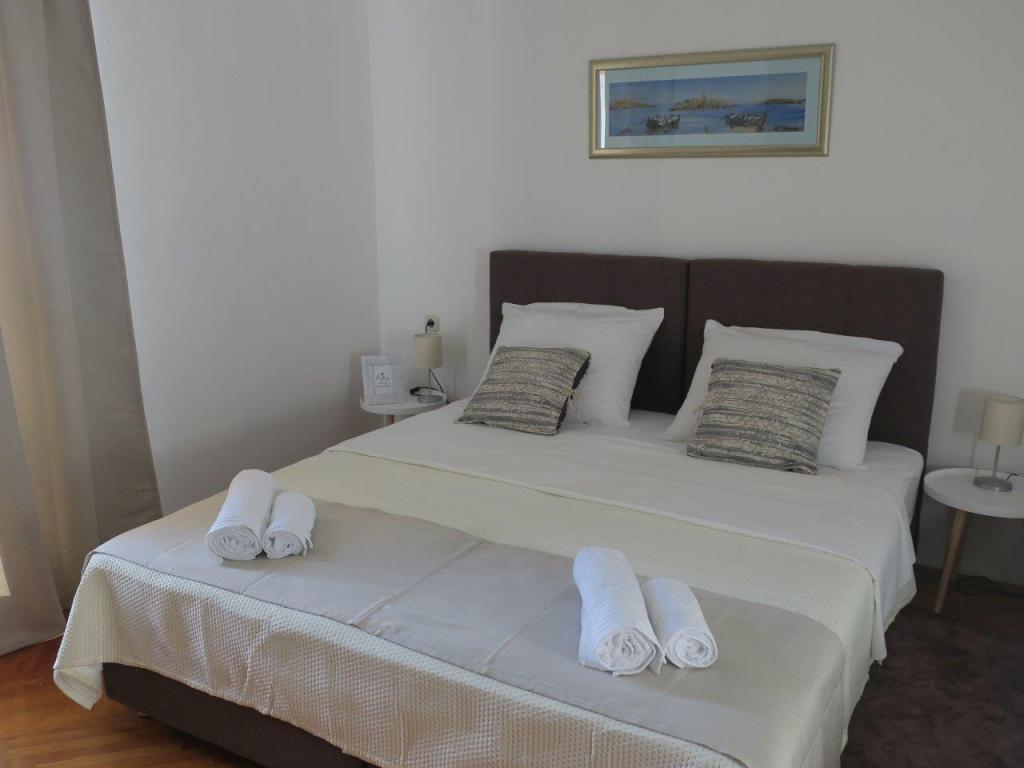 Apartmán 100 m2 pro 8 1 osob. Apartmán má tři samostatné ložnice (jedna dvoulůžkový a dvě třílůžkové), dvě koupelny, kuchyň s jídelnou a dva balkony s krásným výhledem na moře a okolí. Všechny pokoje mají klimatizaci. Ke stolování mohou hosté využít i gril se stolem a lavicemi. Parkování pro hosty je zdarma.