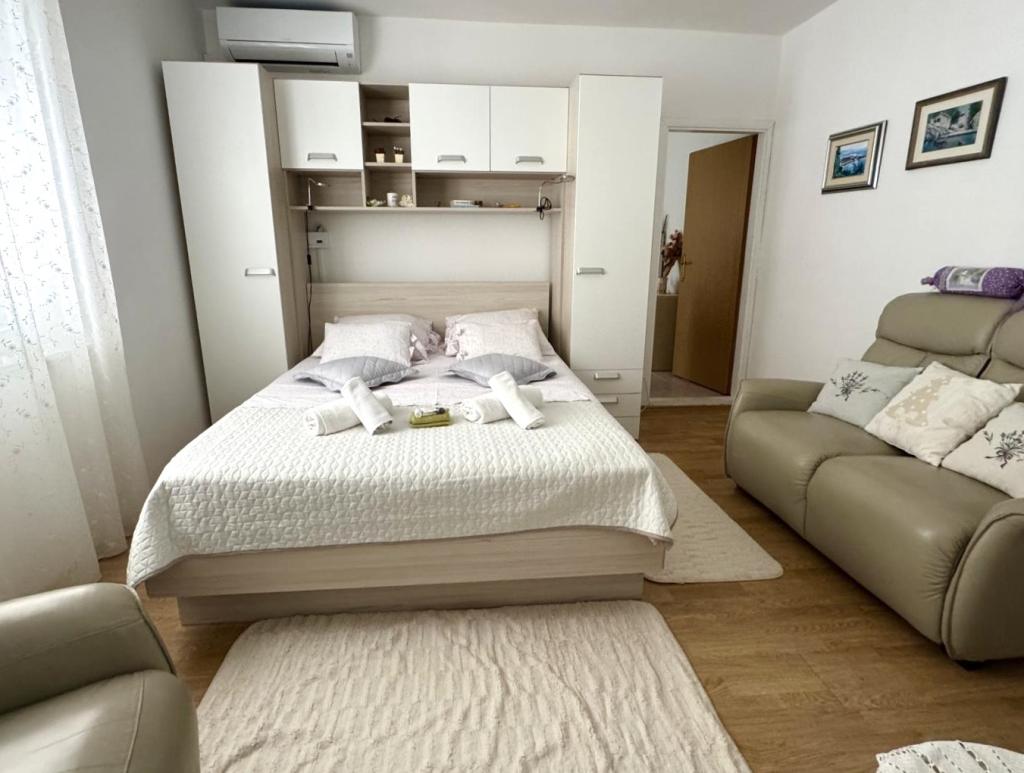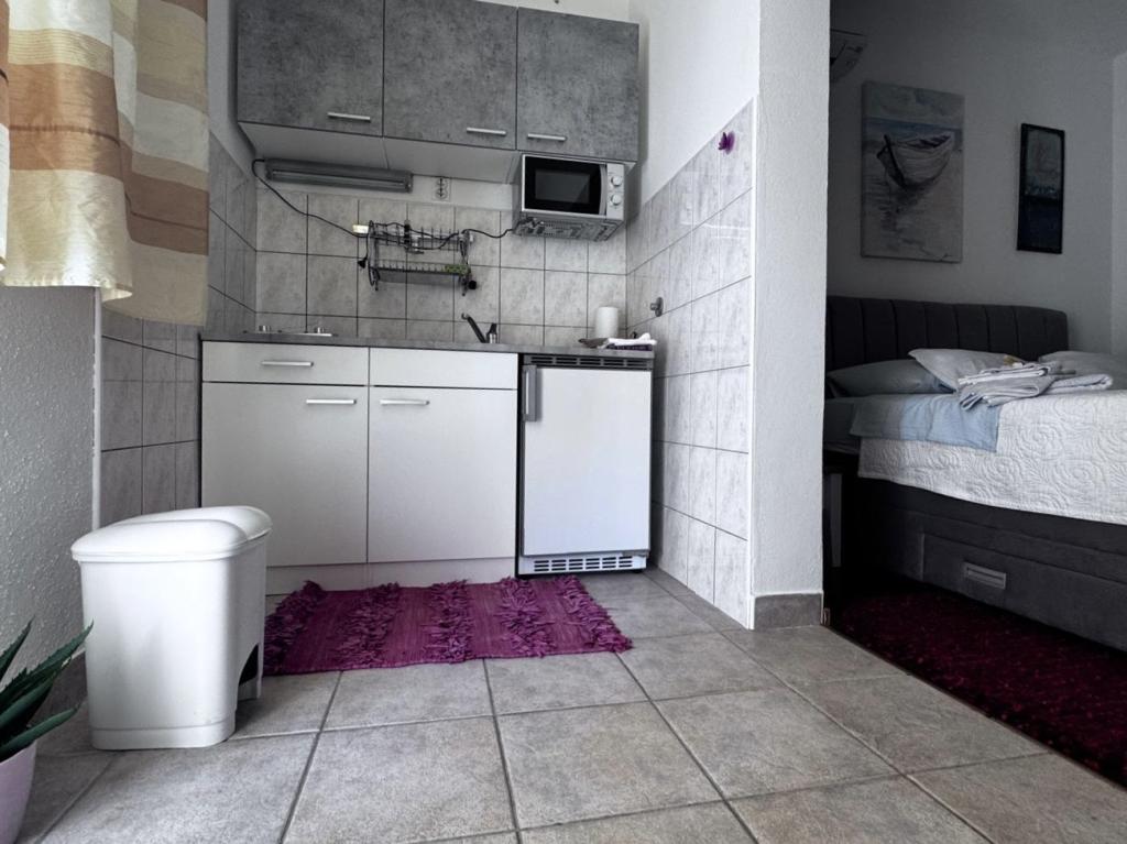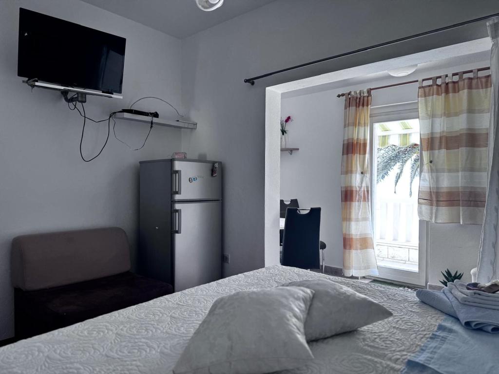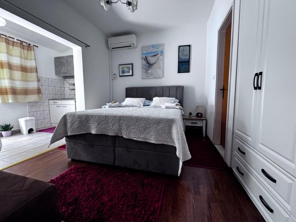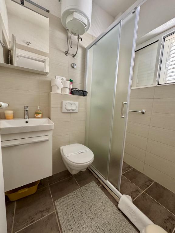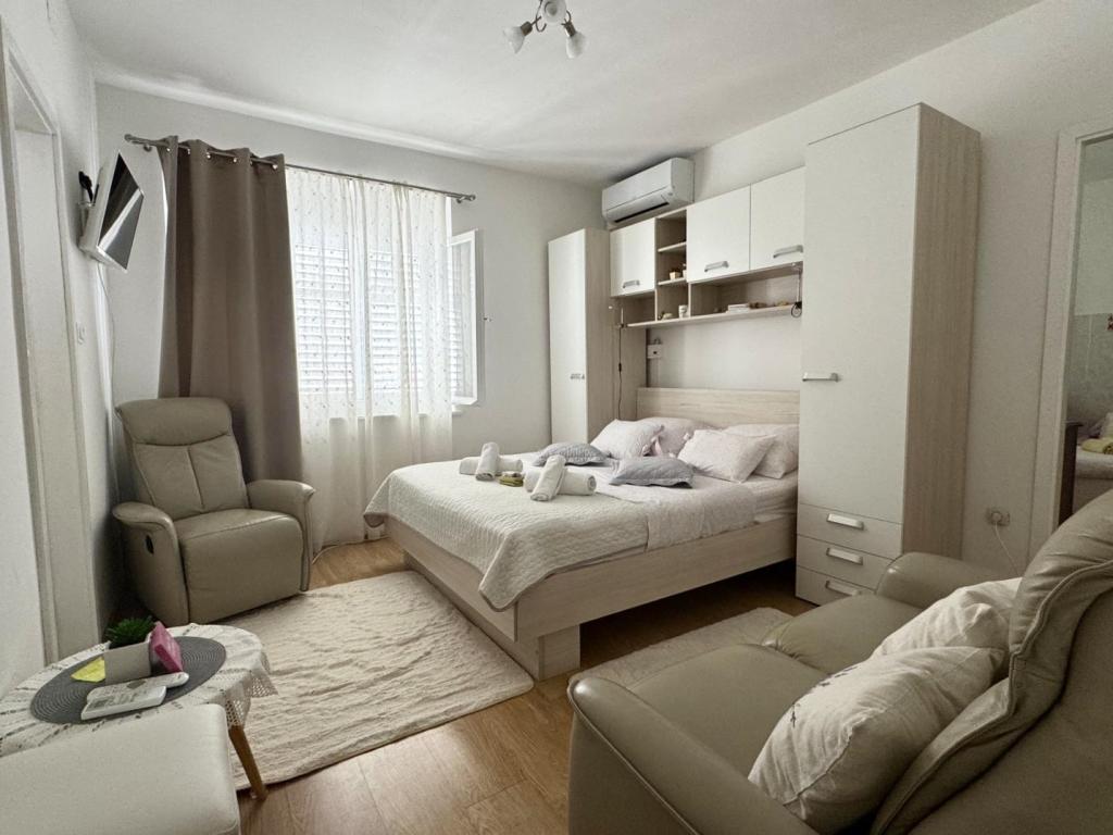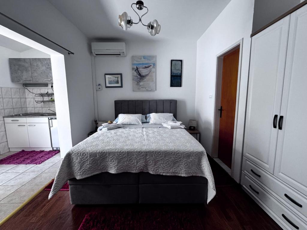Upřímně doporučuji toto místo pro rodiny s dětmi, páry nebo starší lidi, apartmán splnil všechna očekávání, čisté, pohodlné postele, pračka, plně vybavená 4 plotýnková kuchyně, klimatizace pouze 10 hodin denně, ale stačí, pračka, toustovač, velká lednice, klidné místo a krásný výhled, exotická poloha budovy u krásných palem, blízkost moře a pláže, která byla čistá a nepřelidněná - to bylo zjevení, a lehátka a deštníky v ceně pobytu jsou opravdu vzácné. Vedle je Sudenac a podnik s kebabem a hranolky, když vyjdete z budovy, všude podél moře a promenády jsou hospůdky, vedle je také pekárna a majitelé Leo a Anita se starají o to, aby bylo vše dobré. Hosté. I když jsme byli na celodenním výletě, prádlo nám před bouřkou sundali, aby nepromoklo, což bylo moc fajn. Doporučuji toto místo každému, kdo chce mít moře na dosah ruky, a dobrá cena a ne příliš přeplněné. Velkým plusem je také rovná plocha pro procházky s kočárkem a dětmi